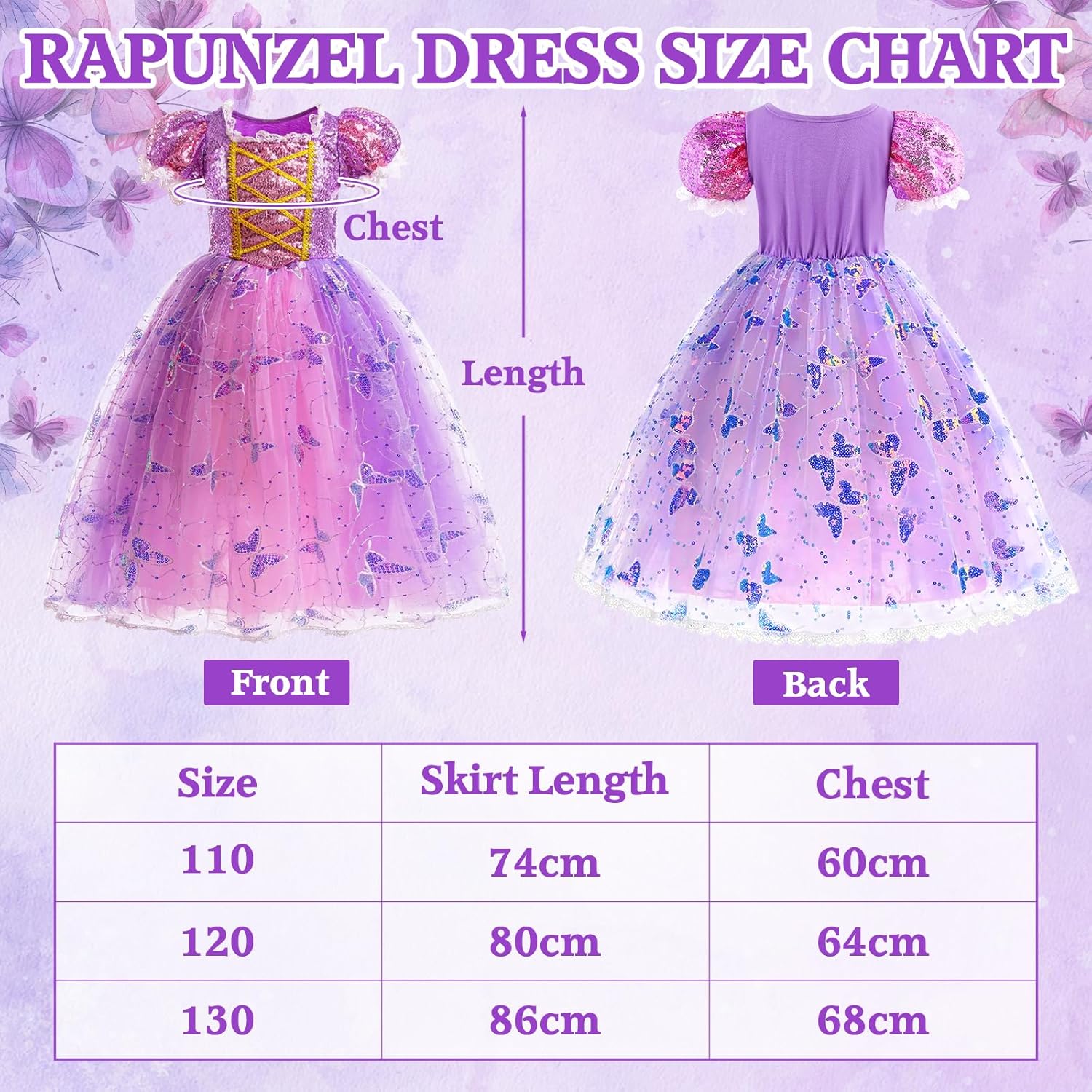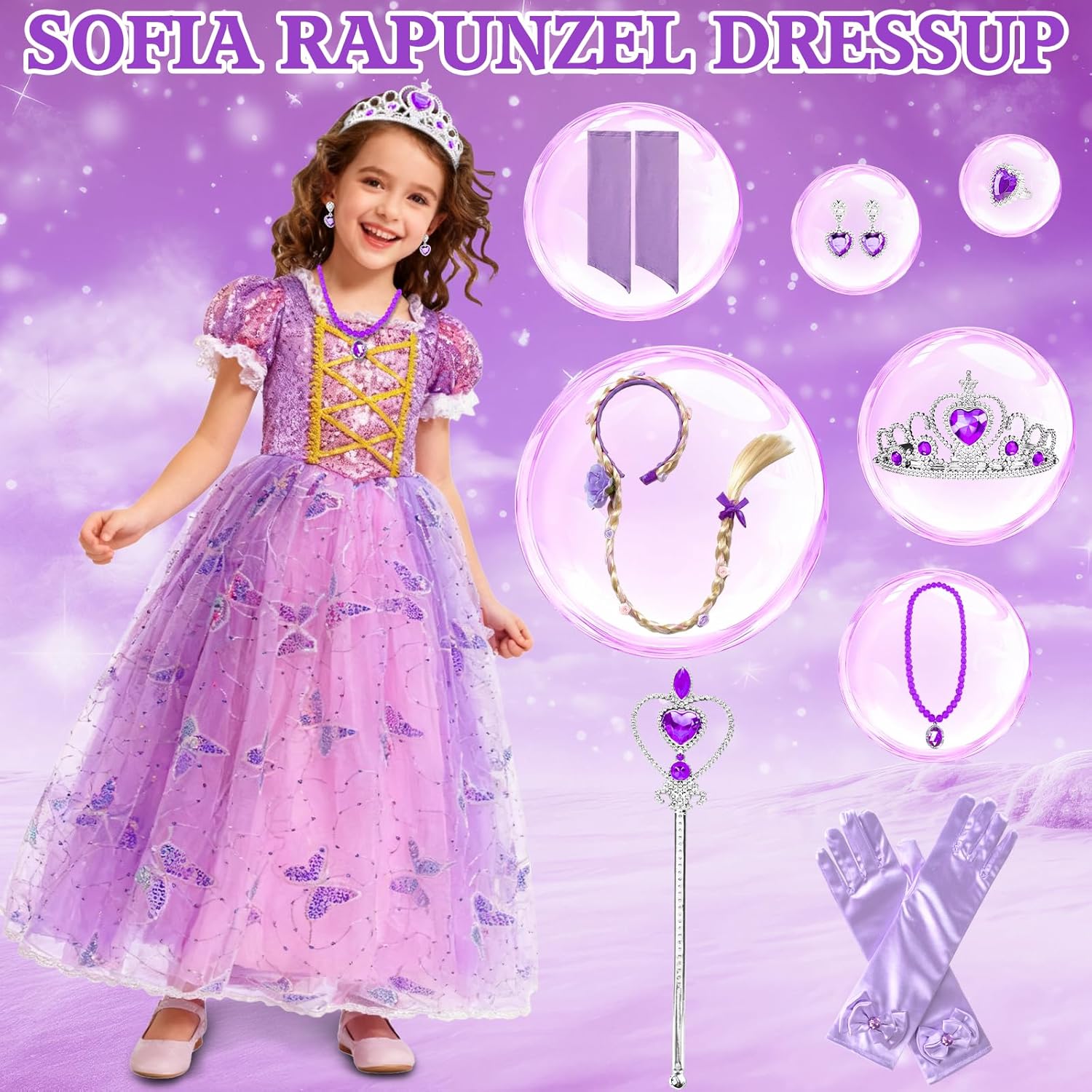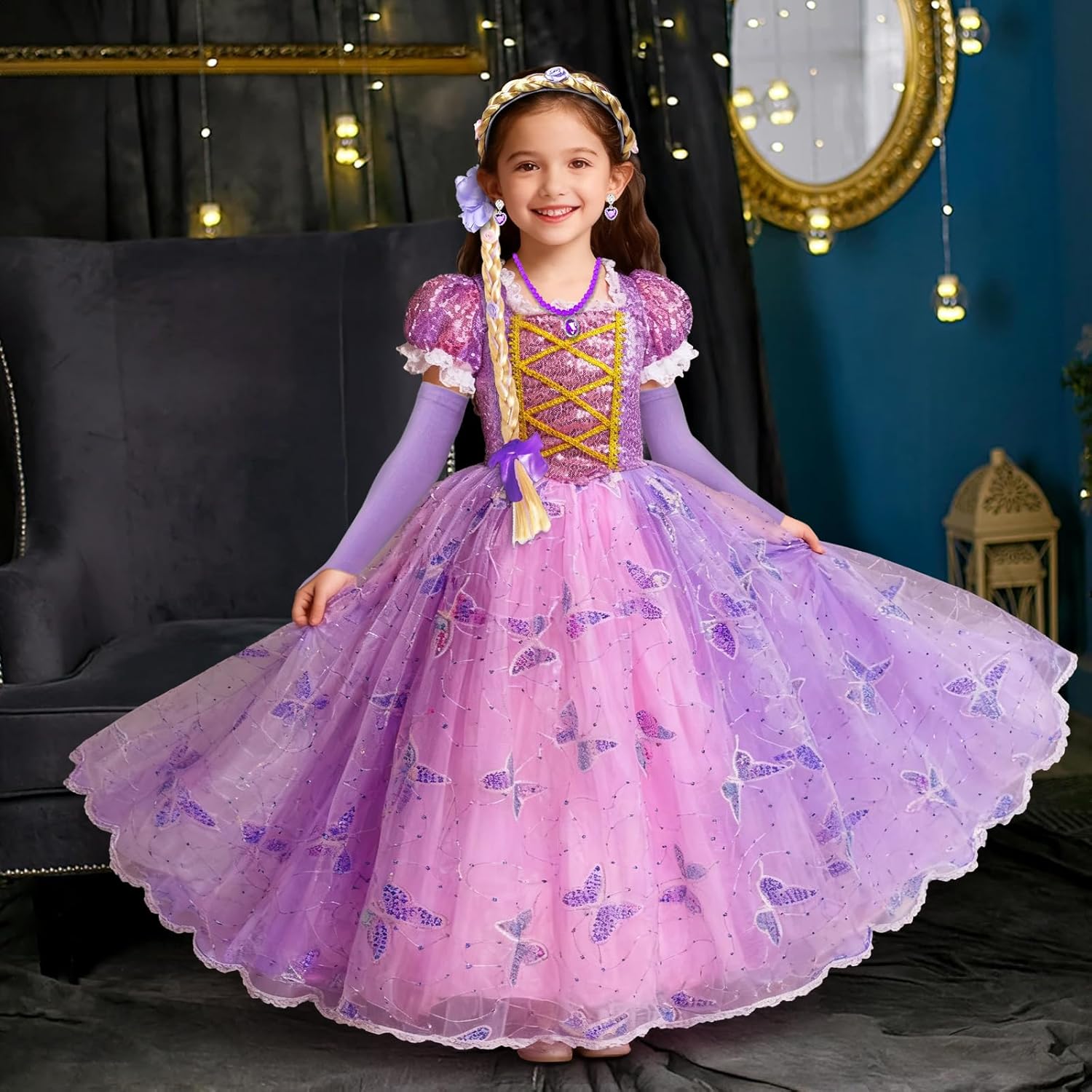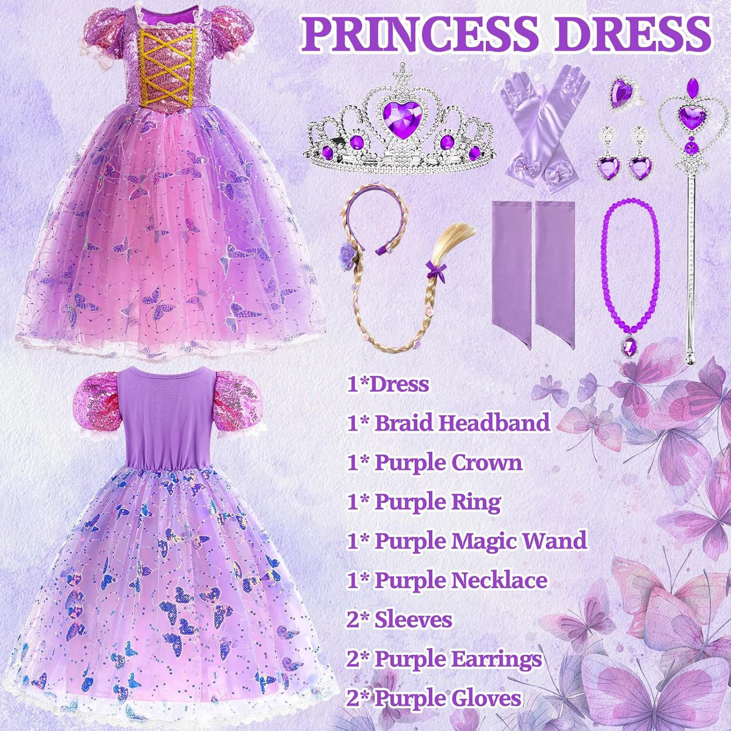 Descrizione prodotto MKAKYES --- Trasforma ogni bambina in una principessa con il nostro abito da principessa. Specifiche del prodotto Materiale: Poliestere, Plastica Il set include: costumi principessa, 1 paio di maniche, fascia per capelli intrecciata, corona principessa bambina, 1 paio di orecchini viola, anello viola, bacchetta magica viola, 1 paio di guanti viola, collana viola Descrizione del prodotto Questo vestito da principessa è realizzato in tulle di poliestere, un tessuto morbido e confortevole che protegge la pelle delicata. Questo vestito principessa in tulle con i capelli lunghi, con il suo design ispirato alle fiabe e la splendida fantasia a farfalla, trasformerà ogni bambina nella principessa più bella. Questo vestito rapunzel bambina è perfetto per feste in maschera, giochi di ruolo, feste di compleanno, balli di fine anno, Halloween, Pasqua e Natale. Consigli utili Si prega di controllare attentamente la tabella delle taglie prima di ordinare. A causa della misurazione manuale, potrebbe esserci una discrepanza di 1-3 cm. Il colore effettivo del prodotto potrebbe variare leggermente dall'immagine del sito web a causa di vari fattori, tra cui la luminosità e l'illuminazione dello schermo. Avvertenza di sicurezza Non adatto a bambini di età inferiore a 3 anni. Utilizzare sotto la supervisione di un adulto. Avviso di sicurezza Non adatto a bambini di età inferiore a 3 anni
