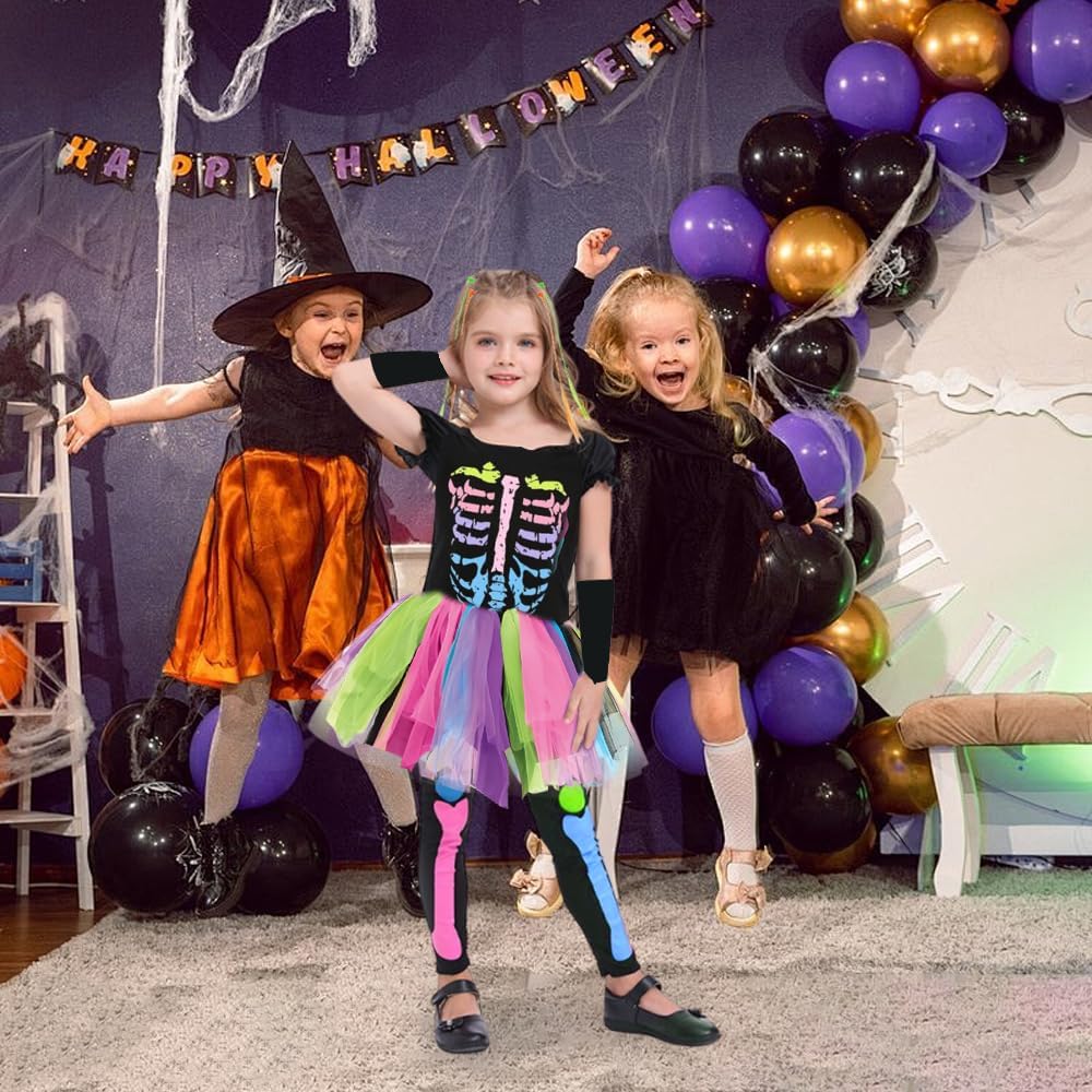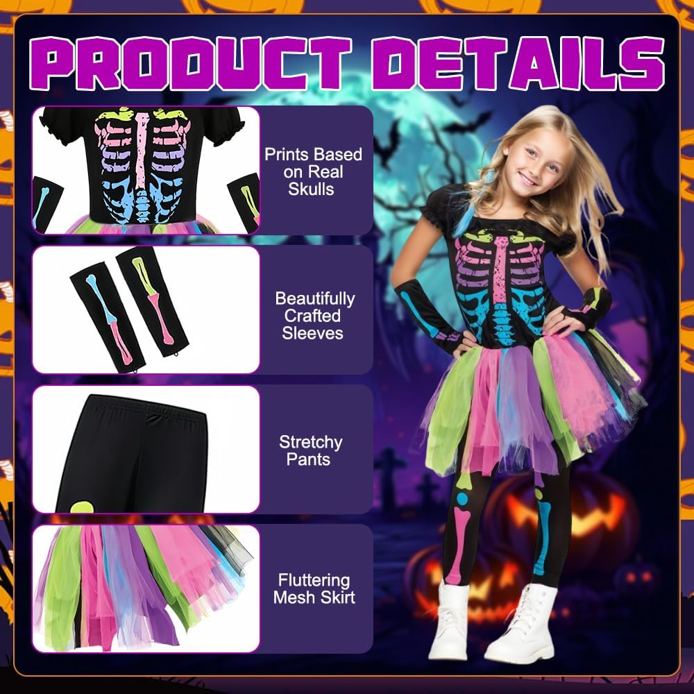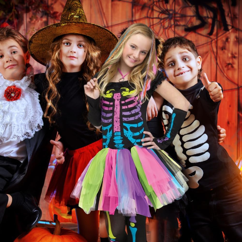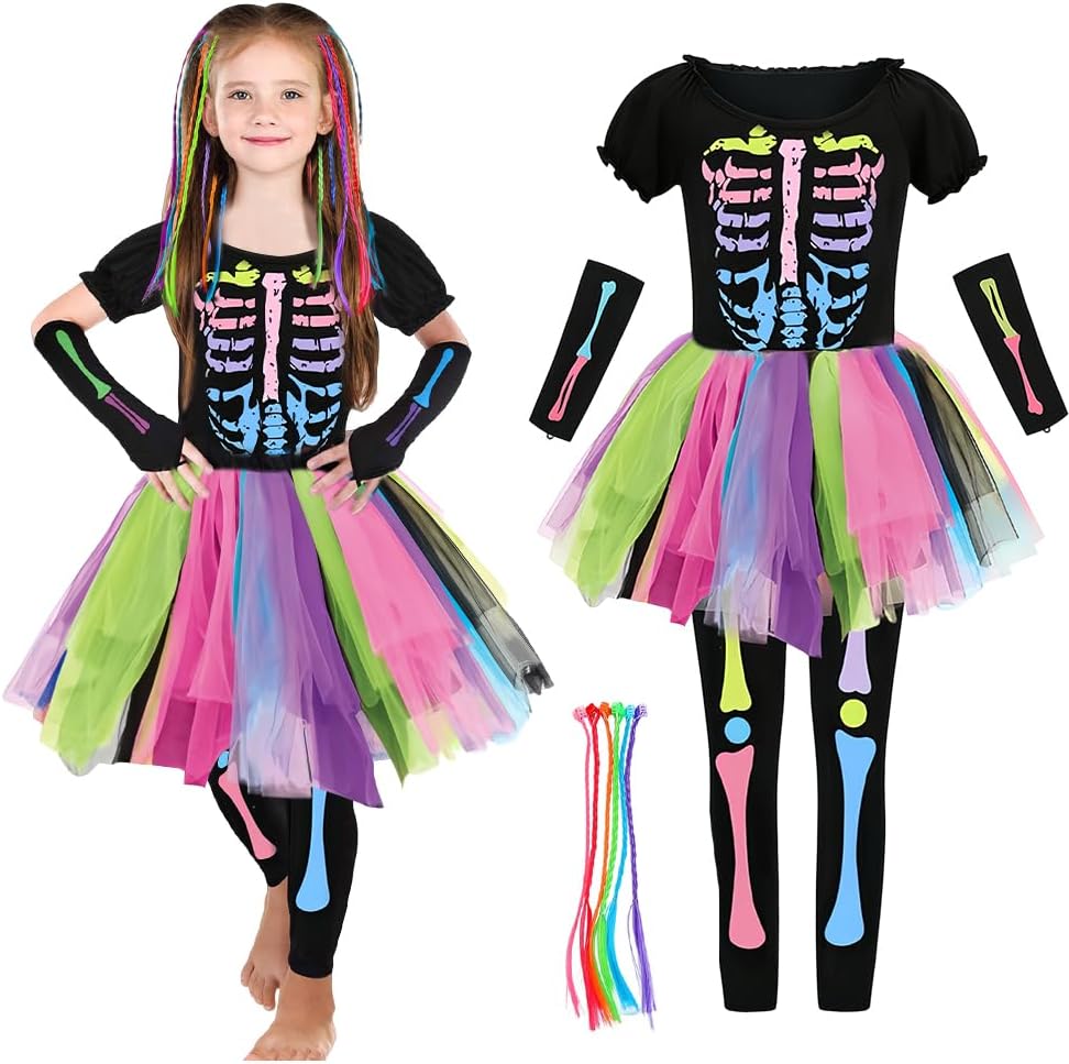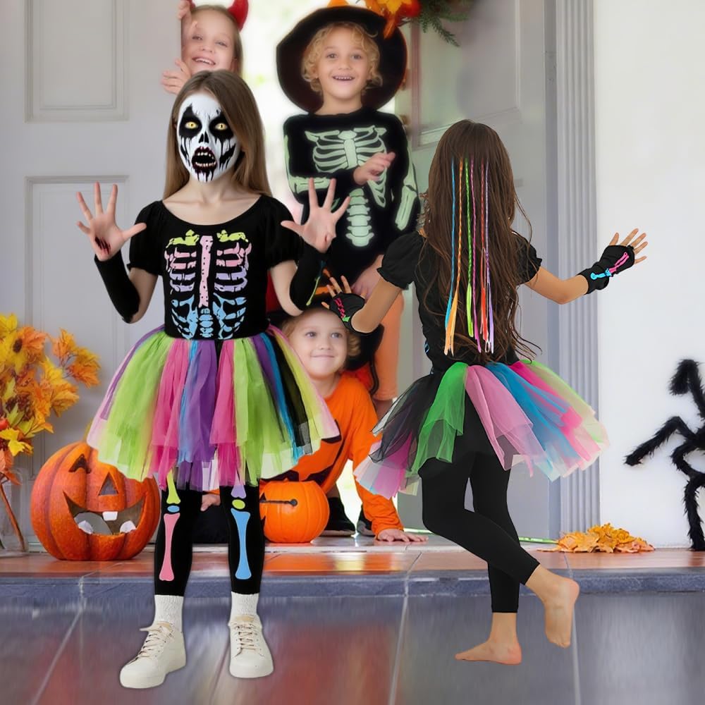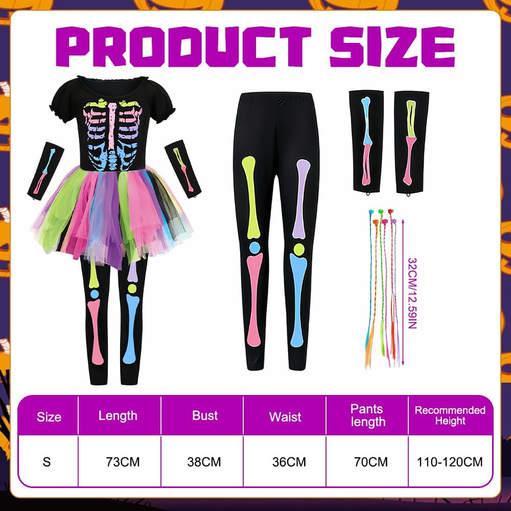 Specifiche tecniche: Nome: Costume scheletro per bambina Materiale: poliestere. Colore: Colorato Taglia: M (120-130 cm) Trecce: Colori casuali Contenuto della confezione: 1 Halloween Vestito scheletro Costume Ragazze 1 paio di pantaloni 1 paio di maniche 6 Trecce