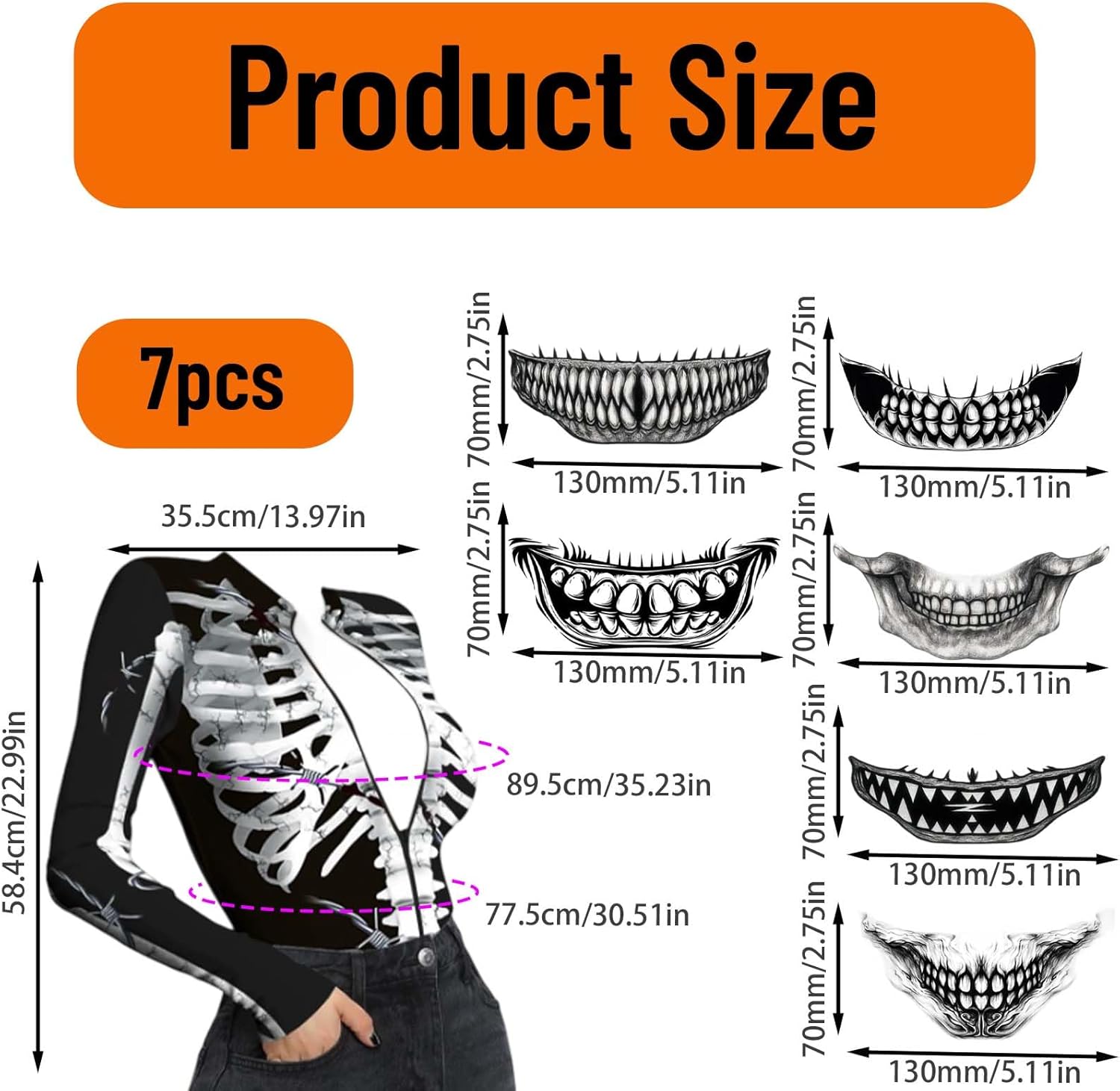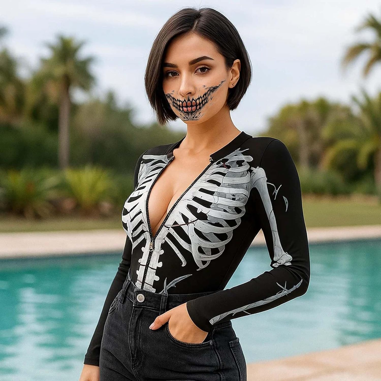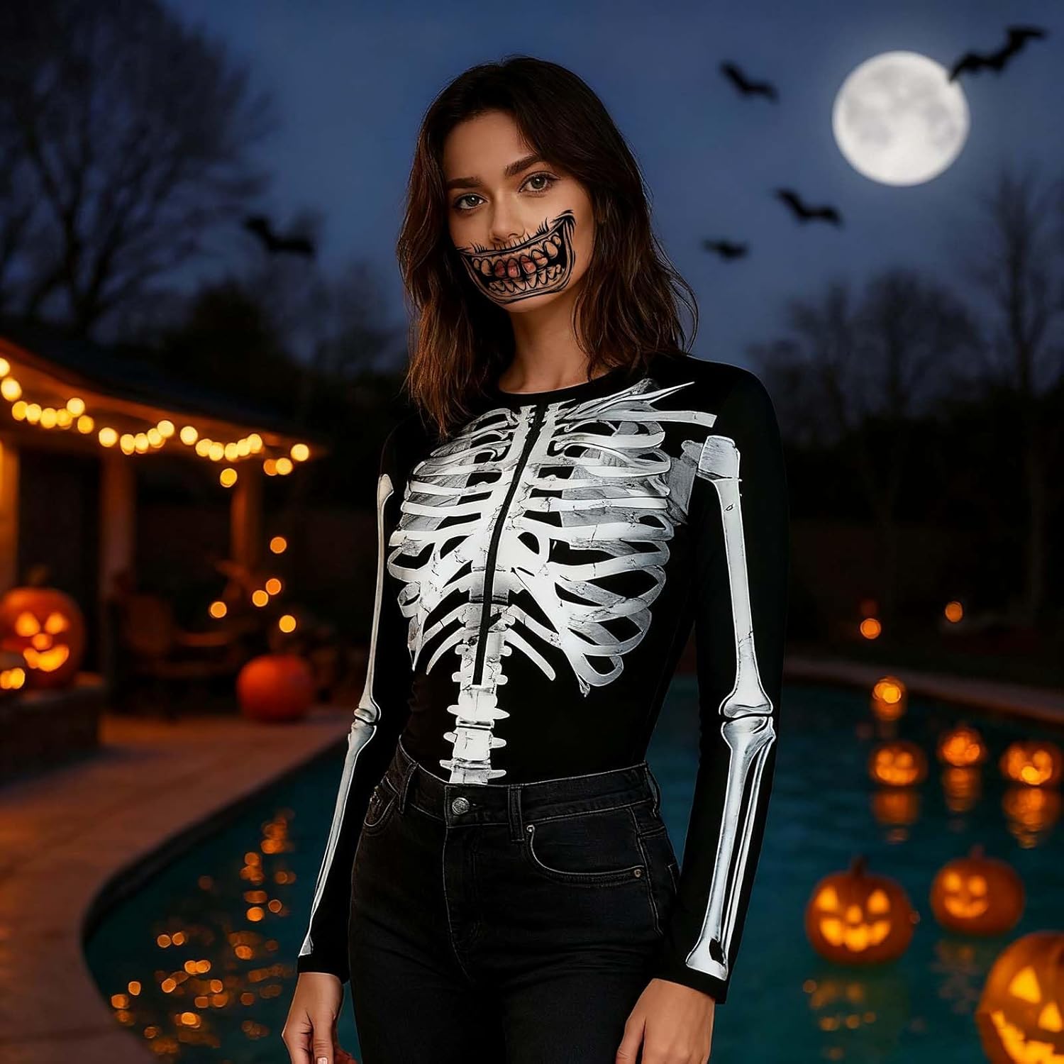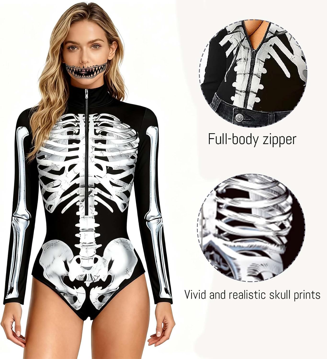 Descrizione prodotto Trasformati ad Halloween in una bella figura spaventosa con il nostro costume da scheletro da donna di Halloween in taglia XL (circonferenza torace: 89,5 cm/vita: 77,5 cm/lunghezza manica: 58,4 cm/larghezza spalle: 35,5 cm). Il set include un body elastico e confortevole con stampa scheletrica realistica e 6 fogli di tatuaggi temporanei per il viso che completano perfettamente il tuo outfit. Il design della tuta sottolinea la figura femminile ed è comodo da indossare grazie alla sua lavorazione di alta qualità. I tatuaggi sono facili da applicare e rimuovere, sono delicati sulla pelle e possono essere combinati in modo creativo con il trucco. Che si tratti di zombie, vampiro o scheletro, decidi il tuo stile. Il set è ideale per feste di Halloween, carnevale, cosplay, eventi a tema horror o la notte dei morti. Avviso di sicurezza No