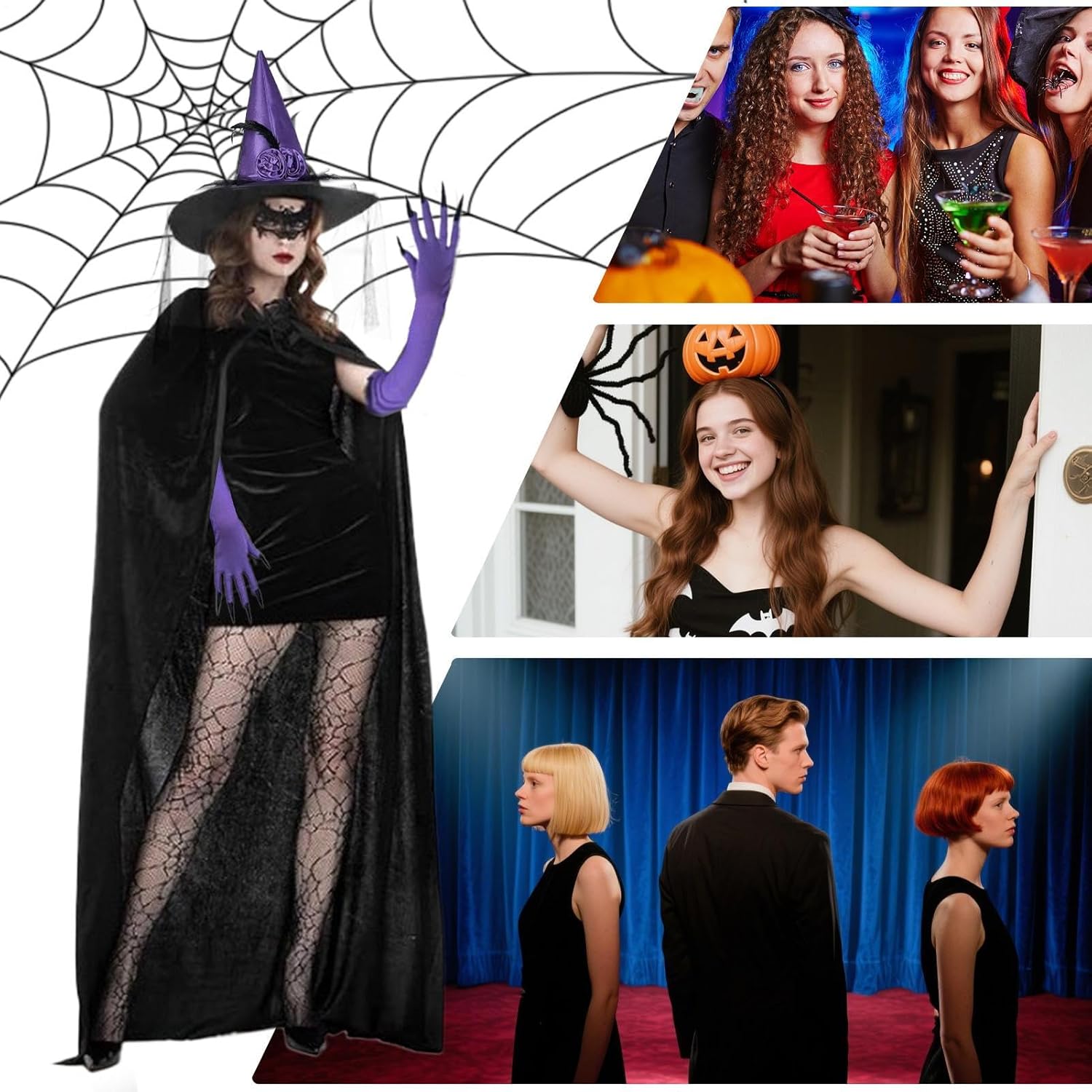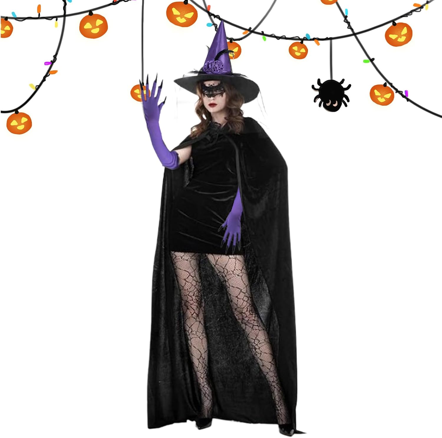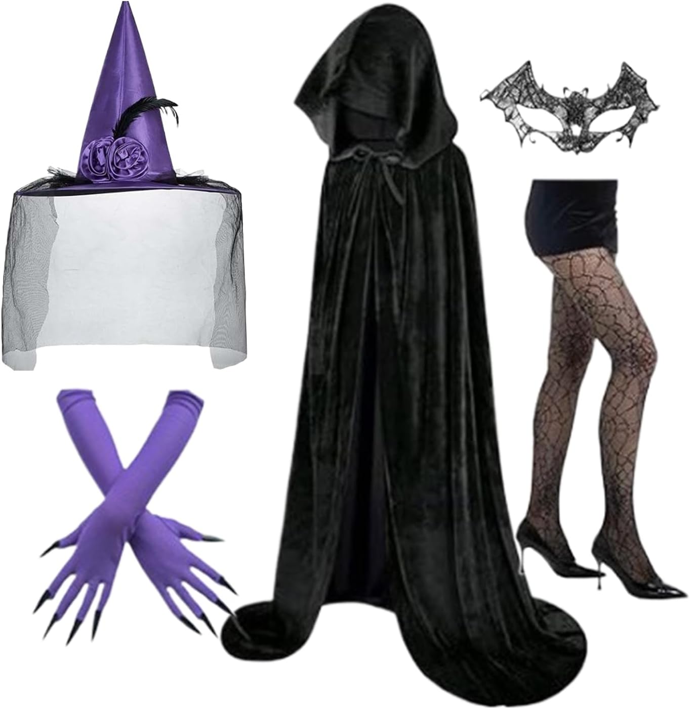 Migliora il tuo abbigliamento a tema con questo set di costumi da strega da donna, con mantello, cappello, guanti, maschera in pizzo e calze. Adatto per Halloween, giochi di ruolo e cosplay, si abbina anche a festival rinascimentali, eventi steampunk, feste di festival, matrimoni gotici, concerti, balli e spettacoli teatrali. Ottieni un look incantevole con questo elegante ensemble. Materiale: poliestere. Lunghezza del mantello: 140 cm (escluso il cappuccio). Peso: circa 240 g. Nota: Il colore dell'articolo potrebbe differire leggermente da quello riportato nell'immagine. A causa della misurazione manuale, si prega di consentire una differenza di 1-2 cm nelle dimensioni. Contenuto della confezione: 1 mantello con cappuccio. 1 cappello. 1 guanto. 1* copertura del viso del pizzo 1 paio di calzini in pizzo