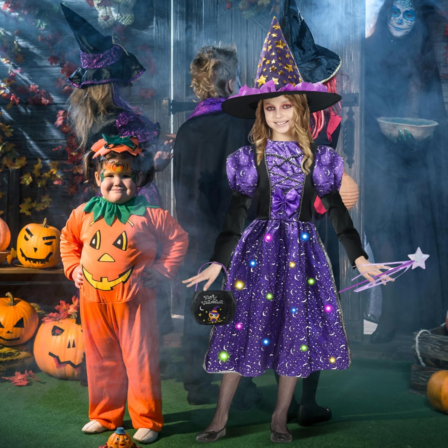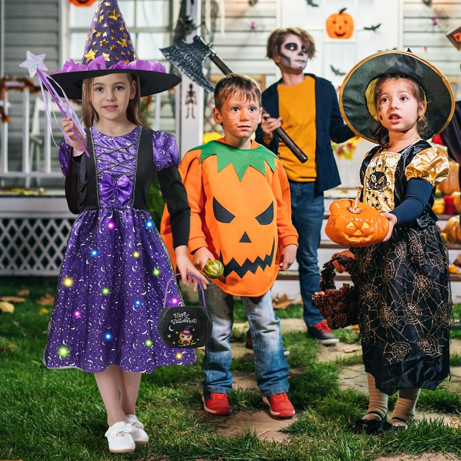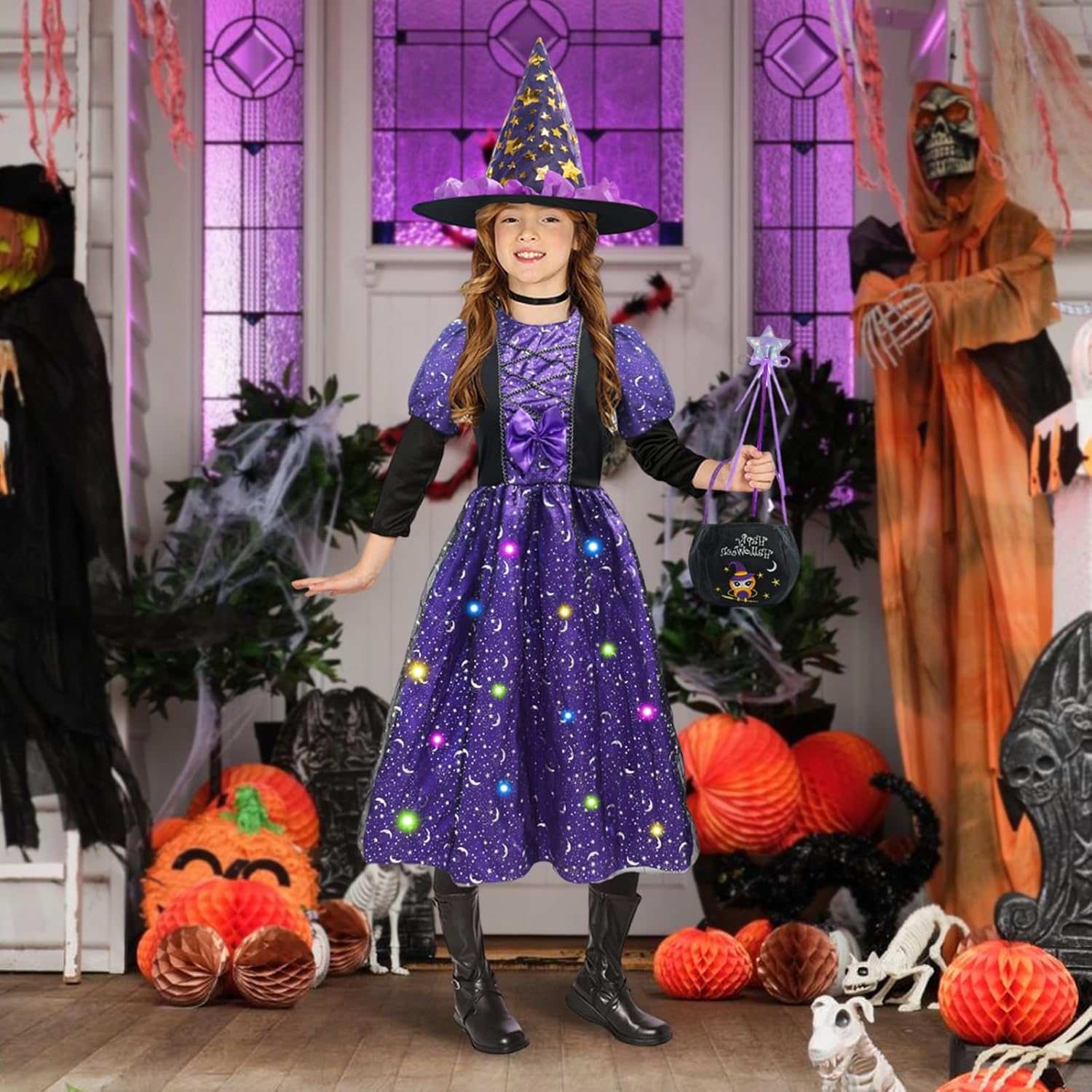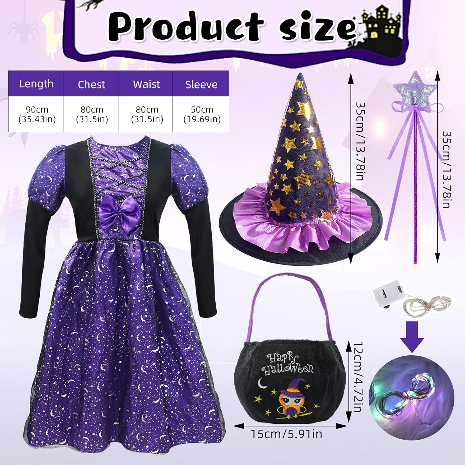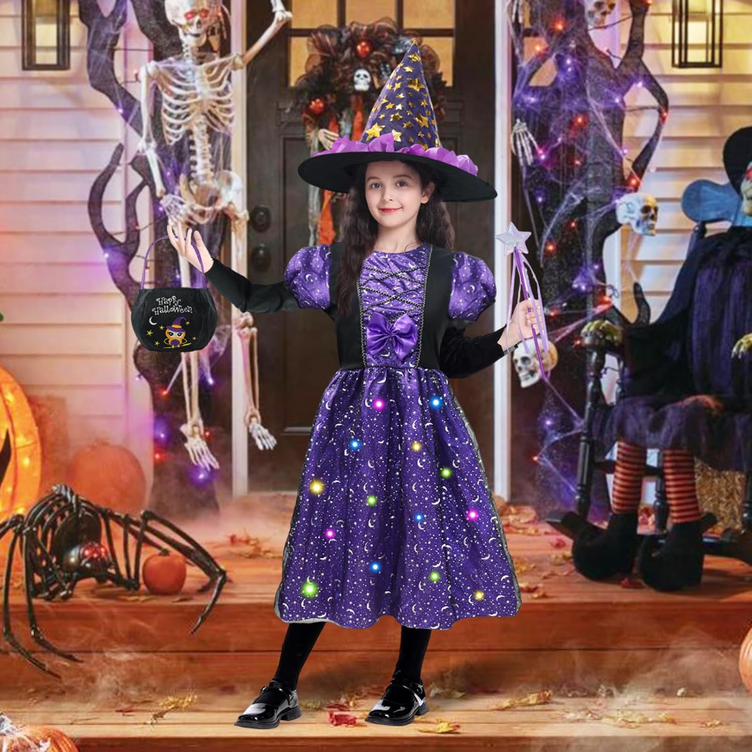 Descrizione prodotto Questo splendido costume da strega da 4 pezzi è appositamente progettato per le ragazze. Mette le piccole portatrici direttamente nel magico mondo delle streghe. Il punto forte del set è l'abito da strega a LED, dotato di luci lampeggianti e crea un'atmosfera affascinante. Insieme ad altri accessori, offre un aspetto strega completamente autentico. Caratteristiche del prodotto: --- La sottogonna del nostro costume da strega per bambine è dotata di bellissime luci a LED che rendono il vostro bambino più accattivante nel buio della notte. Le luci a LED sono alimentate a batterie, ma non sono incluse nella confezione. --- Questo costume da strega è adatto non solo per Halloween, ma anche per feste in costume, carnevale o spettacoli teatrali. Tua figlia può indossarlo in ogni occasione e inventarsi una strega. È un ottimo regalo che farà piacere e ore di divertimento. --- Il costume è realizzato in materiale morbido e confortevole, piacevole sulla pelle. Le cuciture sono solide e durevoli, quindi il costume non si danneggia facilmente anche con un uso intensivo. Le luci a LED sono installate in modo sicuro e funzionano in modo affidabile. Specifiche: - Taglie: Disponibile in diverse misure per soddisfare le esigenze delle diverse età delle ragazze. - Colore: l'abito da strega è in un viola intenso, una tonalità classica per le streghe, mentre anche il cappello, la bacchetta magica e la borsa sono armoniosamente realizzati in questa combinazione di colori. - Batterie LED: le luci a LED nel vestito sono alimentate da batterie. Le batterie sono facilmente sostituibili. Precauzioni - Pulizia: si prega di pulire il costume secondo le istruzioni di lavaggio. Evitare di lavare il vestito da strega a LED in lavatrice per non danneggiare i componenti LED. Contenuto della confezione: - 1 vestito da strega LED in colore viola. - 1 cappello da strega. - 1 bacchetta magica. - 1 sacchetto per borsa. Avviso di sicurezza No