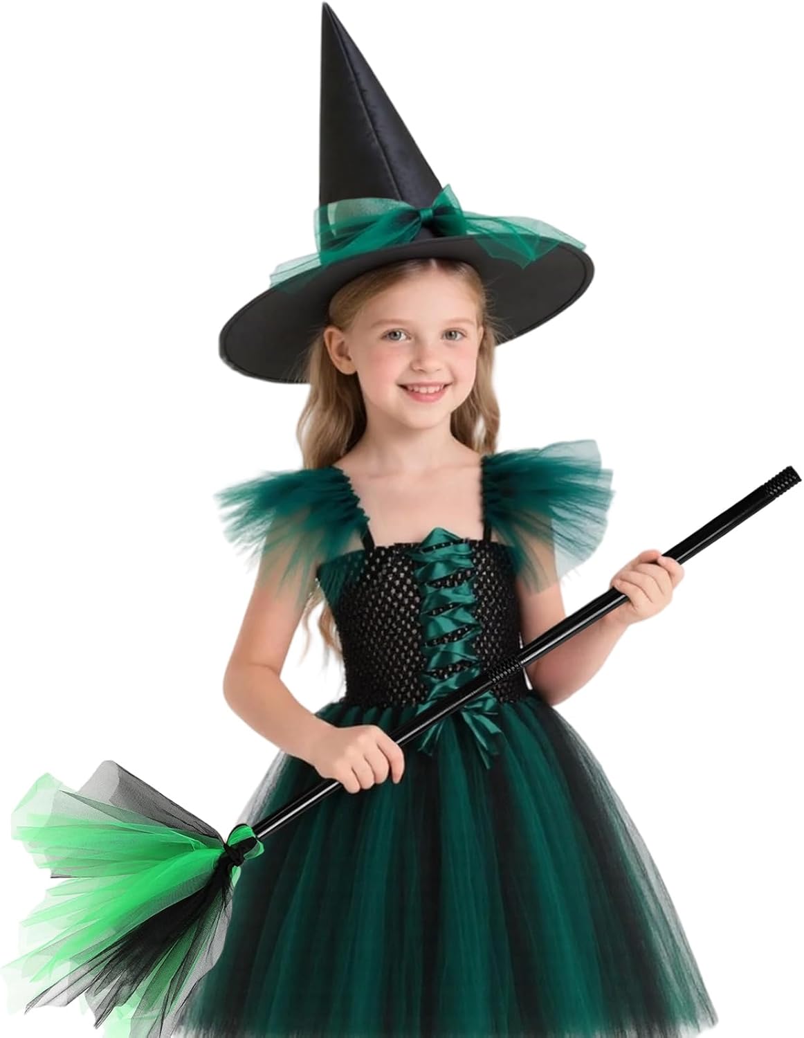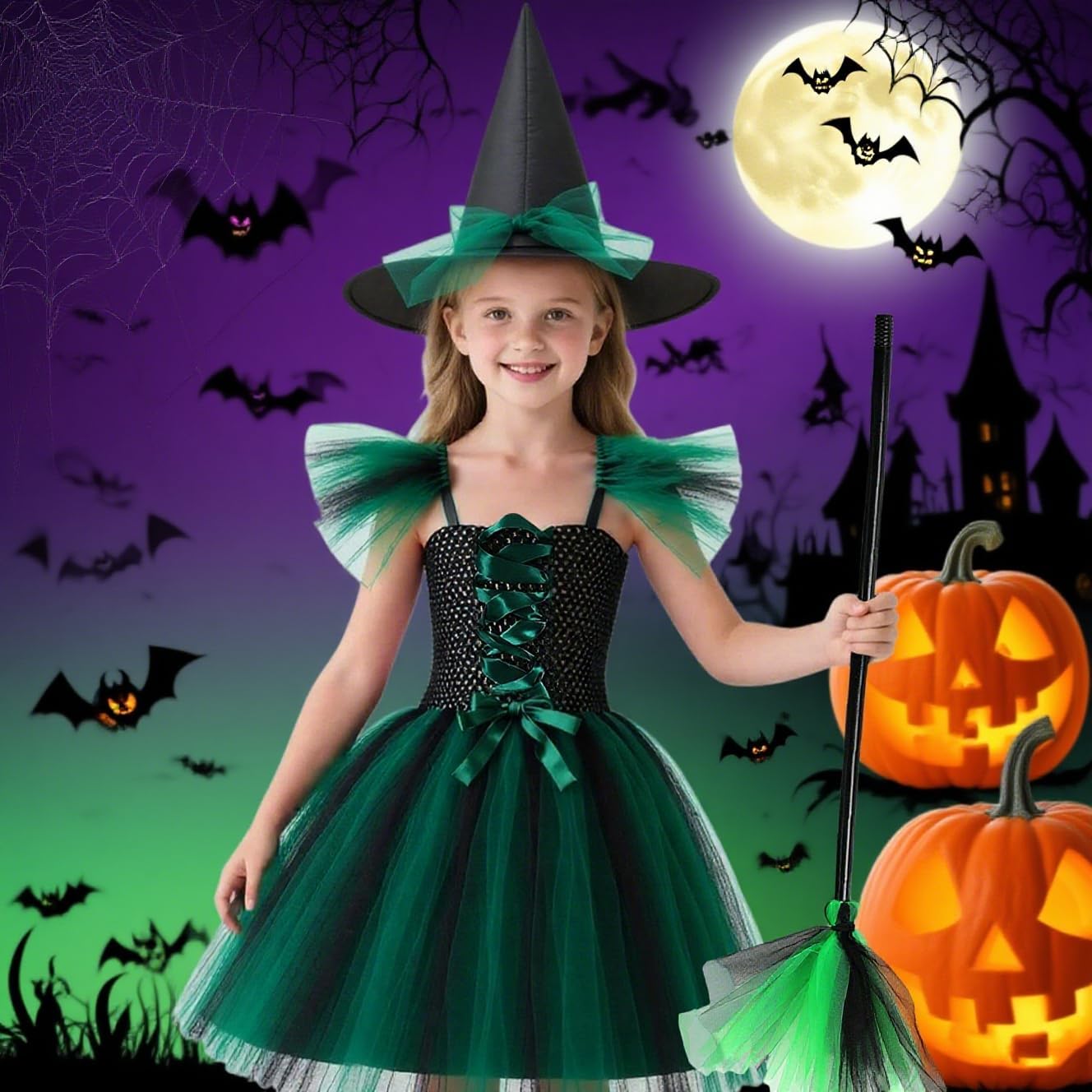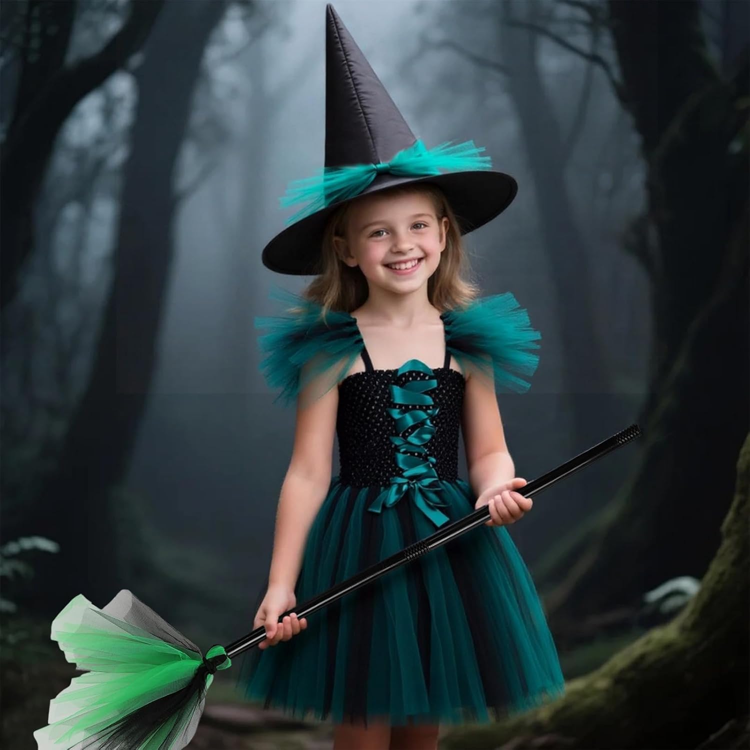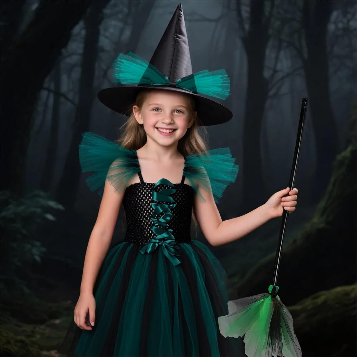 Costume da Strega per Bambini Halloween Vestito da Vampiro Costumi Ragazze Viola Abito in Tulle Cappello Manico di Scopa Festa in Maschera Vestire Dress Up Cosplay