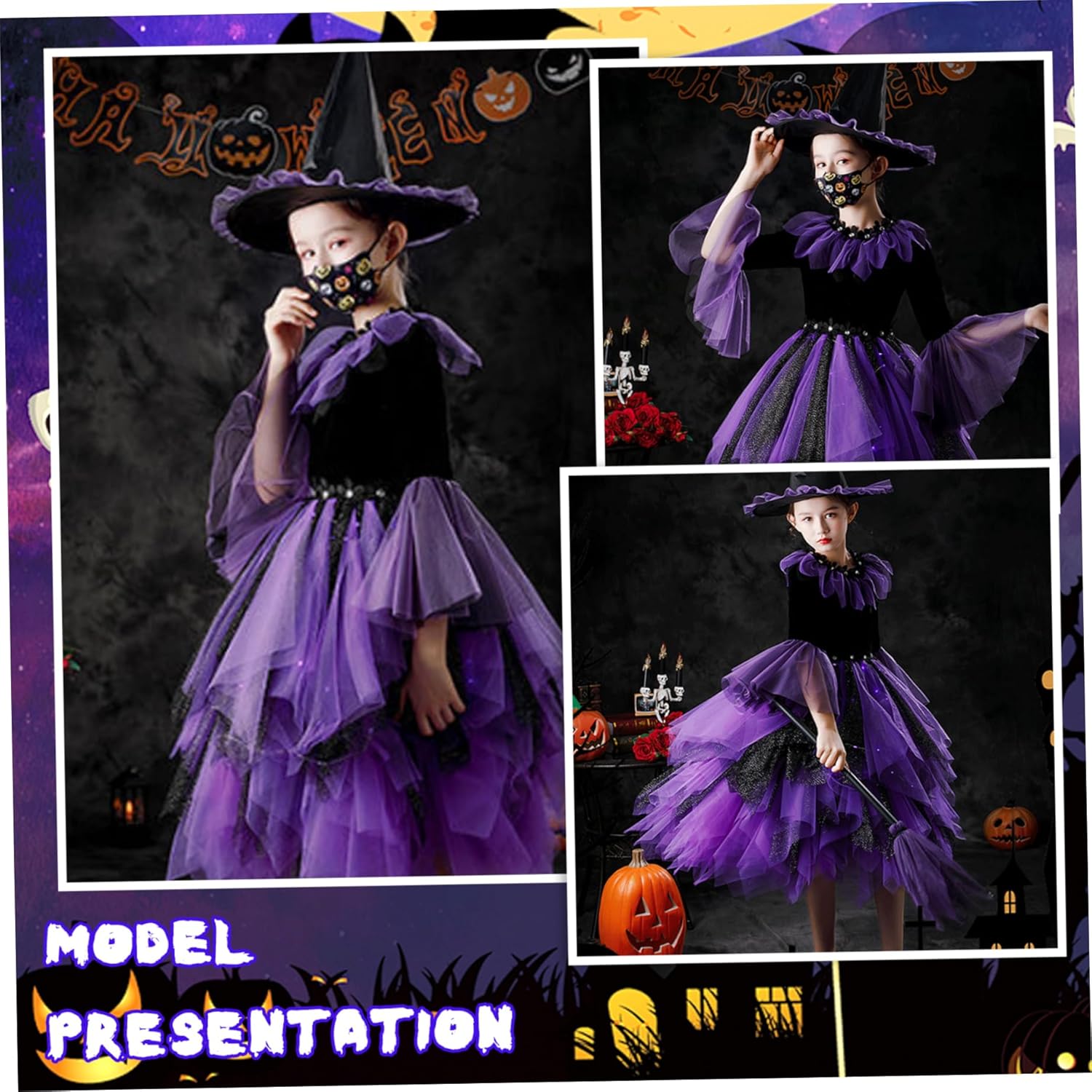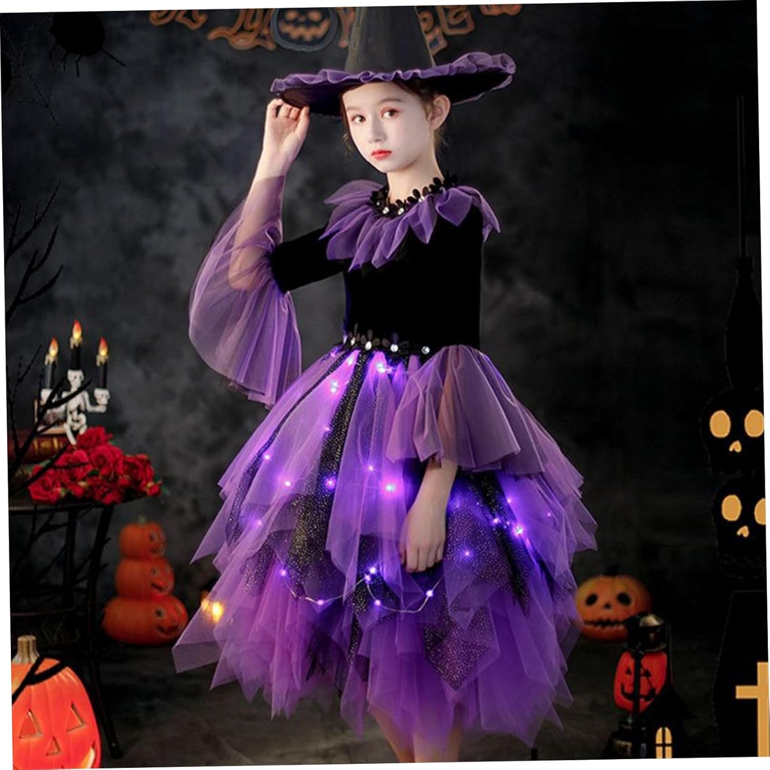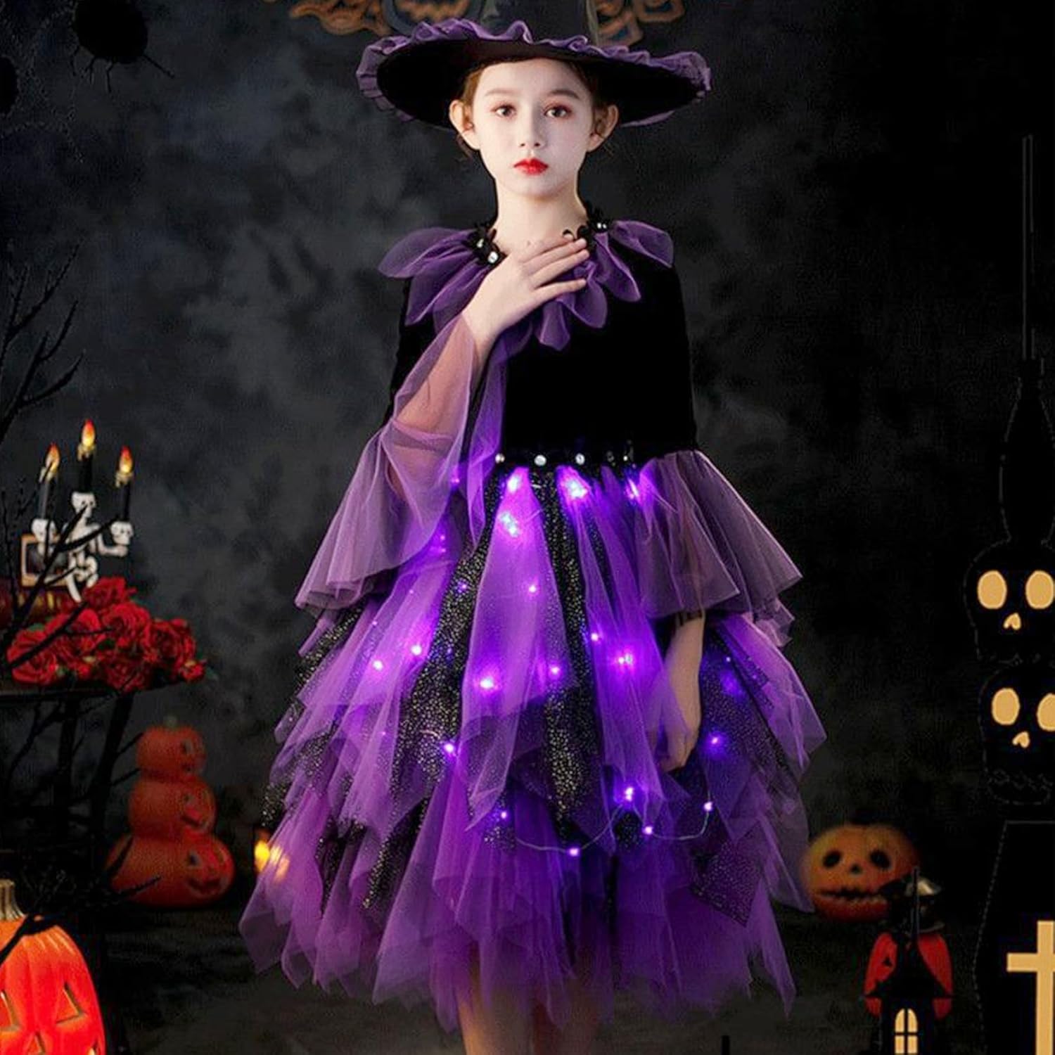 Description: Toddler Witch Costume, Witch Costume for Girls Includes Light up Puffy Tulle Dress with LED String, Hat and Tote Bag for Halloween Cosplay Party Dress Up is a perfect Halloween dress featuring a magical light-up puffy tulle dress that brightens up the night with integrated LED lights, combined with a classic witch hat and a convenient tote bag for carrying treats or party.Essenziali, realizzati con materiali morbidi, confortevoli e traspiranti per mantenere la tua bambina accogliente e sicura, questo versatile costume da strega offre un aspetto incantevole ideale per eventi di Halloween, feste e occasioni giocose di travestimento, mentre la costruzione garantisce un uso duraturo, rendendolo una scelta affascinante e pratica per celebrazioni festive e momenti di foto memorabili.. FAINS:.. -Color: viola.. -materiale: poliestere.. -Mize: altezza adatta 130, 140, 150 cm.. NOTA: Misurazione manuale, consentire lievi errori sulla dimensione.. I colori possono esistere una leggera differenza a causa di schermi diversi.. pacchetto incluso 1 set * costume da strega per bambini
