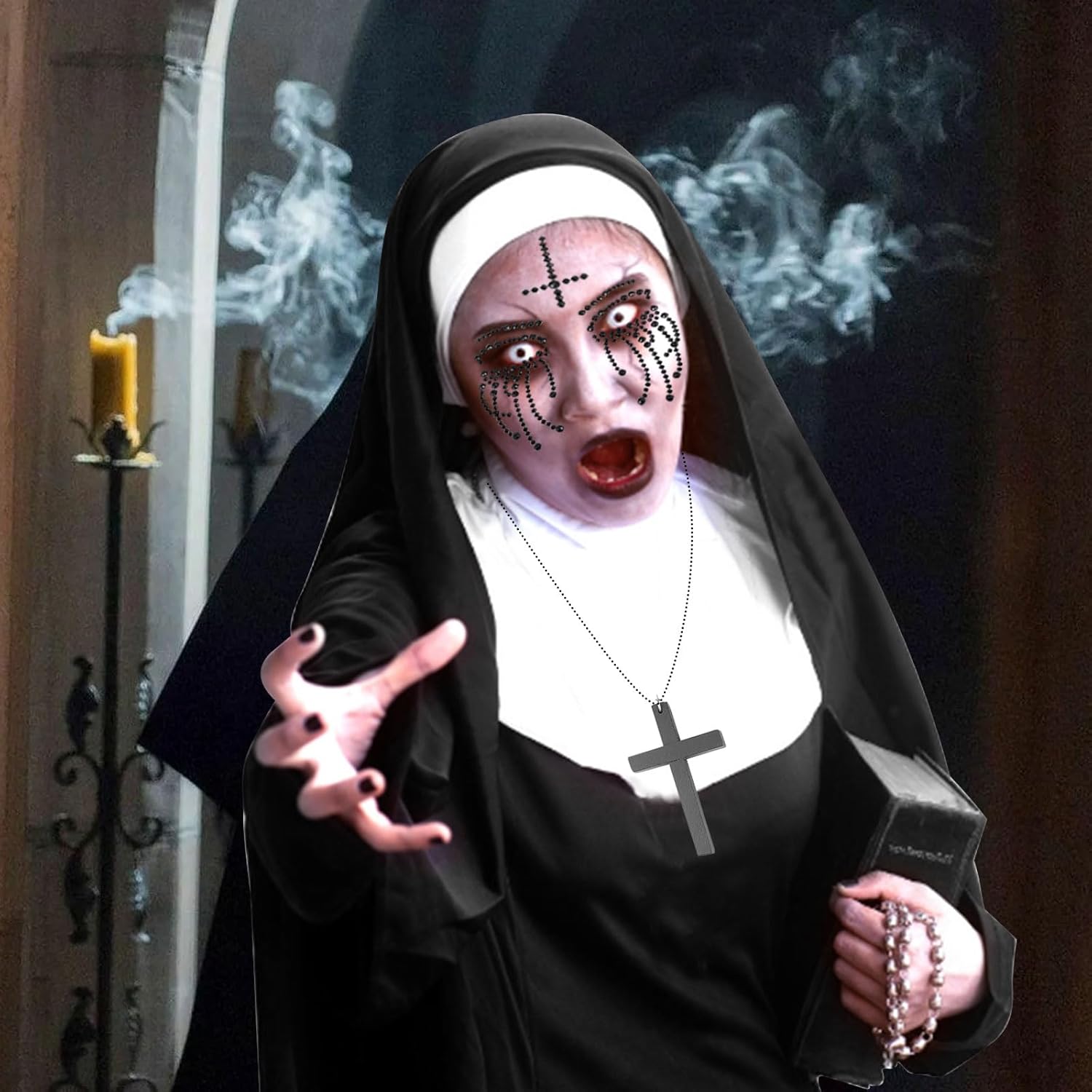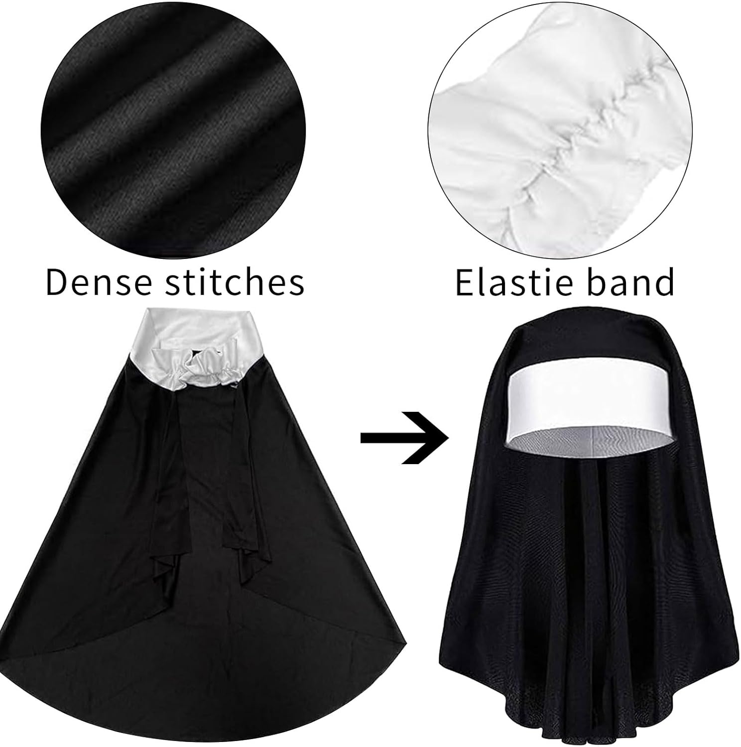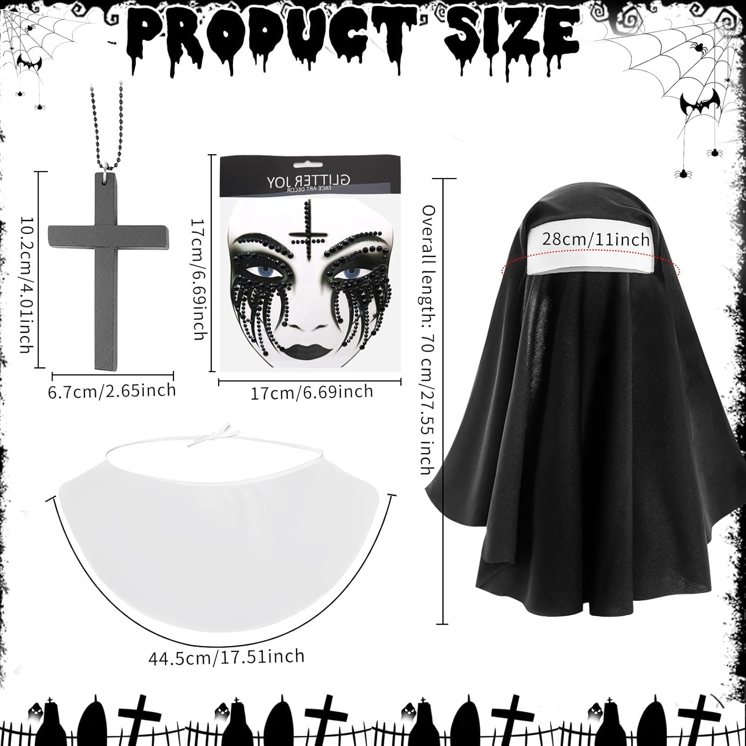 Descrizione prodotto Costume da suora da donna, costume per monache, copricapo, cappello da suora, collare per Halloween, cerchietto per capelli, collana in legno, collana a croce per Halloween, tatuaggio, strass per il viso, Halloween, costume di carnevale Il set cosplay da suore è adatto per la maggior parte delle persone e garantisce una vestibilità comoda e regolabile per una vasta gamma di persone. Specifiche: Colore: nero, bianco. Materiale: tessuto di alta qualità. Dimensioni: come mostrato nelle immagini. La confezione include: 1 x colletto 1 collana in legno con croce. 1 copricapo per suore. 1 tatuaggio di Halloween con strass sul viso. Nota: 1. Si prega di verificare le dimensioni prima dell'acquisto. 2. I colori possono variare leggermente a causa delle diverse impostazioni dello Avviso di sicurezza No