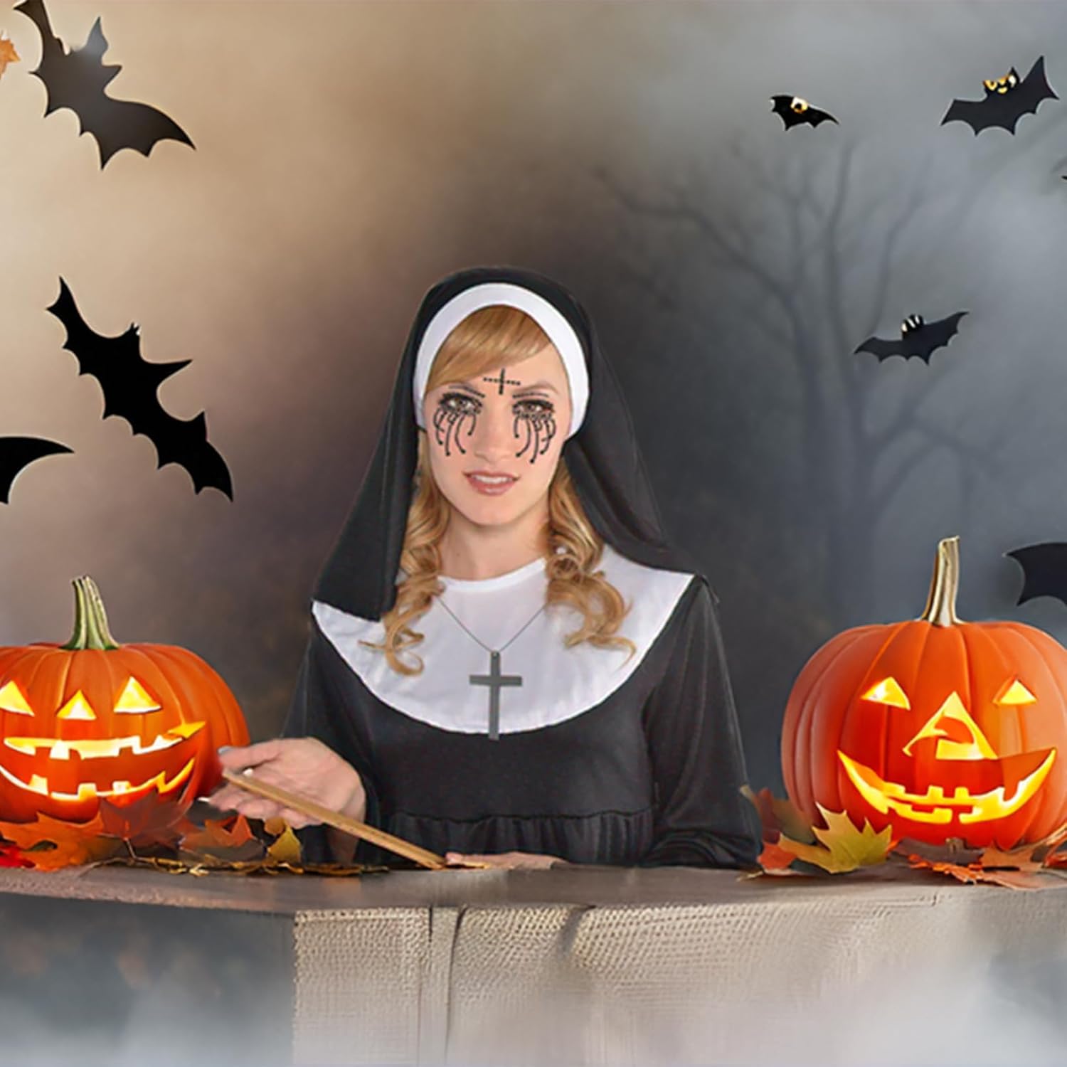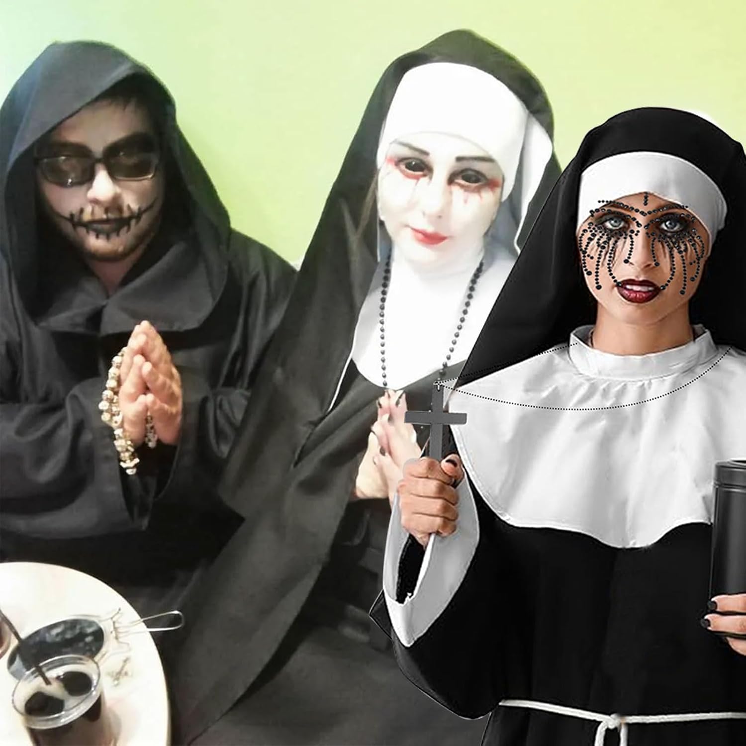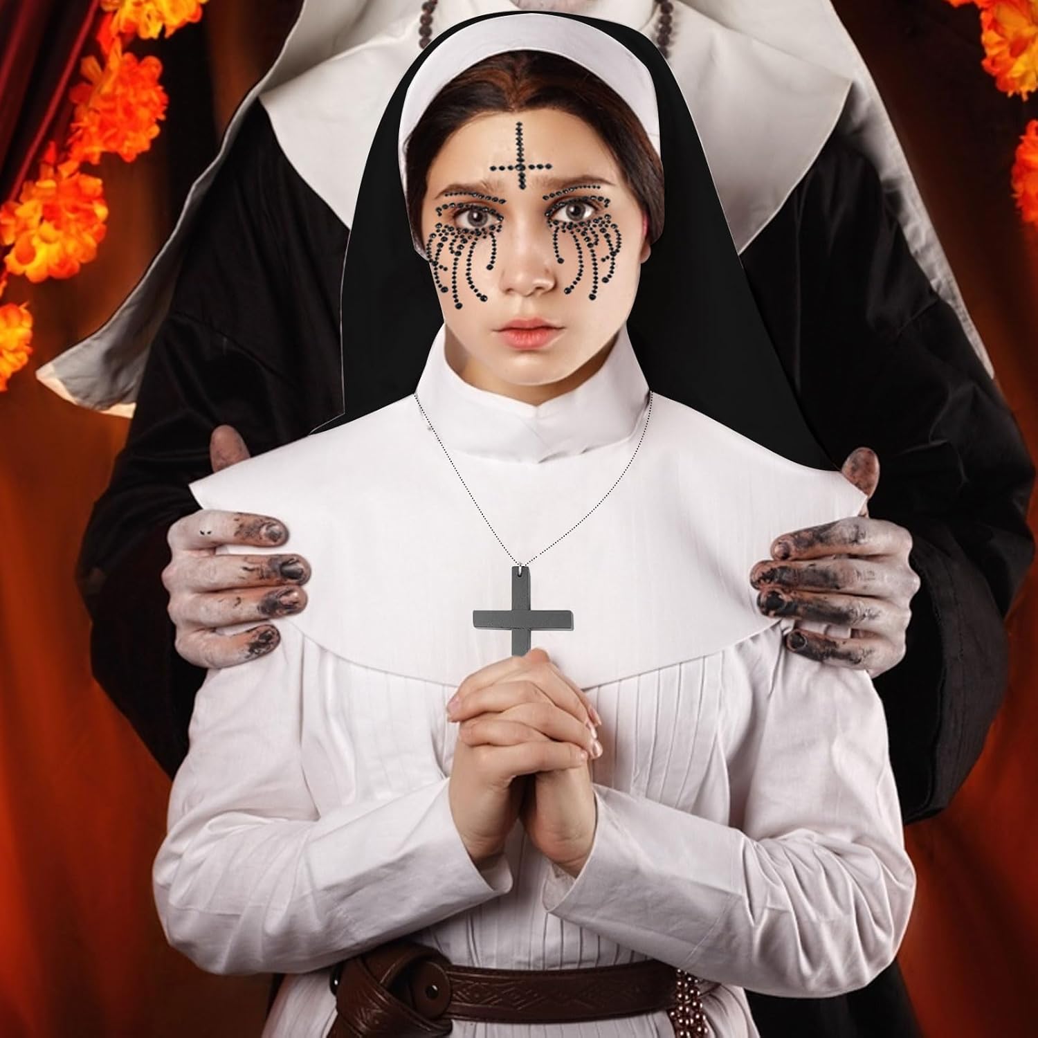 Descrizione prodotto Costume da suora da donna, costume per monache, copricapo, cappello da suora, collare per Halloween, cerchietto per capelli, collana in legno, collana a croce per Halloween, tatuaggio, strass per il viso, Halloween, costume di carnevale Il set cosplay da suore è adatto per la maggior parte delle persone e garantisce una vestibilità comoda e regolabile per una vasta gamma di persone. Specifiche: Colore: nero, bianco. Materiale: tessuto di alta qualità. Dimensioni: come mostrato nelle immagini. La confezione include: 1 x colletto 1 collana in legno con croce. 1 copricapo per suore. 1 tatuaggio di Halloween con strass sul viso. Nota: 1. Si prega di verificare le dimensioni prima dell'acquisto. 2. I colori possono variare leggermente a causa delle diverse impostazioni dello Avviso di sicurezza No