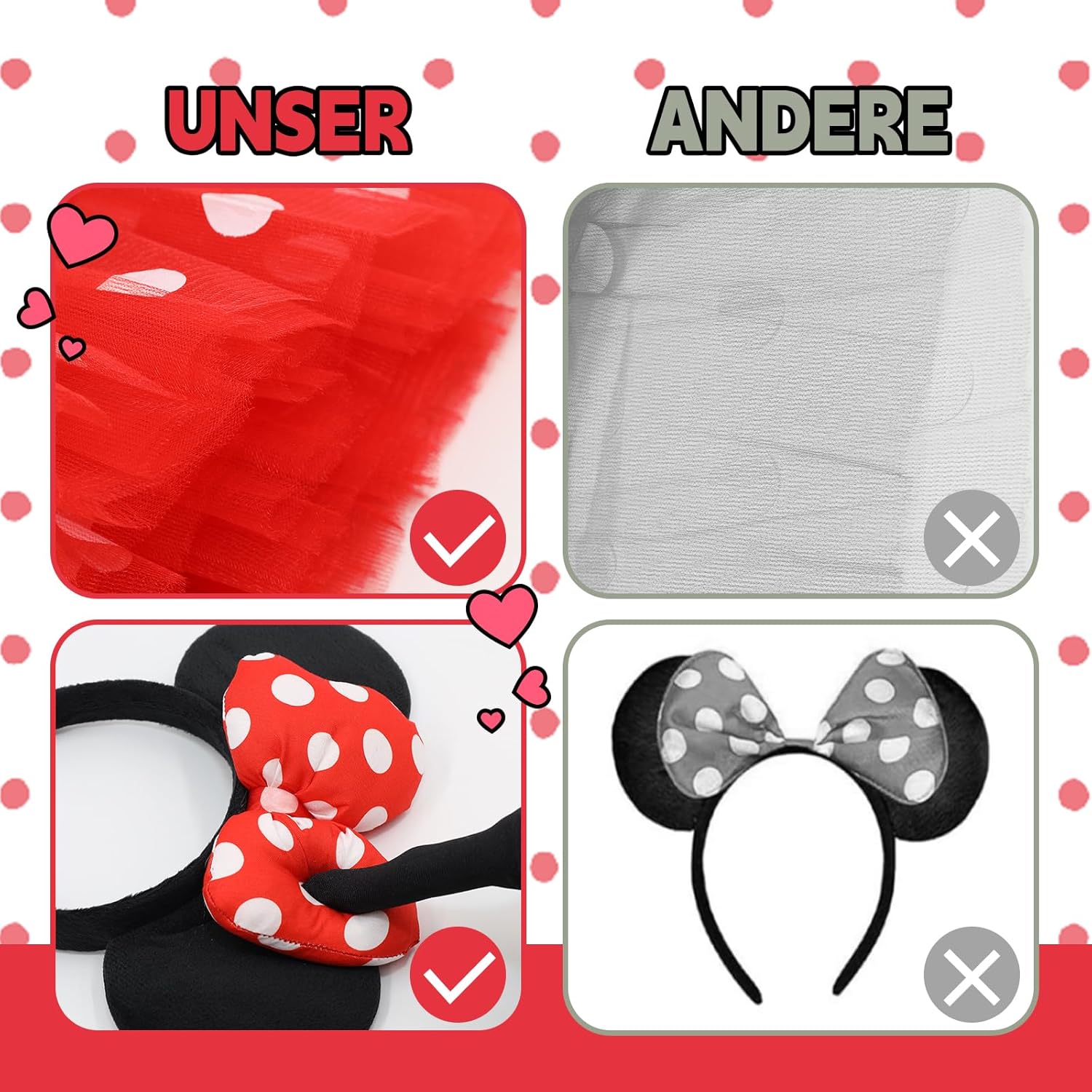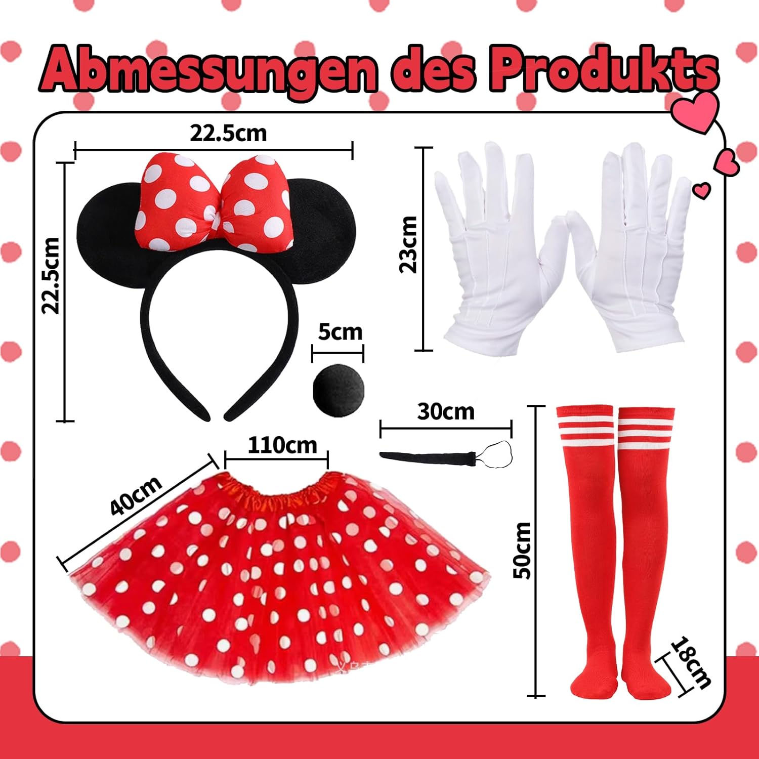 Das Minnie-Maus-Kostüm von iDattel passt mir bei Kleidergröße S sehr gut und bietet eine vollständige Verkleidung zu einem guten Preis. Die einzelnen Komponenten sind solide verarbeitet und machen das Kostüm wirklich süß. Lediglich der Rock hat mich etwas enttäuscht. Die auf den Produktbildern angezeigten dicken Lagen, werden nicht so erfüllt, wie ich es mir vorgestellt habe. Der Rock ist leider sehr durchsichtig, sodass man eine blickdichte (Strumpf-)Hose drunter tragen muss/sollte. Eine schwarze Leggins passt zum Beispiel hervorragend zu dem Kostüm.