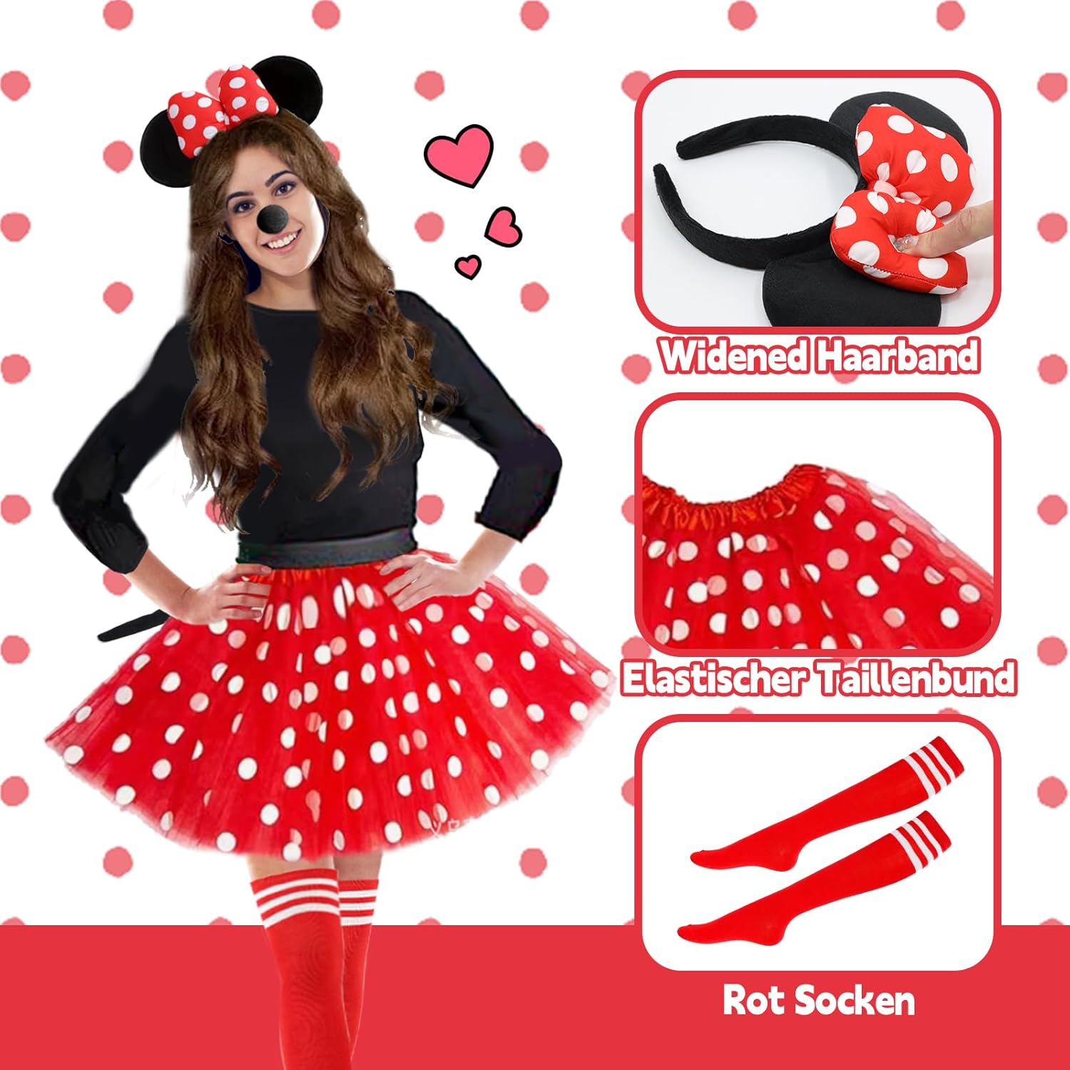 Costume da topo topo, costume di carnevale da donna costume da topo topo per ragazze set tutù rosso/fascia per capelli con orecchie da topo/guanti/naso/coda/calze/per carnevale a tema Halloween festa cosplay