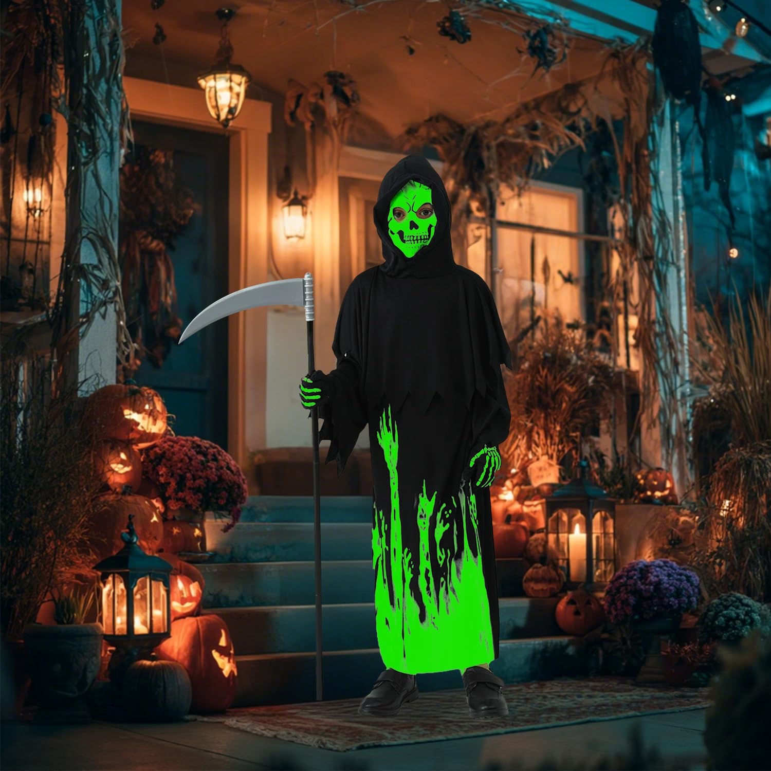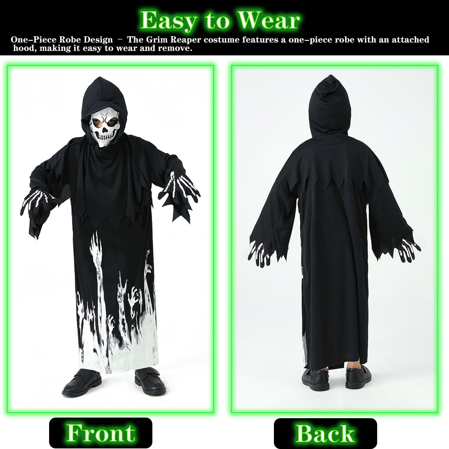 Costume da Triste Mietitore per bambini - Costume luminoso da Tristo Mietitore per Halloween per ragazzi e ragazze - Set di travestimenti spaventosi per Carnevale e Halloween