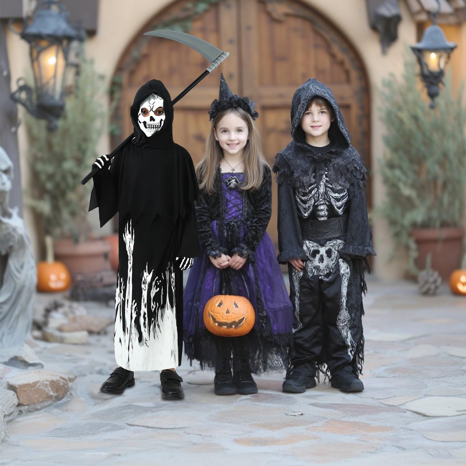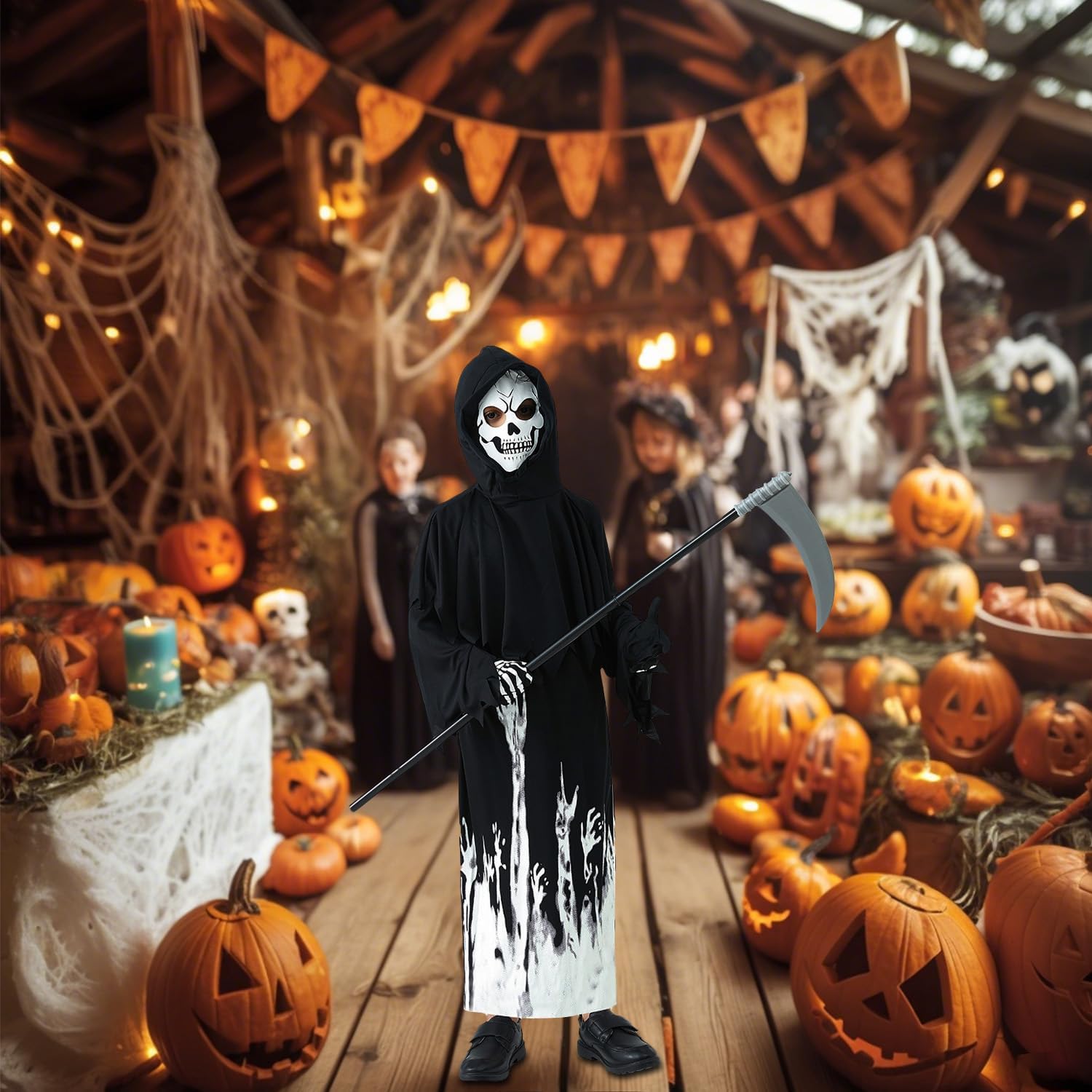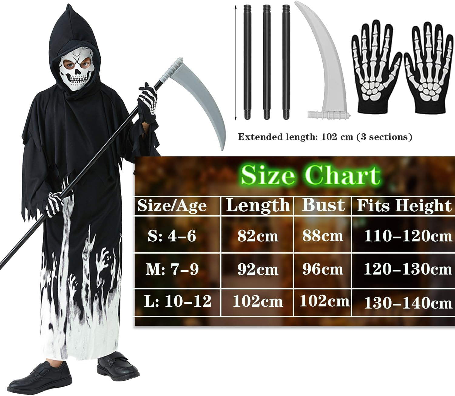 Super déguisement complet, la capuche englobe toute la tête et fait un masque. La faux se monte avec les tronçons qui s'emboîtent, c'est léger.