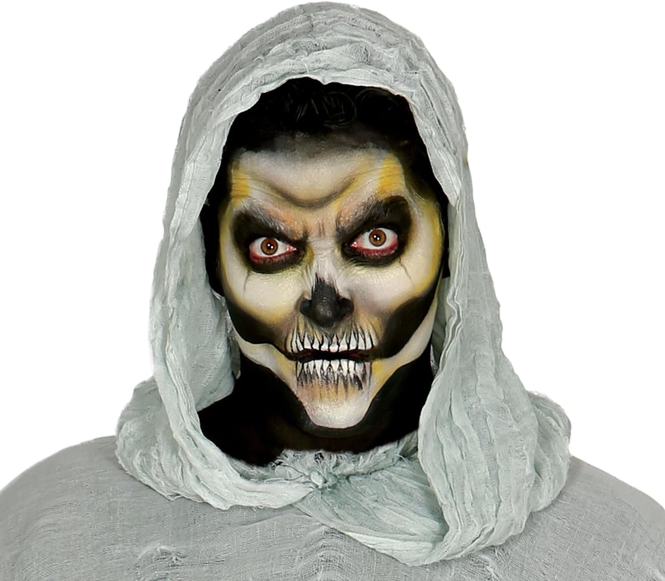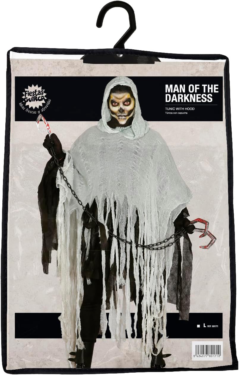 Costume da Dark Man per adulto comprensivo di tunica con cappuccio. Catena con ganci da macellaio e guanti non inclusi. L'abbigliamento, a brandelli, è inospitale. Lo straccio si adatta perfettamente a vagare per le strade nella notte di Halloween per spaventare i passanti....