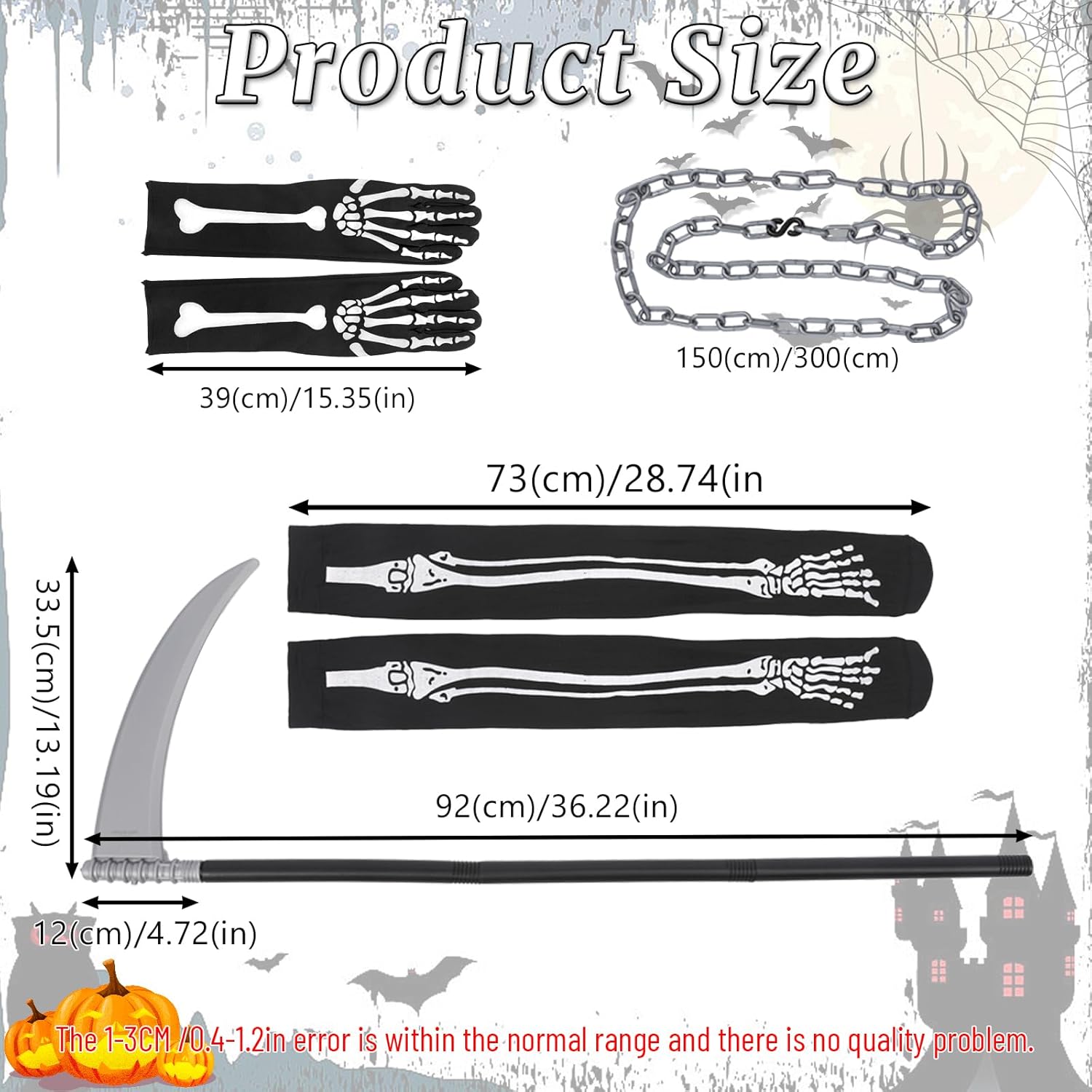Das Kostüm kam schnell und gut verpackt an. Das Kostüm an sich besteht aus recht vielen Accessoires (Kette, Sense, Knochenhandschuhen und Strümpfe, Netz und Kostüm mit Kapuze). Die Verarbeitung des Kostüms ist recht ordentlich. Die Sense und die Kette sehen aber eher billig aus. Die Sense besteht aus vier Teilen, die man zusammensetzten muss. Die langen Handschuhe und Strümpfe sind recht lang und bedecken den ganzen Unterarm und die Beine. Der Aufdruck ist recht gut. Das Netzt ist am Kostüm angenäht. Die Größenangaben stimmen recht gut. Alles in allem bekommt man hier ein komplettes Kostüm, gut geeignet für Halloween.