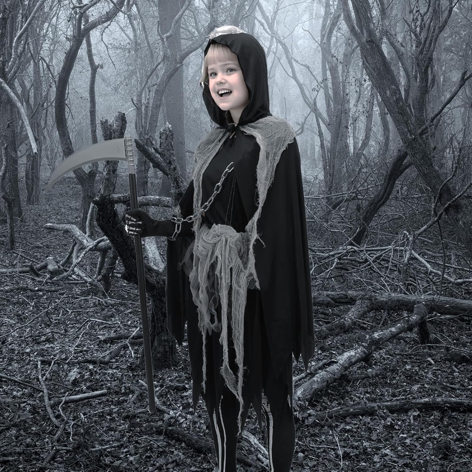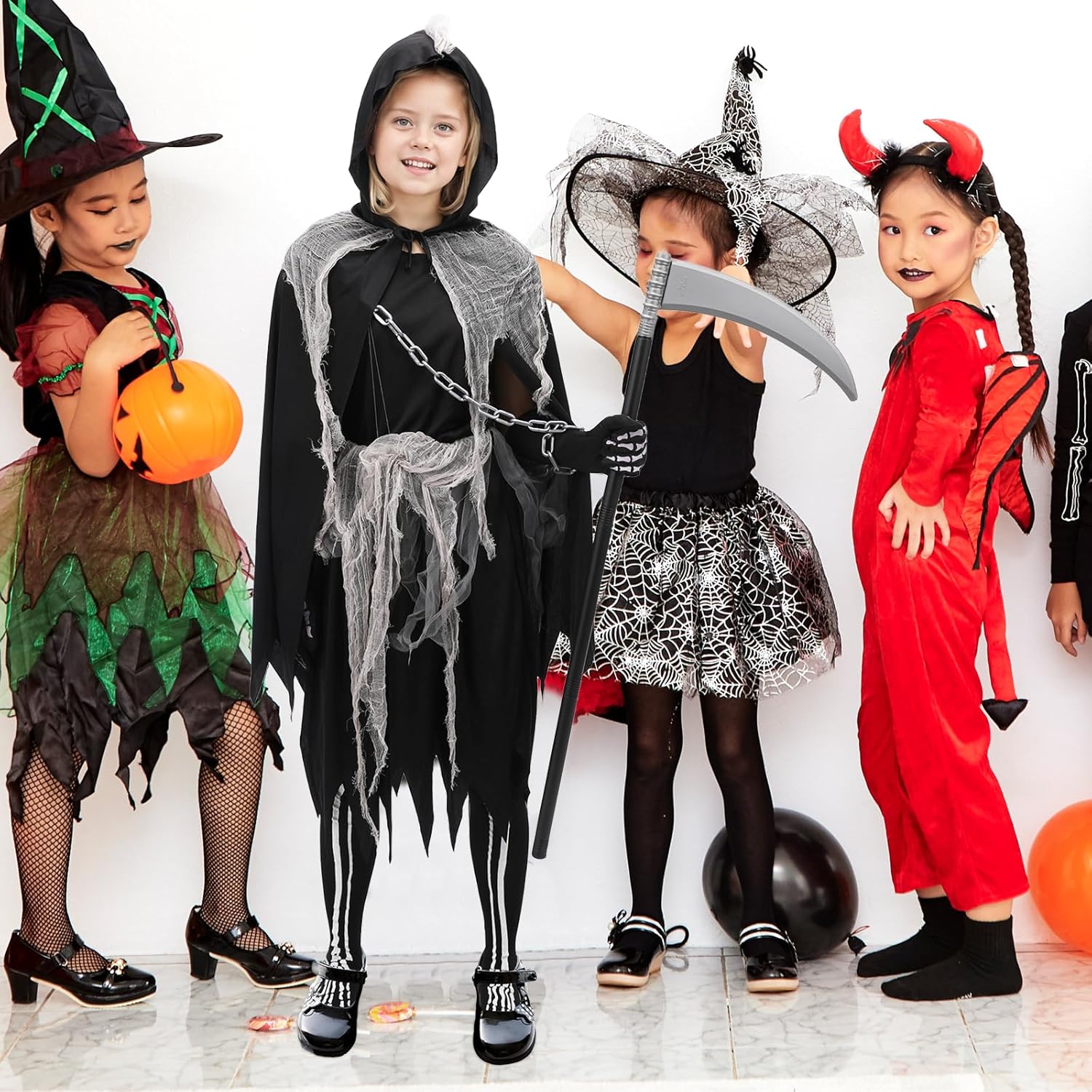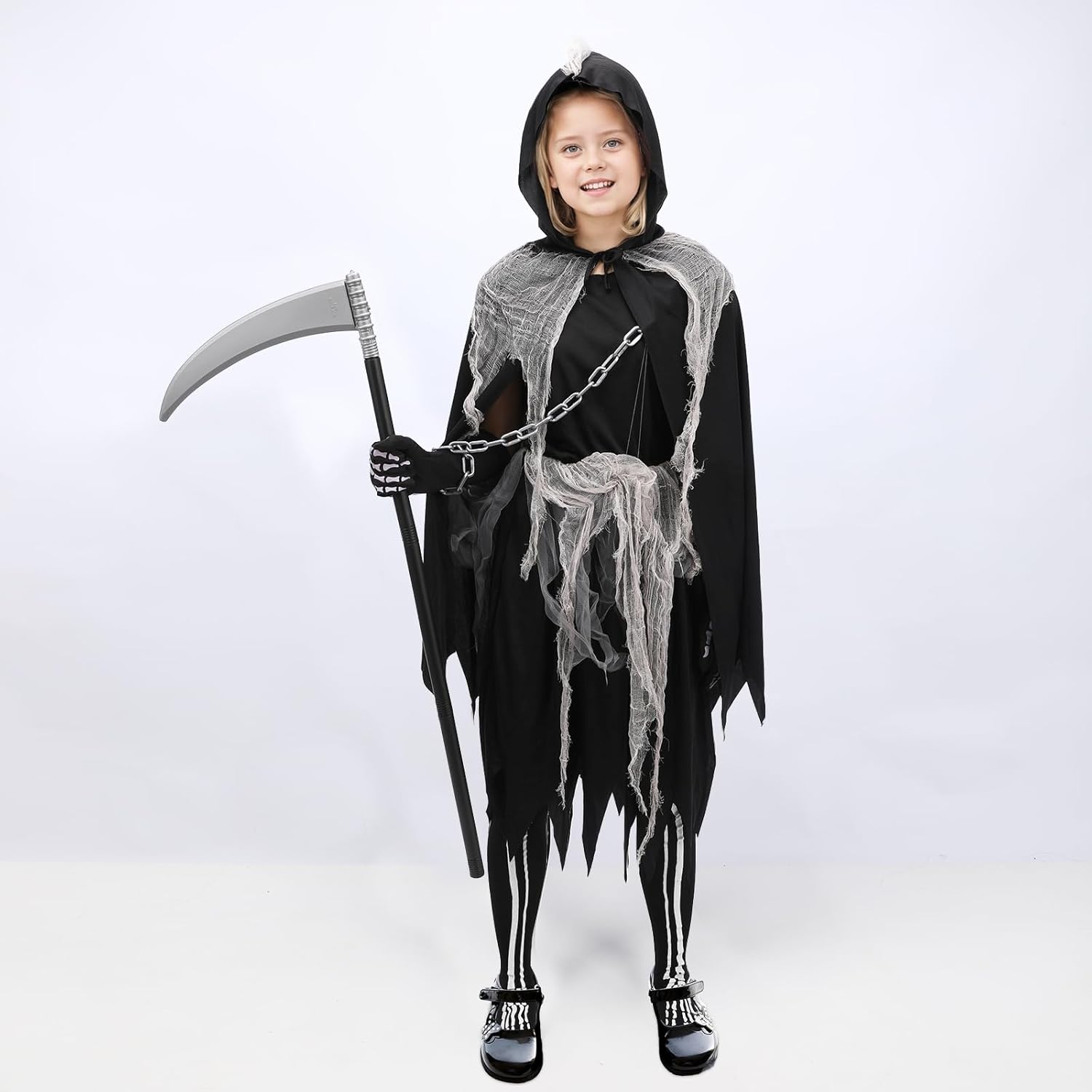 Design: Schwarzes Kleid mit Cape, Strumpfhose, Sense, Aufklebern und spinnenähnlichen Details. Sehr gute Verarbeitung, Größe M passt für 130–140 cm. Spielspaß: Meine Tochter (112 cm) kann es nächstes Jahr tragen, jetzt noch zu groß. Trotzdem wird es behalten, weil der Look wirklich süß und selten für Mädchen ist. Extra: Alles dabei, keine Extras nötig. Kostüm wirkt komplett und hochwertig. Fazit: Hochwertig, detailliert und außergewöhnlich. Wer ein ausgefallenes Halloween-Kostüm für Mädchen sucht, wird hier fündig.