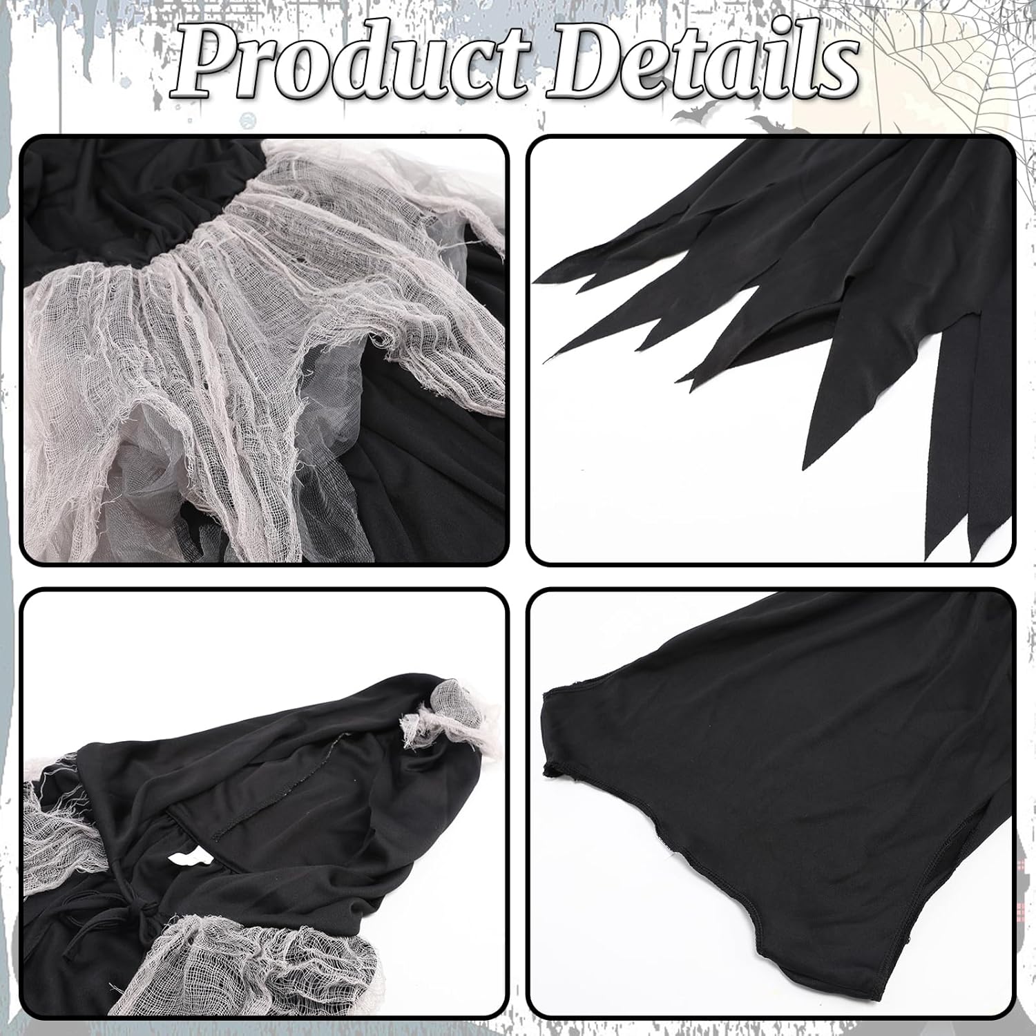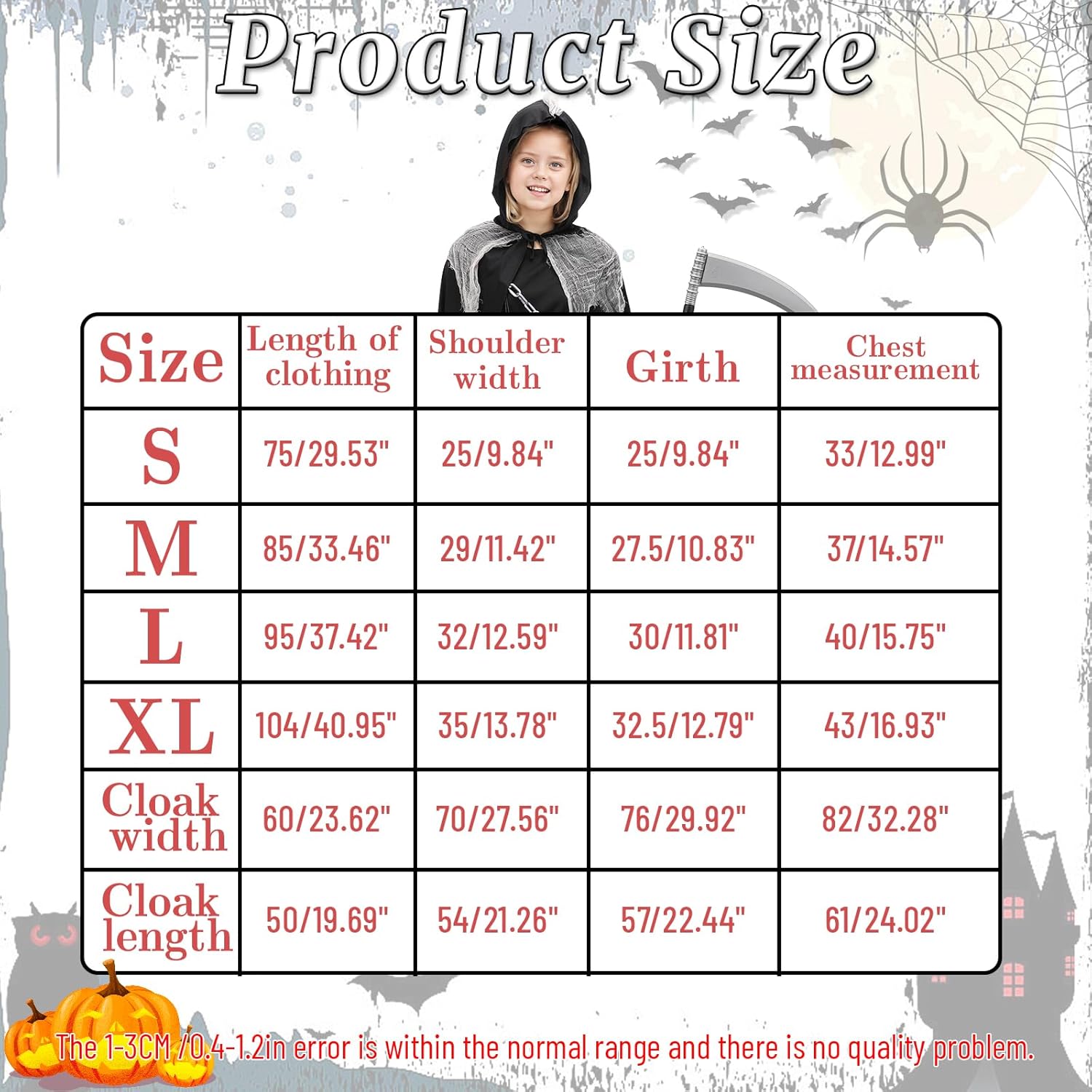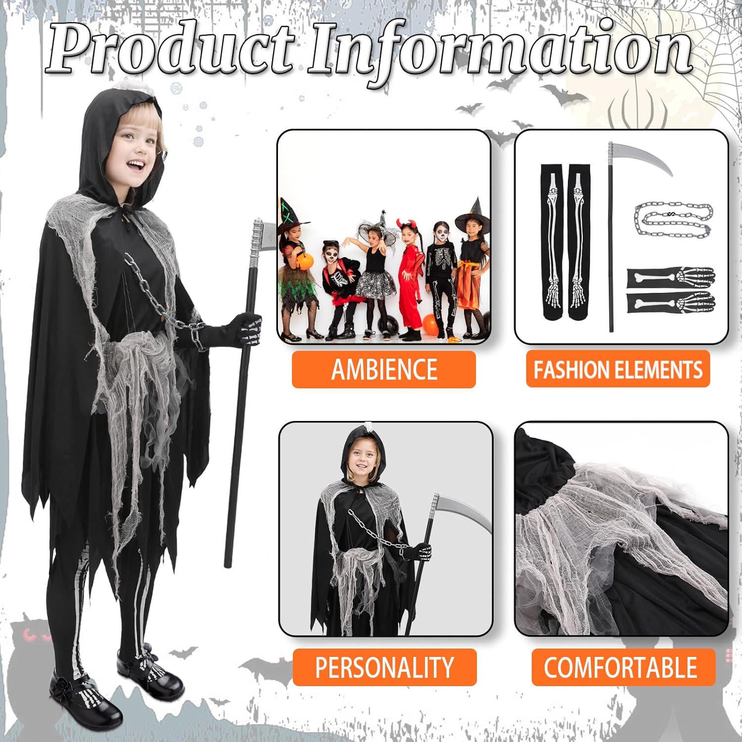 Design: Schwarzes Kleid mit Cape, Strumpfhose, Sense, Aufklebern und spinnenähnlichen Details. Sehr gute Verarbeitung, Größe M passt für 130–140 cm. Spielspaß: Meine Tochter (112 cm) kann es nächstes Jahr tragen, jetzt noch zu groß. Trotzdem wird es behalten, weil der Look wirklich süß und selten für Mädchen ist. Extra: Alles dabei, keine Extras nötig. Kostüm wirkt komplett und hochwertig. Fazit: Hochwertig, detailliert und außergewöhnlich. Wer ein ausgefallenes Halloween-Kostüm für Mädchen sucht, wird hier fündig.
