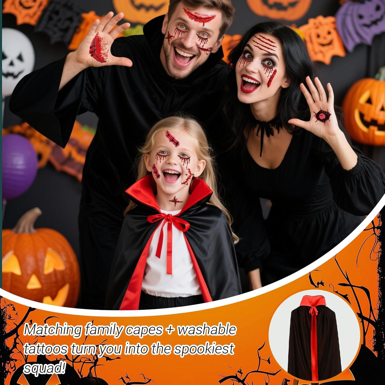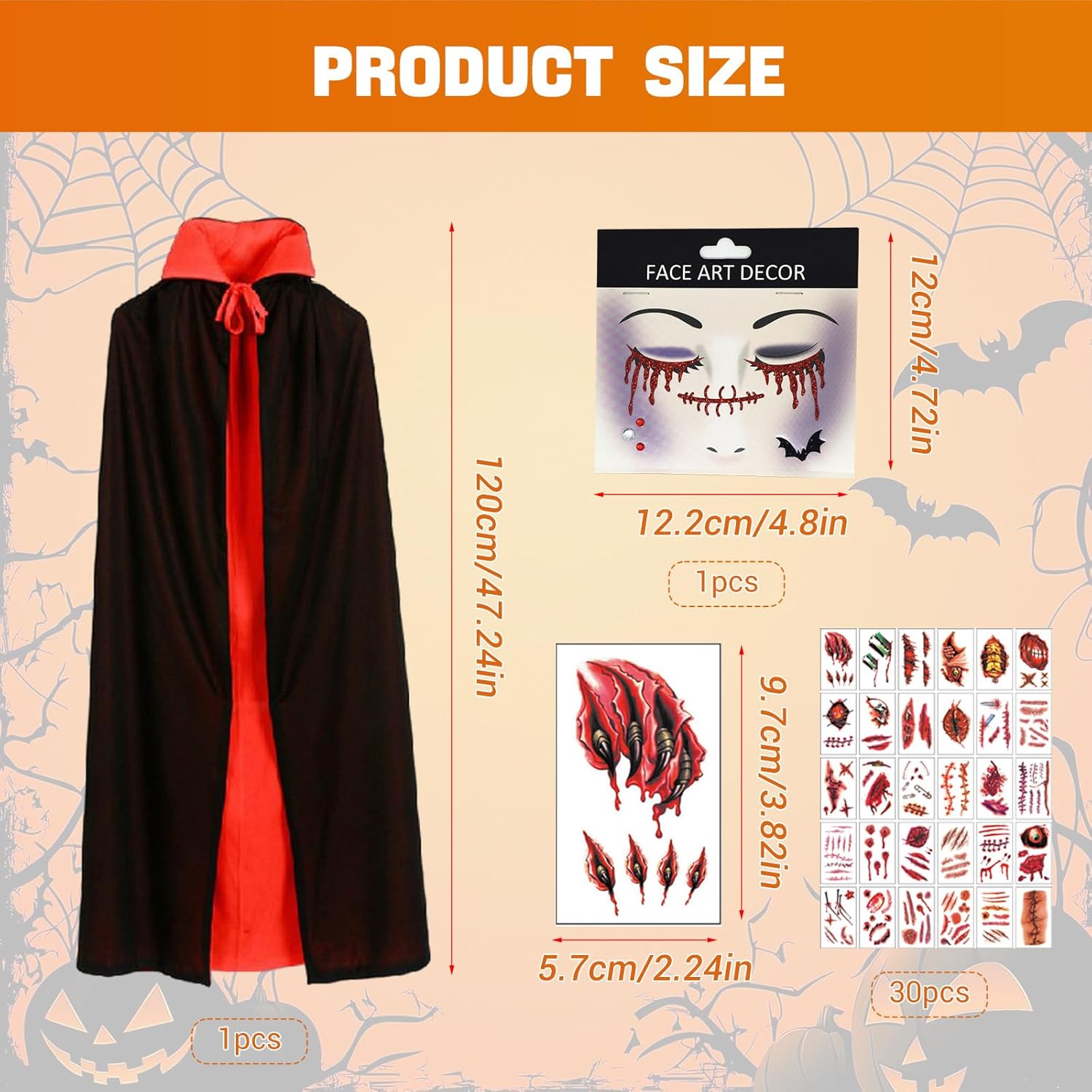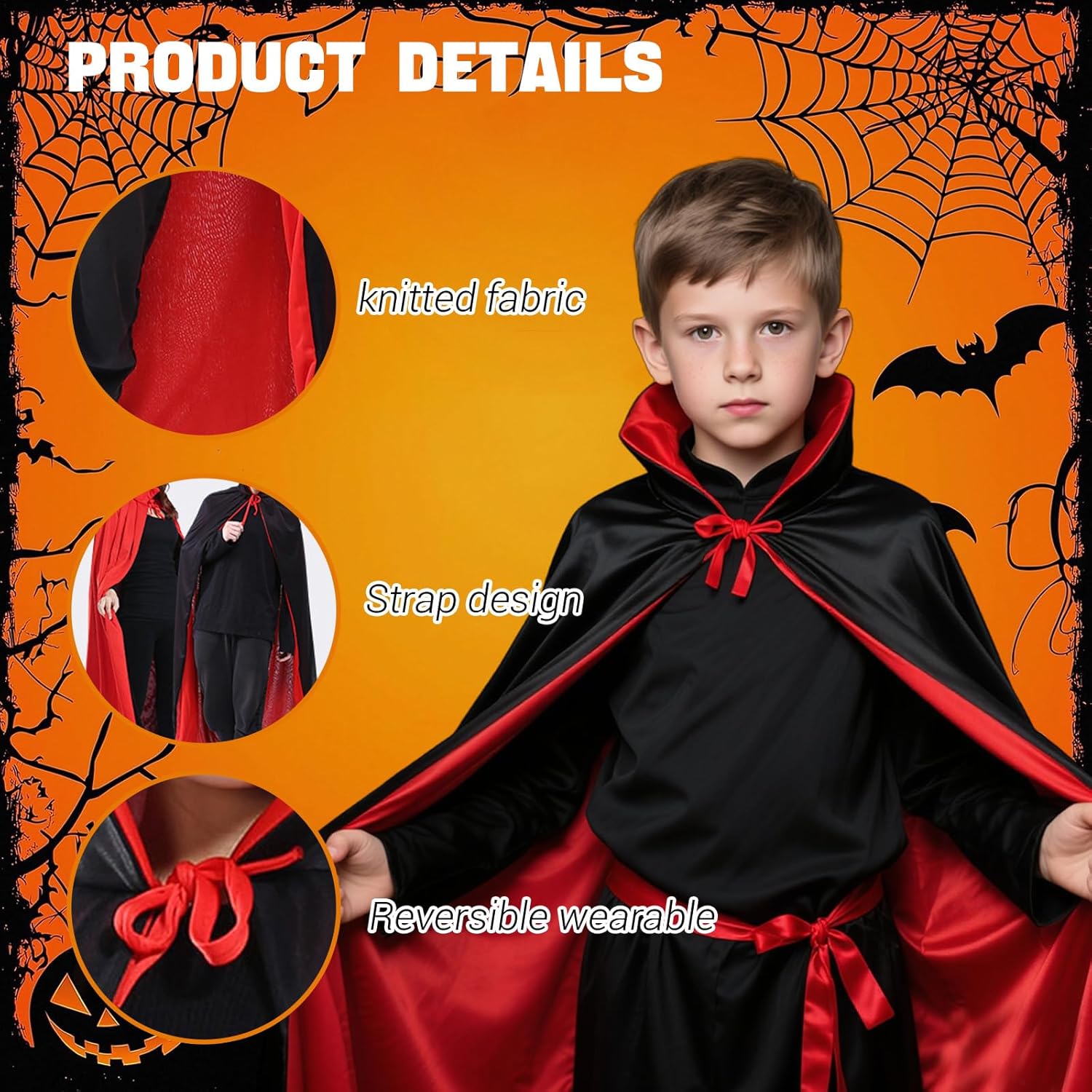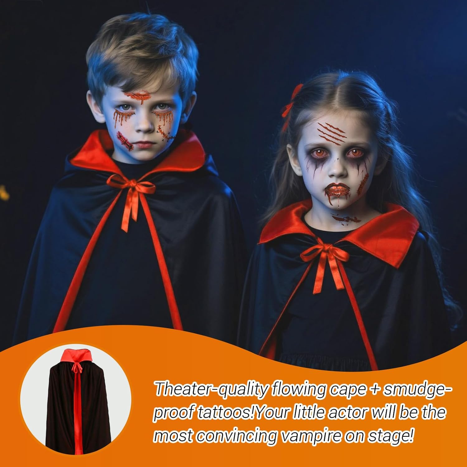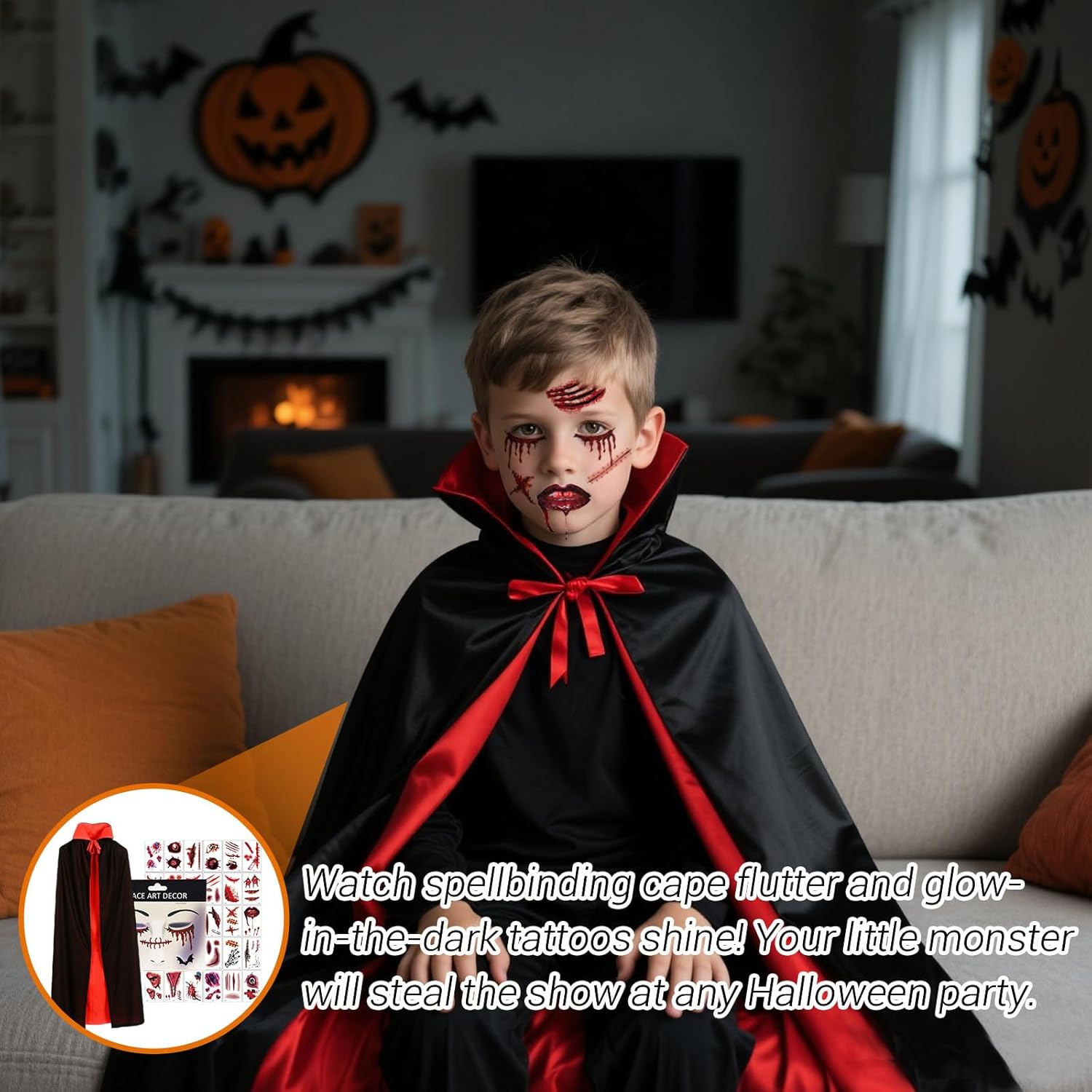 Set completo per un look da vero vampiro:Il costume da vampiro per bambini include tutto il necessario per trasformarsi in una creatura della notte: un mantello reversibile nero e rosso, un adesivo per il viso in stile vampiro e ben 30 tatuaggi temporanei a tema Halloween. Questo set completo è pensato per offrire un’esperienza di gioco ricca e coinvolgente durante feste in maschera, eventi scolastici e spettacoli, assicurando un travestimento che non passa inosservato. Mantello in tessuto leggero e durevole:Il mantello da vampiro è realizzato in tessuto mesh di alta qualità, leggero e traspirante, ma anche resistente e riutilizzabile. La doppia faccia in nero e rosso permette di adattarsi a diversi stili e temi di festa, garantendo al bambino un aspetto suggestivo ma comodo durante l'intera giornata di Halloween o qualsiasi altra occasione di travestimento. Design con colletto alto per un effetto scenico:Il costume presenta un elegante mantello con colletto alto che richiama lo stile classico dei vampiri. Grazie al pratico laccio sul colletto, il mantello è facile da indossare e togliere anche per i più piccoli. Il design accattivante rende il travestimento particolarmente adatto per spettacoli teatrali o sessioni fotografiche a tema. Taglia pensata per i bambini:Il costume misura 120 cm dalla spalla al fondo, ideale per bambini che desiderano un look completo e proporzionato da vampiro. Prima dell’acquisto, è consigliato verificare la lunghezza rispetto all’altezza del bambino per assicurare una vestibilità perfetta e un’esperienza di utilizzo confortevole. Perfetto per numerose occasioni a tema:Questo costume da vampiro per bambini è perfetto non solo per Halloween, ma anche per carnevali, feste scolastiche, giochi di ruolo, spettacoli teatrali, eventi cosplay, recite scolastiche e altri eventi festivi. Il suo stile versatile lo rende ideale per interpretare non solo un vampiro, ma anche personaggi come maghi, demoni, stregoni o il leggendario Dracula.