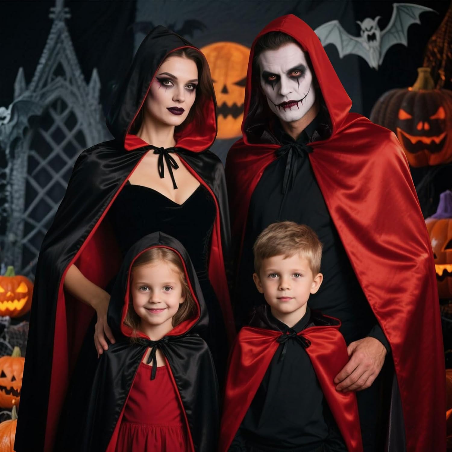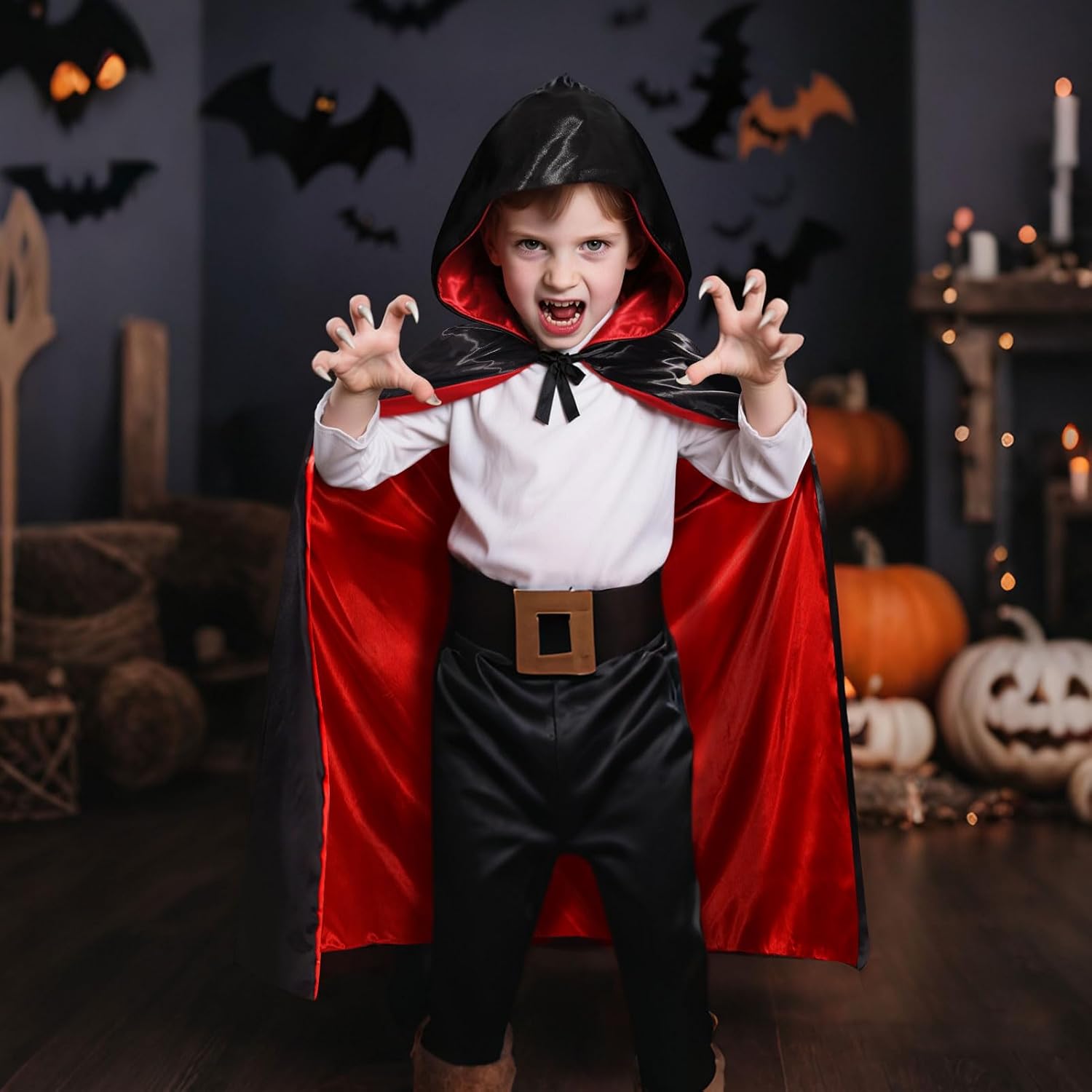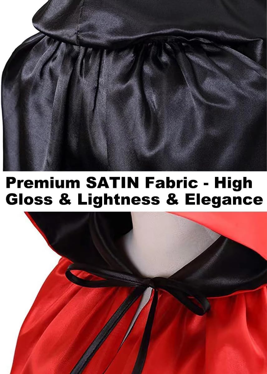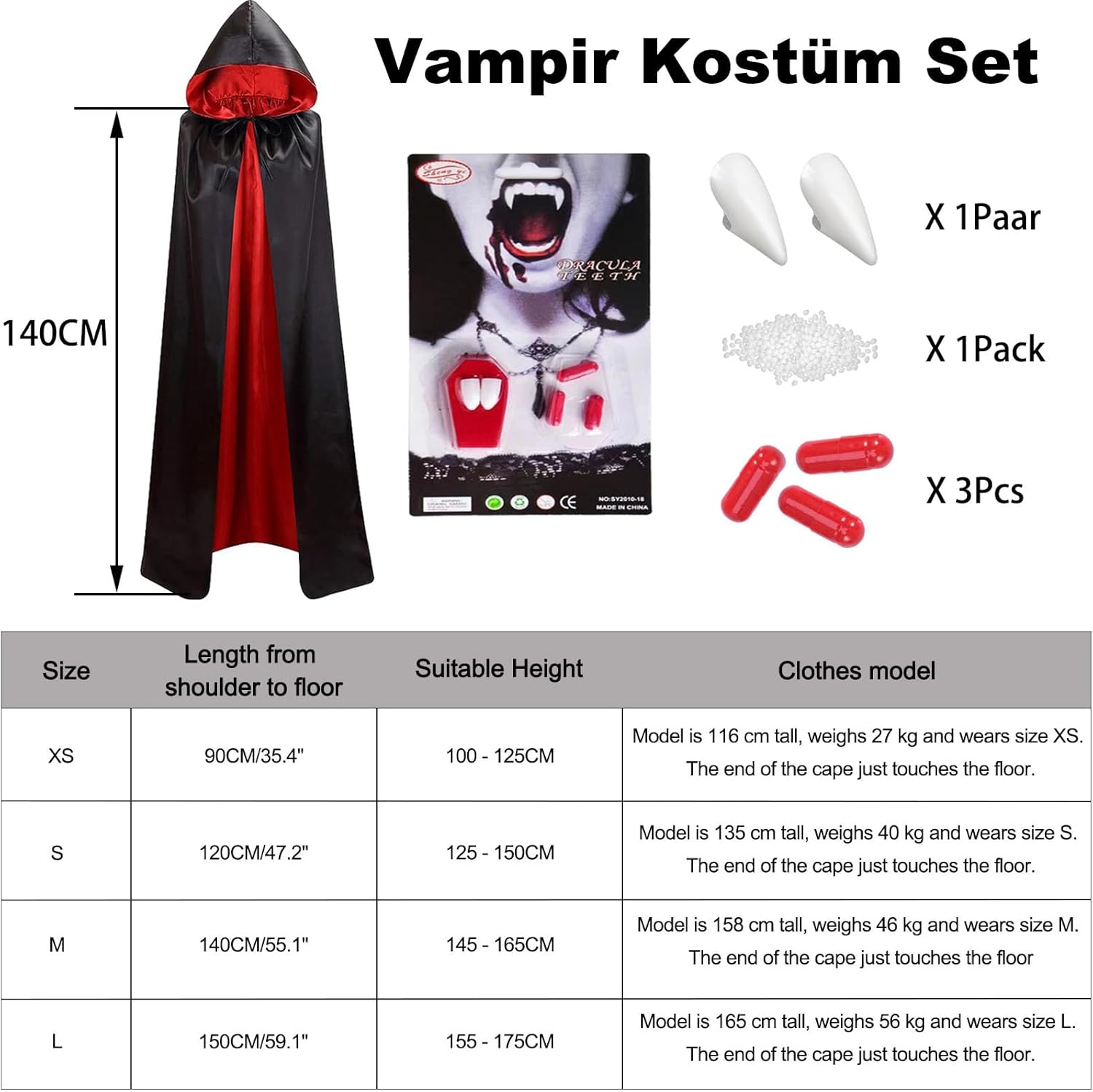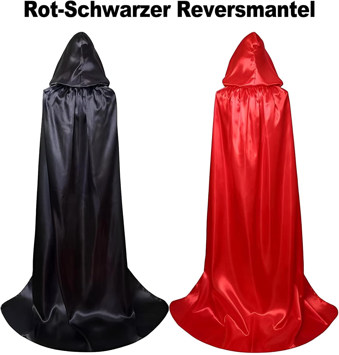 Costume da vampiro per Halloween - Doppio mantello in SATIN con cappuccio, denti da vampiro e sangue finto, 120/140/150 cm Mantello Halloween vampire rosso e nero Costume Dracula adulti,donne ragazze