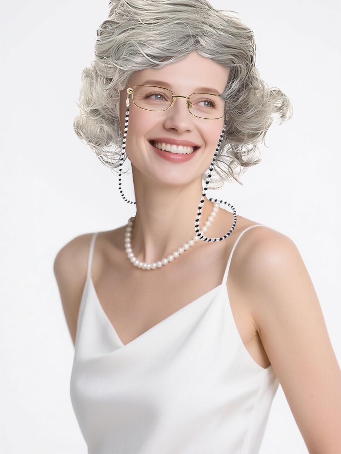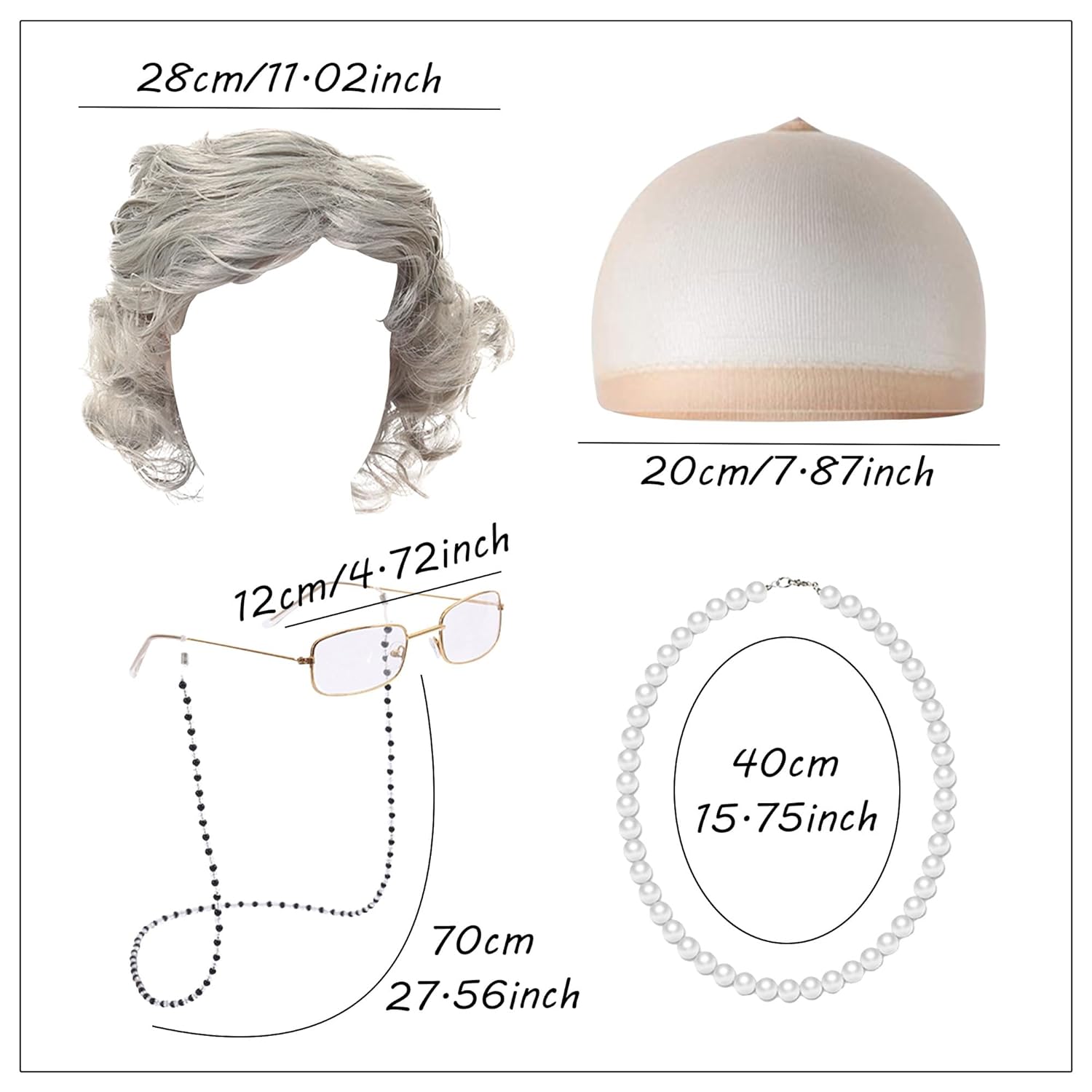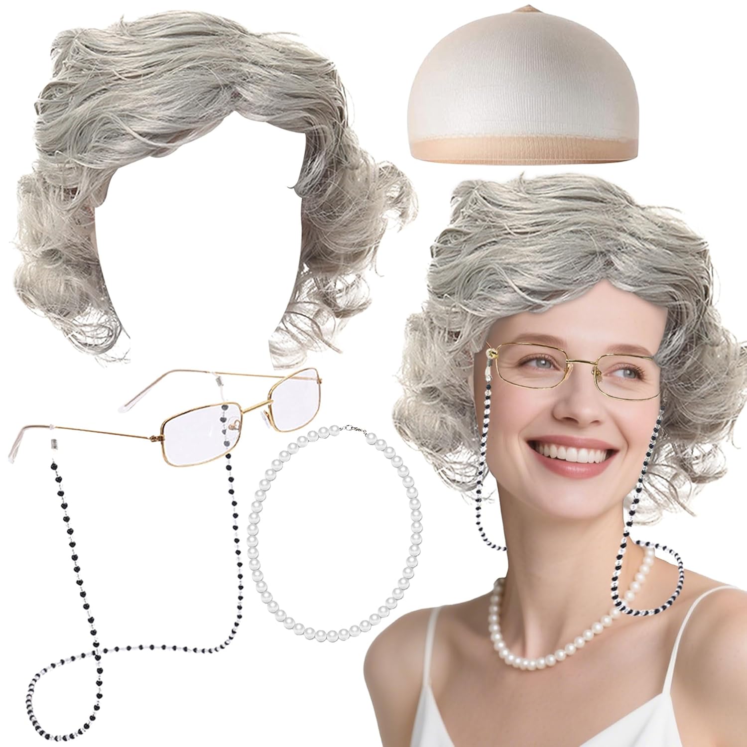 Questo set di costumi da "Vecchia Signora" offre una trasformazione completa in un affascinante personaggio da nonna con accessori coordinati. La parrucca grigia da nonna presenta morbide onde e un'attaccatura dei capelli dall'aspetto naturale per un autentico stile vintage. Progettata come una parrucca da vecchia signora, crea effetti di invecchiamento istantanei pur rimanendo comoda per un uso prolungato. La nostra collezione di parrucche da vecchia contiene dettagli accuratamente realizzati per migliorare spettacoli teatrali o in costume. Riceverai 1 parrucca da nonna, 1 paio di occhiali, 1 catenella per occhiali, 1 catena di finte perle e 1 cuffia per parrucca, perfetta per spettacoli comici, produzioni teatrali o vintage. feste in maschera dove si vogliono anziani esagerati