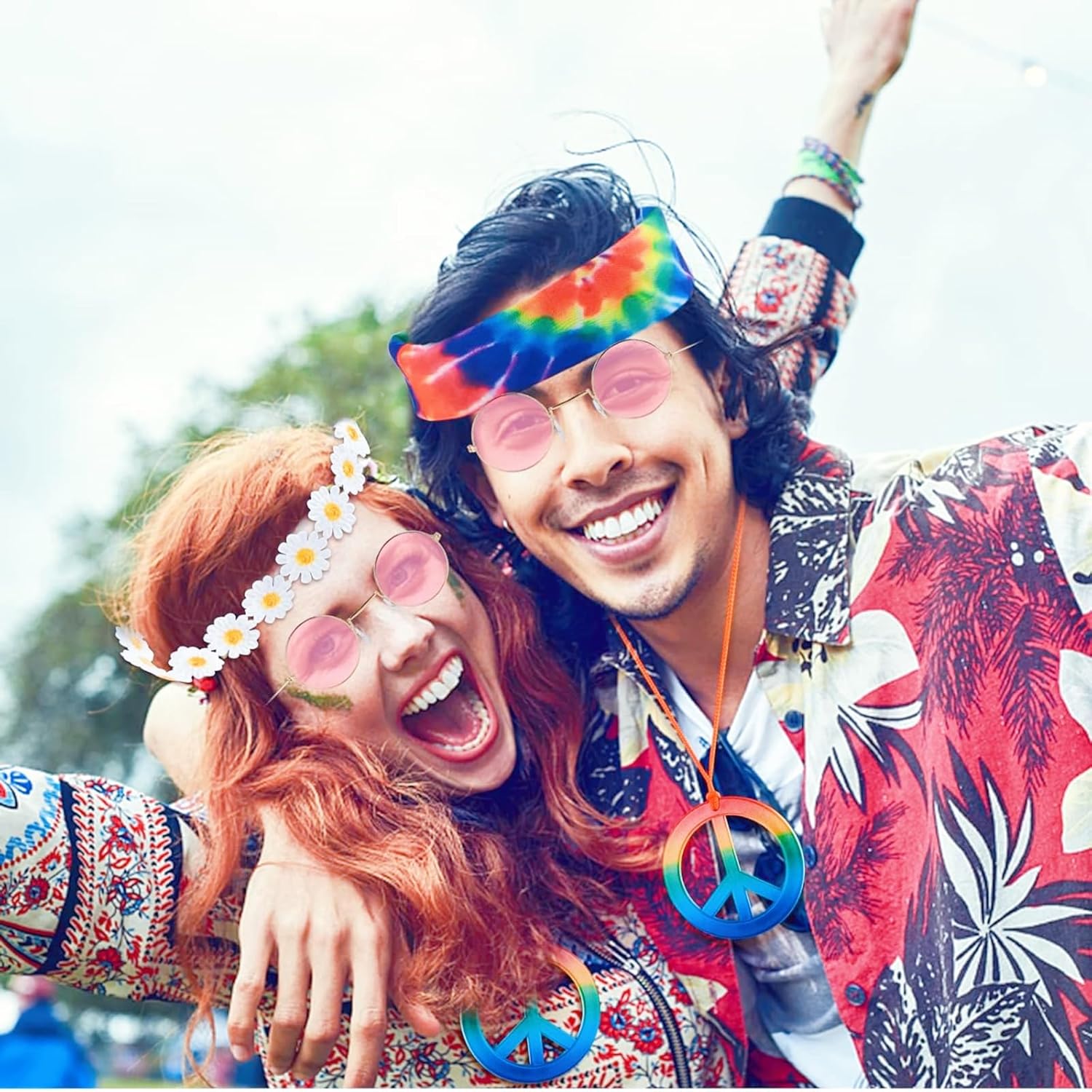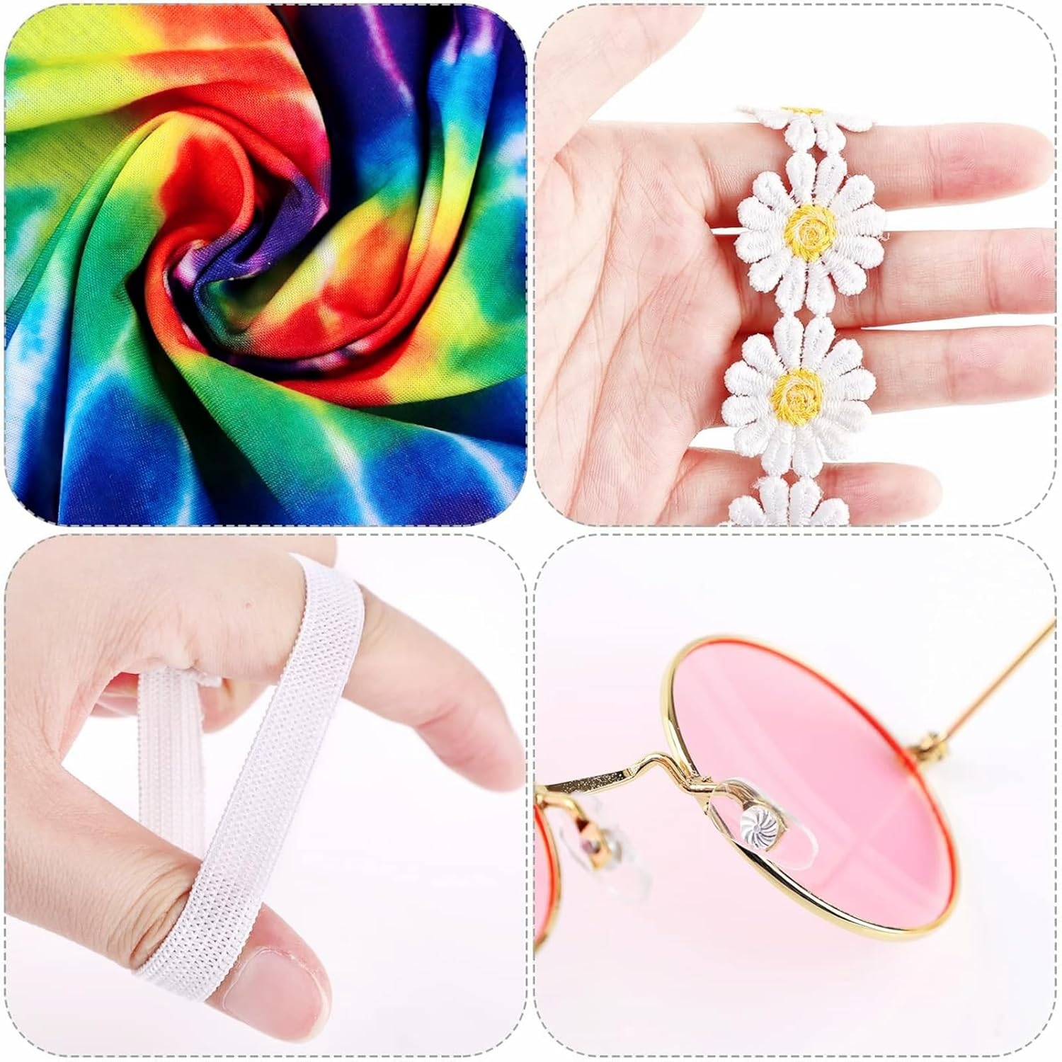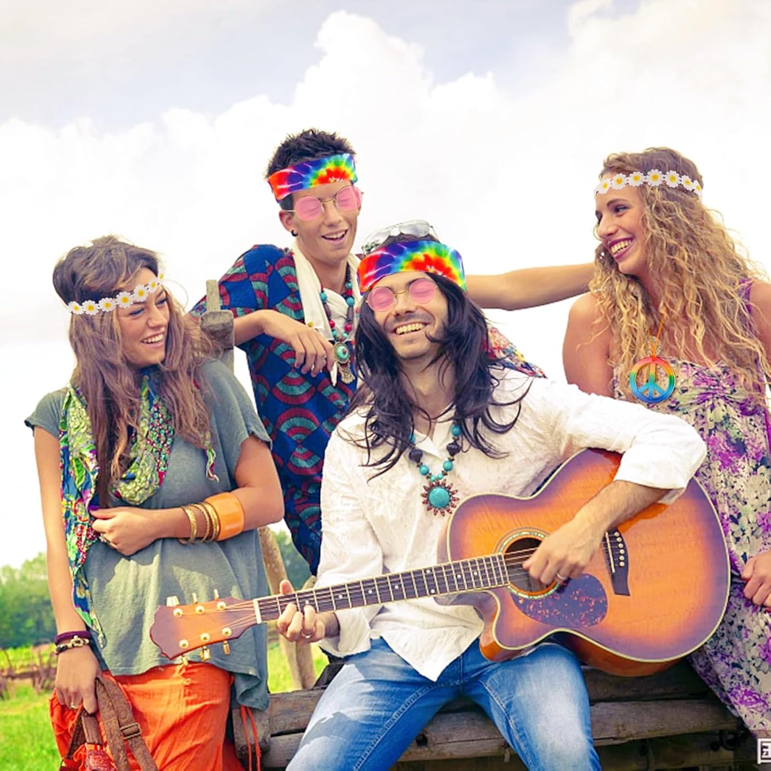 Vivi l'esperienza di un completo ritorno agli anni '60 e '70 con il nostro set di abiti e accessori hippie. Il kit include occhiali da sole retrò, una corona di girasoli, una fascia per capelli tie-dye, una collana e orecchini con simbolo di pace. Questi accessori portano un tocco di stile e colore al tuo look, permettendoti di esprimere il tuo stile unico in qualsiasi occasione. Che si tratti di una festa a tema, un evento estivo o semplicemente per la tua giornata quotidiana, i nostri accessori hippie aggiungeranno un tocco di originalità e divertimento al tuo look. Il fascino e il comfort del nostro set ti faranno rivivere l'epoca hippie in grande stile!