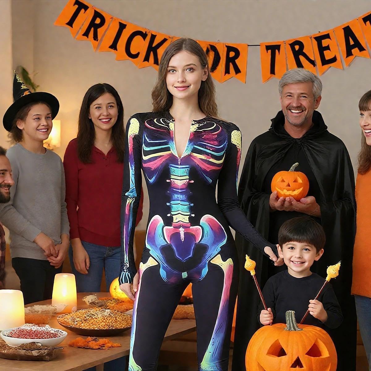 Meine Frau brauchte ein Kostüm, in dem sie sich wohlfühlen und warm anziehen kann (sie ist kein Fan von aufblasbaren Kostümen wie ich ). Also habe ich ihr dieses geschenkt! Es sieht richtig gut aus und mit ein bisschen Gesichtsschminke ist der Effekt perfekt. Ein tolles, bequemes Kostüm für kalte Partynächte, und ich bin jetzt offiziell der Ehemann eines sehr kuscheligen Skeletts!