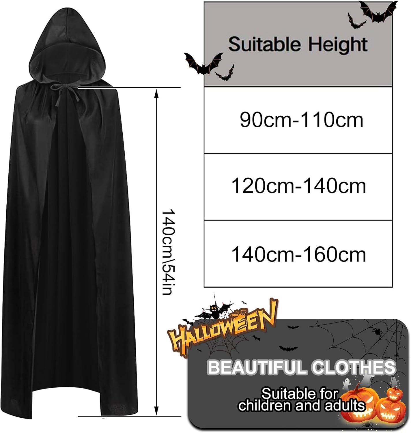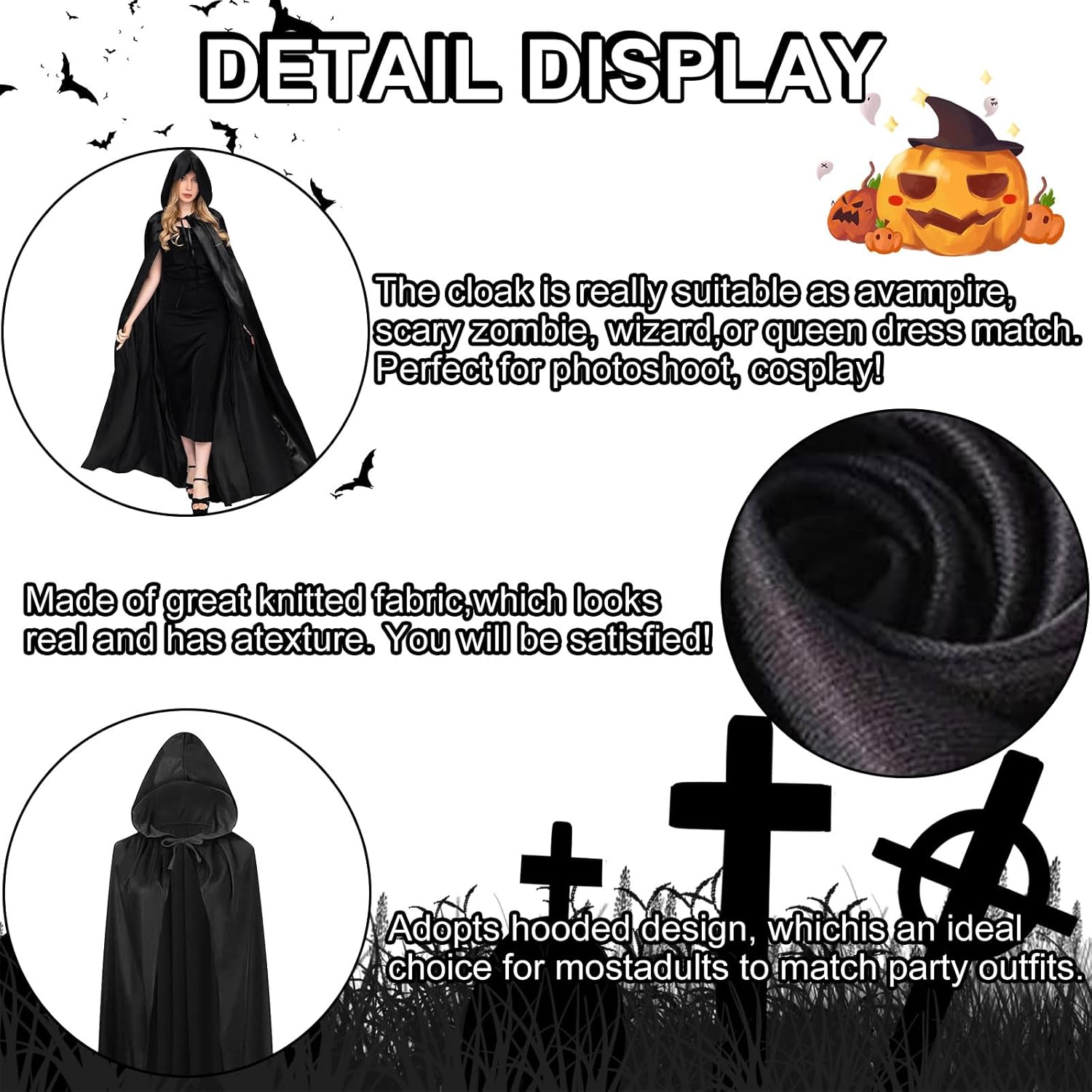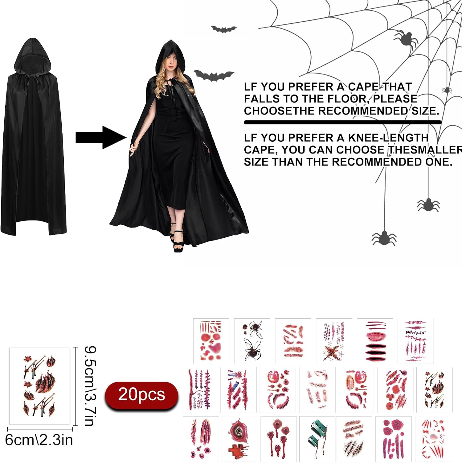Costume di Halloween da vampiro nero con 20 ferite di Halloween Tatuaggi temporanei Costume da diavolo Mantello con cappuccio per la festa di cosplay di Halloween