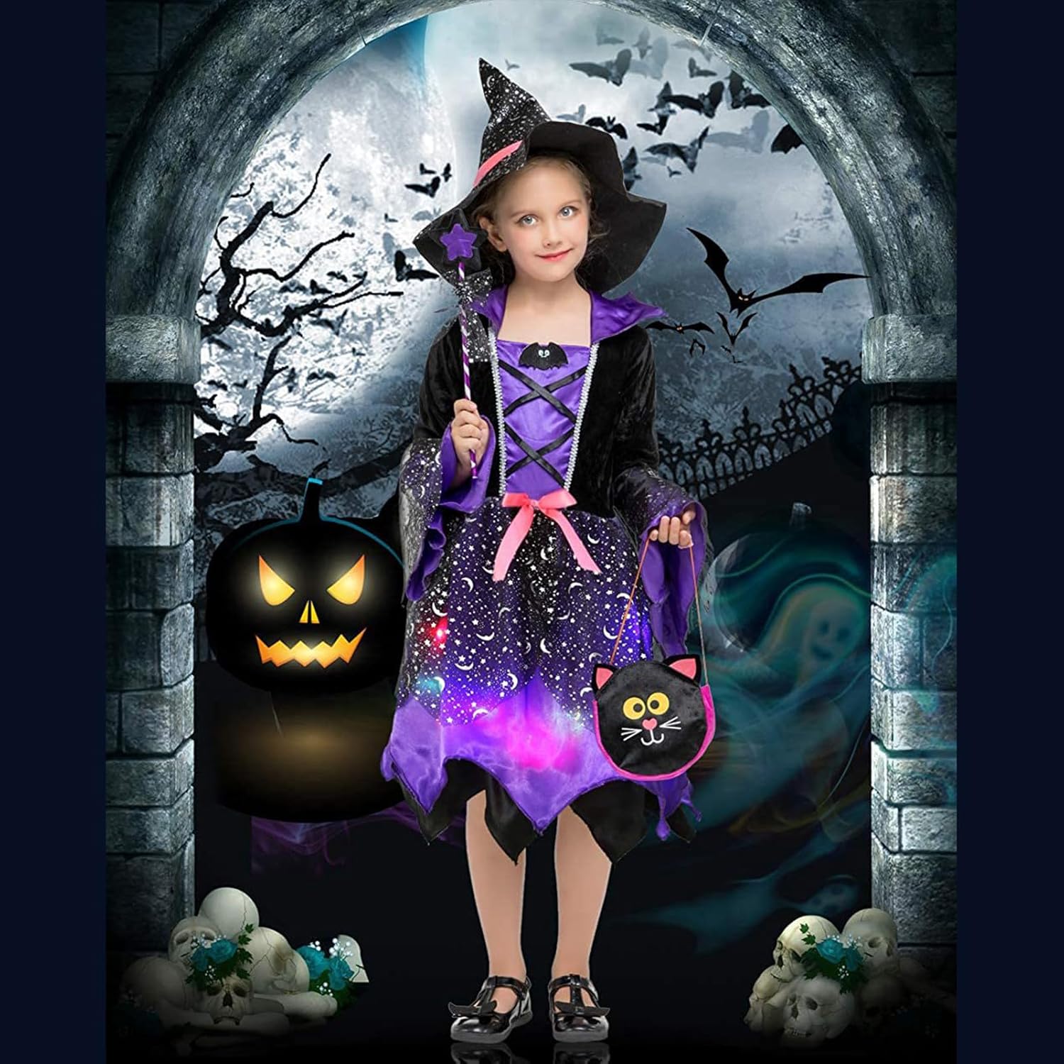 Questo è un costume da strega per ragazze, che può essere utilizzato anche come vestito in maschera, include cappello da strega, borsa da strega, bacchetta magica e abito da strega (viola, effetto principessa opzionale), adatto per Halloween e carnevale