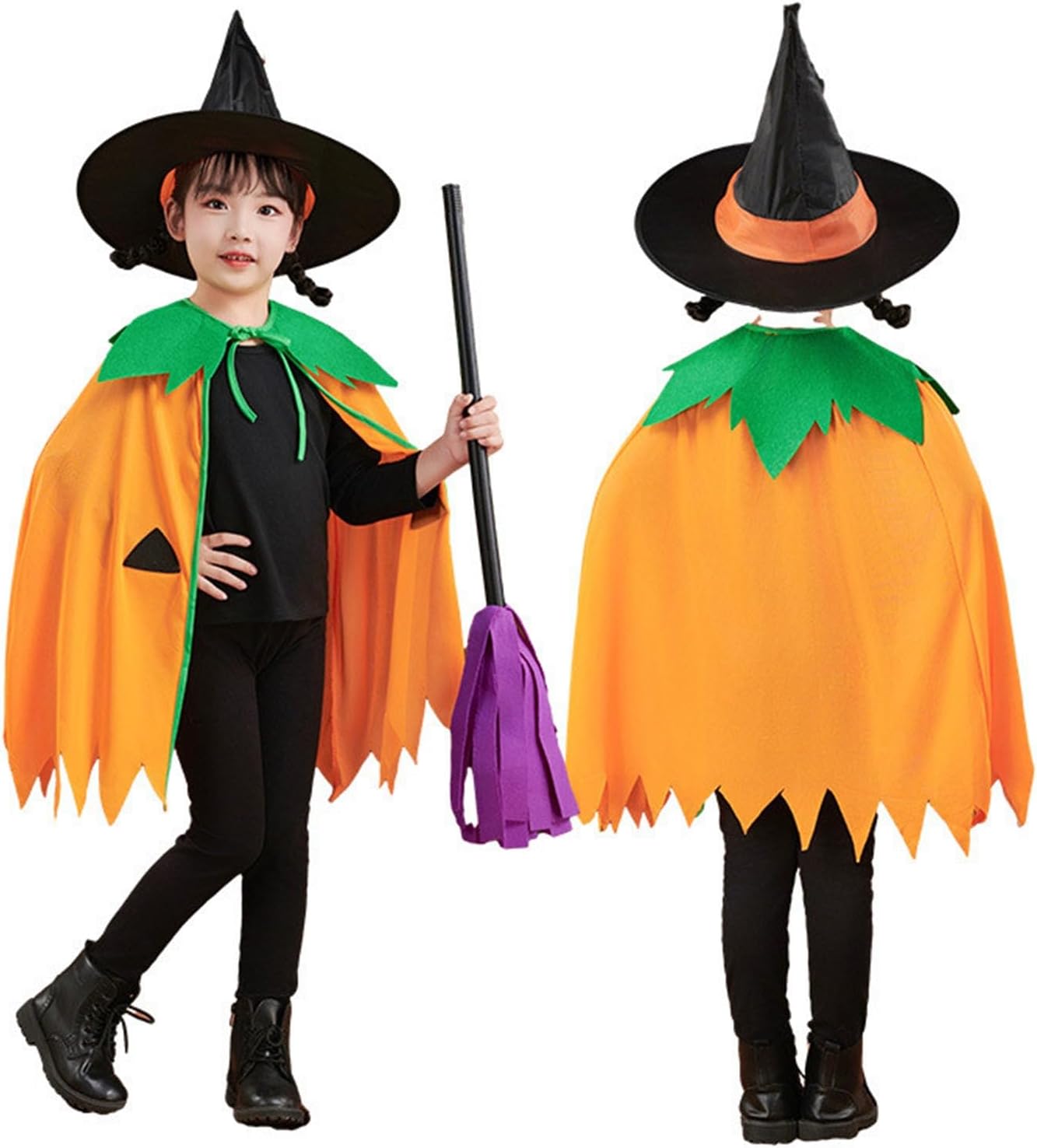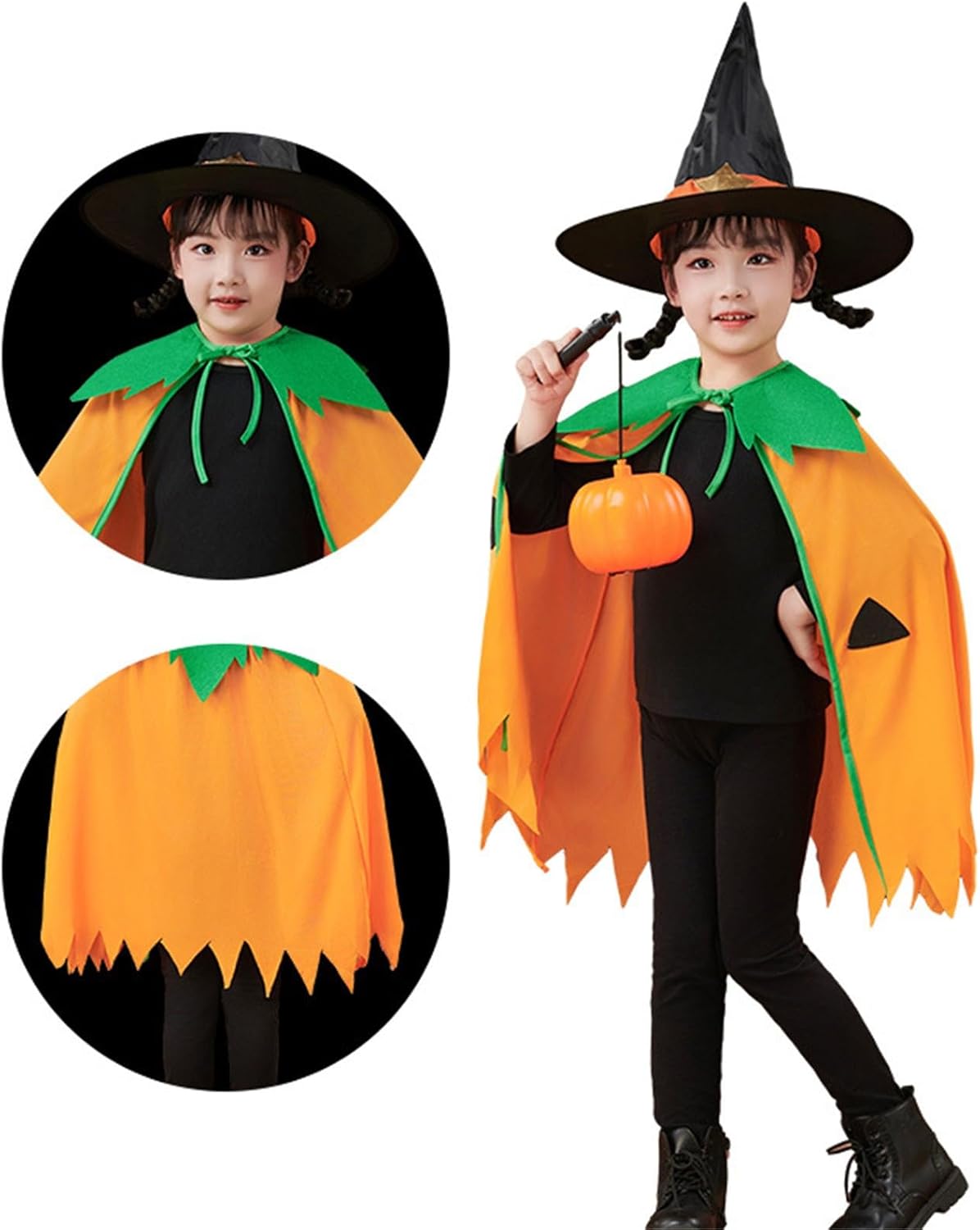 Si tratta di un costume da mantello da zucca per bambini (ragazze e ragazzi), che può essere utilizzato anche come costume da cosplay in maschera, include poncho arancione e cappello da strega, adatto per giochi di ruolo di Halloween e travestimento per feste