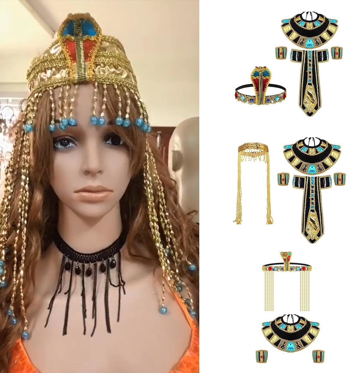 Costume egiziano Serpente Perline Egiziano Principessa Fasce Egiziano Cintura Collare Braccialetti Collare Egizi Caratteristiche: Pacakge 1: Fasce per capelli da principessa egiziana con perline, cintura egiziana, colletto egiziano, coppia di polsini. Confezione 2: coppia di polsini. Pacchetto 3: cintura egiziana; collare egiziano; coppia di polsini. Confezione 4: fascia per capelli con perline da principessa egiziana; collare egiziano; coppia di polsini. Pacchetto 4: cappello dei faraoni egiziani, polsini dei faraoni, scettro a testa di serpente. Realizzato con un panno, morbido e comodo da indossare. Ti offre un'esperienza di utilizzo confortevole. Questo copricapo da principessa egiziana è adatto per una circonferenza della testa di 55-60 cm. Adatto per costume di Halloween, feste cosplay, giochi drammatici e feste in costume egiziano, spettacoli teatrali, oggetti di scena fotografici ed eventi. Adatto per donne e uomini, feste cosplay di Halloween, feste a tema, amici, familiari per Halloween, compleanno. Specifiche tecniche: Colore: colori misti. Componente: Panno Tipo: Set01; Set02; Set03; Set04; Set05; Set06; Set07; Set08; Set09; Adatto per circonferenza della testa di 55-60 cm. Peso: circa 40-357 g. La confezione include: Opzione della confezione: Pacchetto 1: 4 pezzi costume egiziano da donna Pacchetto 2: 3 pezzi costume egiziano Confezione 3: 1 paio di polsini. Confezione 4: 4 pezzi costume da faraoni egiziani. Nota: Si prega di considerare un margine di errore di 0-1 cm a causa della misurazione manuale. 2. L'immagine potrebbe non rispecchiare il colore reale a causa delle diverse impostazioni dei monitor