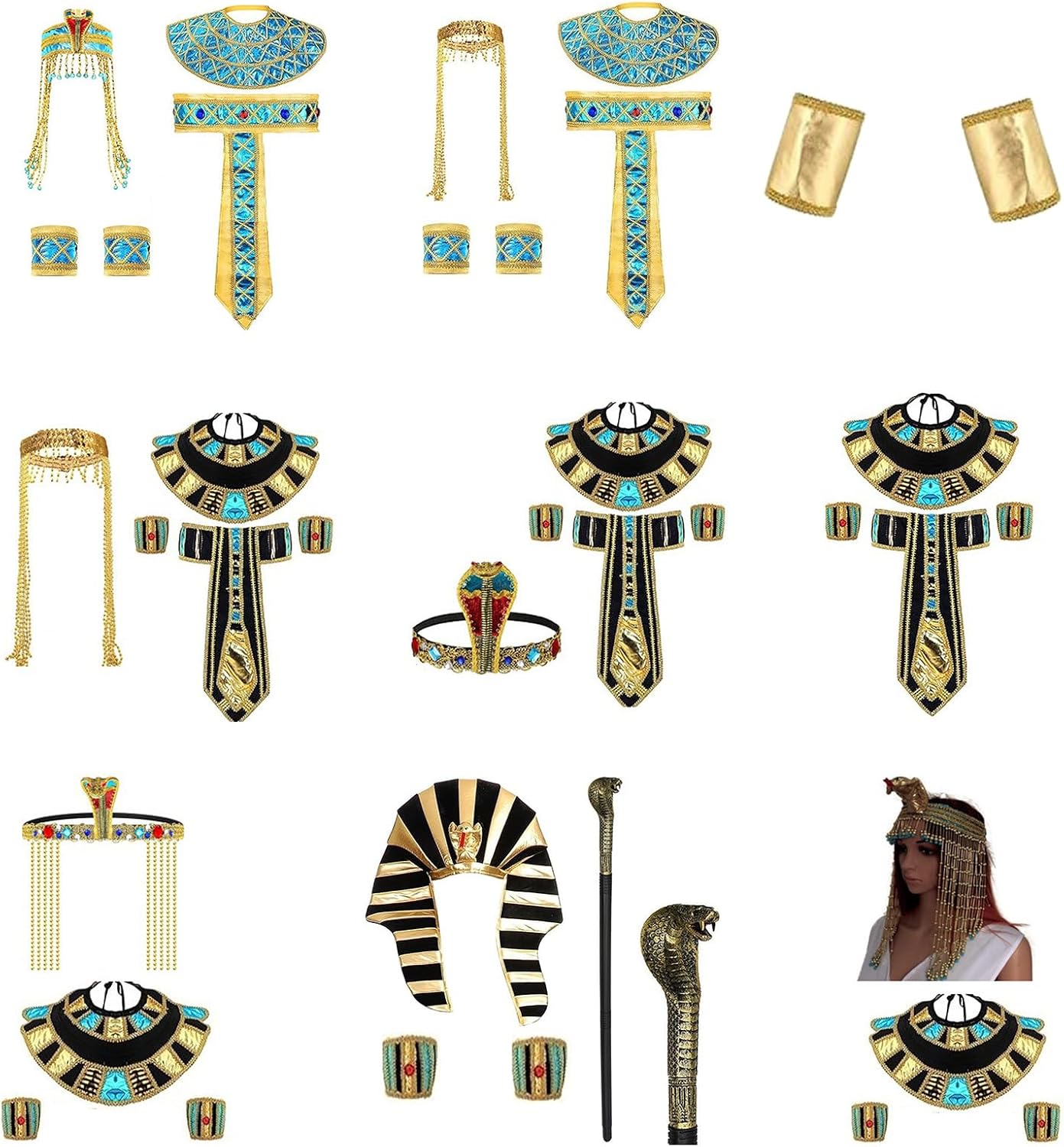 Costume egiziano Serpente Perline Egiziano Principessa Fasce Egiziano Cintura Collare Braccialetti Collare Egizi Caratteristiche: Pacakge 1: Fasce per capelli da principessa egiziana con perline, cintura egiziana, colletto egiziano, coppia di polsini. Confezione 2: coppia di polsini. Pacchetto 3: cintura egiziana; collare egiziano; coppia di polsini. Confezione 4: fascia per capelli con perline da principessa egiziana; collare egiziano; coppia di polsini. Pacchetto 4: cappello dei faraoni egiziani, polsini dei faraoni, scettro a testa di serpente. Realizzato con un panno, morbido e comodo da indossare. Ti offre un'esperienza di utilizzo confortevole. Questo copricapo da principessa egiziana è adatto per una circonferenza della testa di 55-60 cm. Adatto per costume di Halloween, feste cosplay, giochi drammatici e feste in costume egiziano, spettacoli teatrali, oggetti di scena fotografici ed eventi. Adatto per donne e uomini, feste cosplay di Halloween, feste a tema, amici, familiari per Halloween, compleanno. Specifiche tecniche: Colore: colori misti. Componente: Panno Tipo: Set01; Set02; Set03; Set04; Set05; Set06; Set07; Set08; Set09; Adatto per circonferenza della testa di 55-60 cm. Peso: circa 40-357 g. La confezione include: Opzione della confezione: Pacchetto 1: 4 pezzi costume egiziano da donna Pacchetto 2: 3 pezzi costume egiziano Confezione 3: 1 paio di polsini. Confezione 4: 4 pezzi costume da faraoni egiziani. Nota: Si prega di considerare un margine di errore di 0-1 cm a causa della misurazione manuale. 2. L'immagine potrebbe non rispecchiare il colore reale a causa delle diverse impostazioni dei monitor