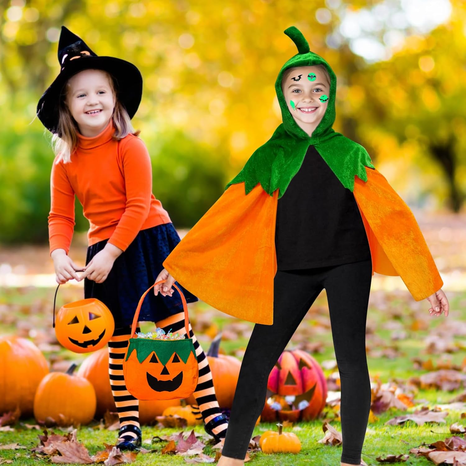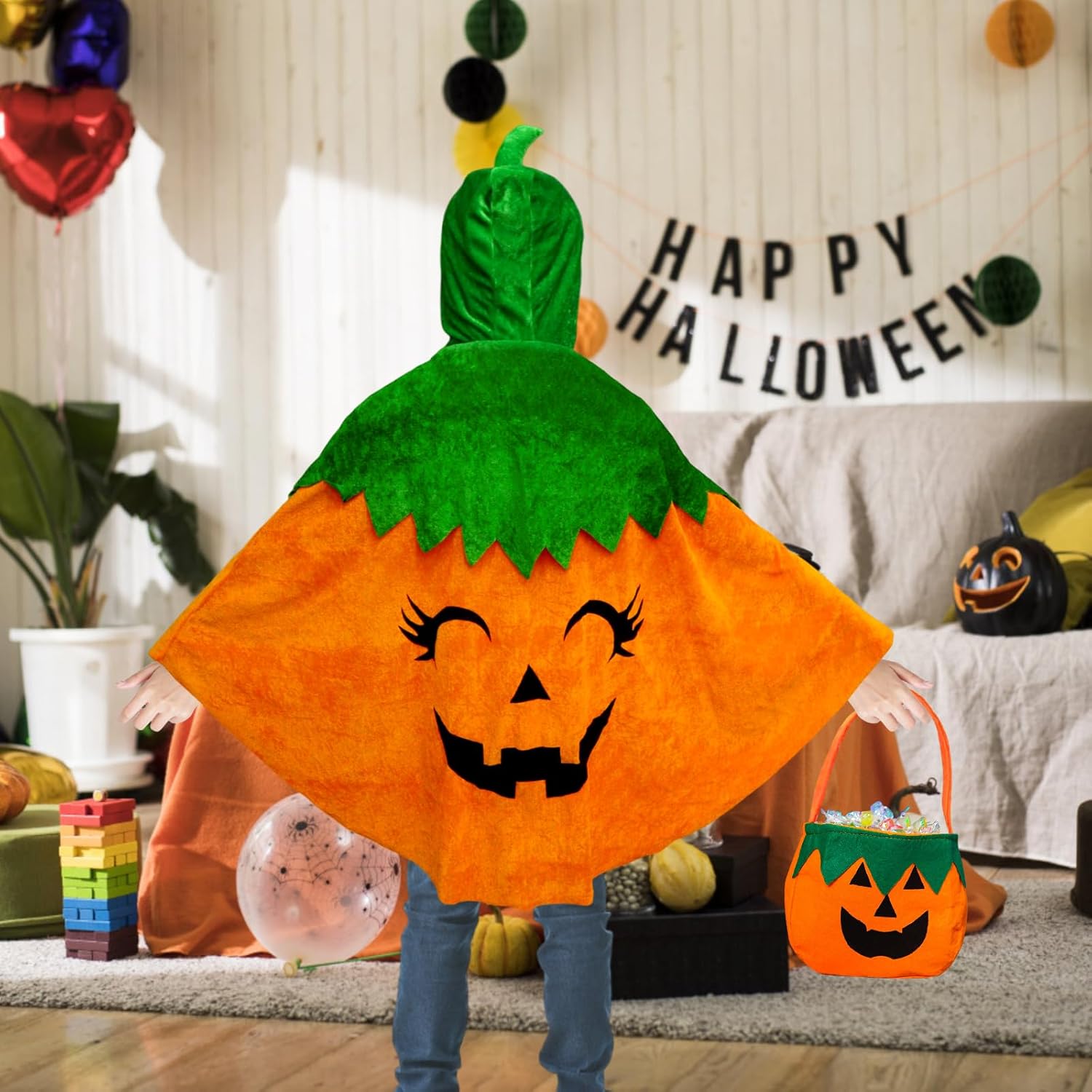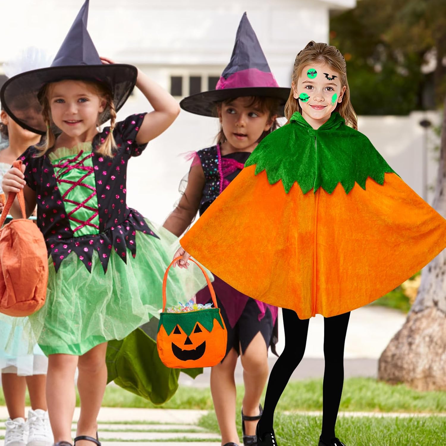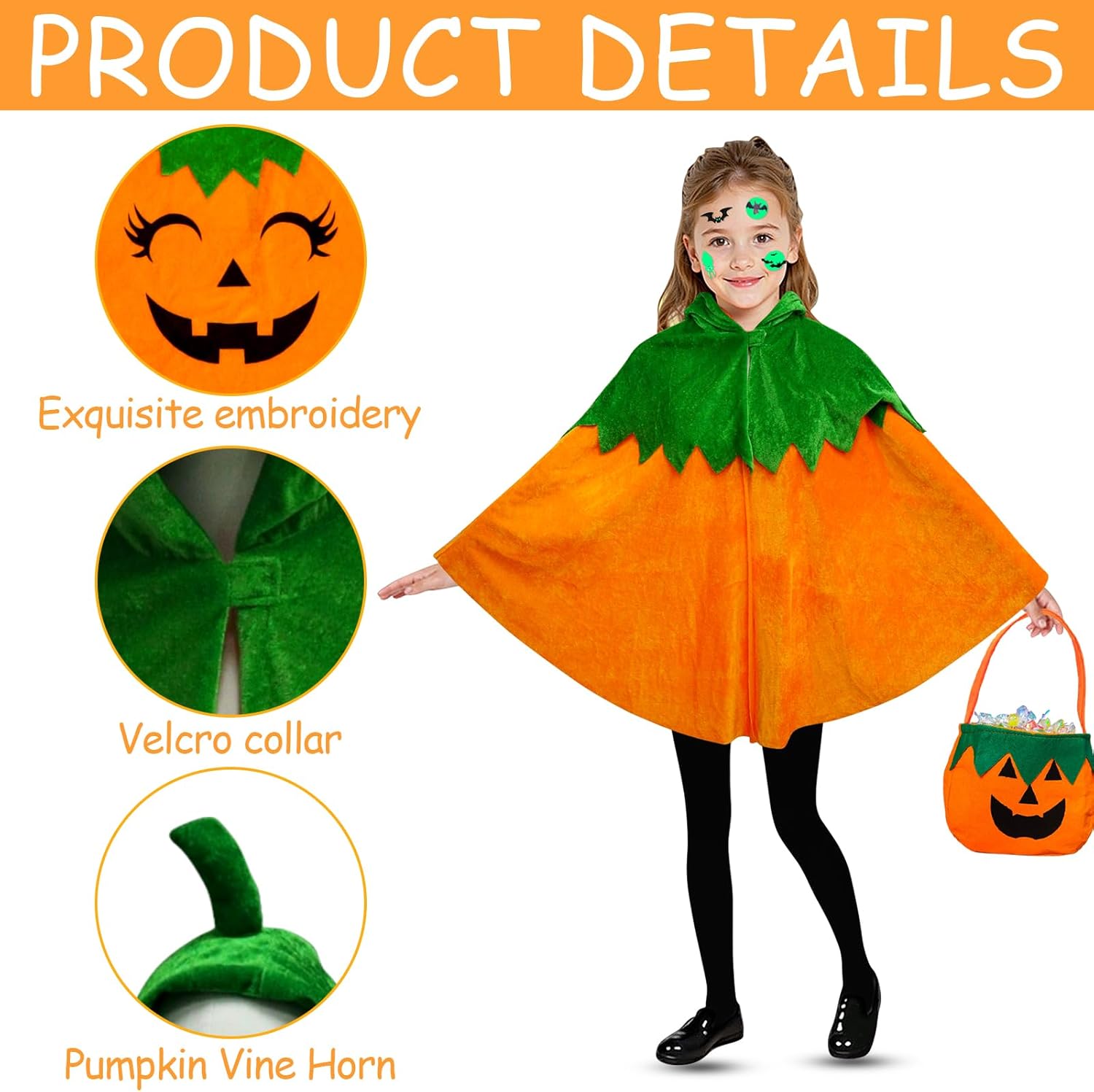 Descrizione prodotto Costume da zucca per Halloween, 4 pezzi, costume da zucca per bambini, costume da zucca con sacchetto di zucca, tatuaggi per Halloween, carnevale, ragazzi e ragazze, cosplay, performance sul palcoscenico Specifiche del prodotto: Nome del prodotto: Halloween zucca costume bambini Materiale: peluche corto. Peso: 240 g. Aspetto: zucca Contenuto della confezione: - 1 costume da zucca di Halloween per bambini. - 1 sacchetto di zucca. - 2 tatuaggi con pipistrello. Caratteristiche: - Il set completo di costume da zucca di Halloween include 1 mantello da zucca per bambini, 1 borsa per il trasporto di zucca e 2 tatuaggi fluorescenti con pipistrelli che ti permettono di trasformarti immediatamente in una piccola zucca luminosa ad Halloween. - Il colore arancione in combinazione con un colletto verde dà un classico design a zucca, il mantello di zucca per bambini è perfetto per feste di Halloween, cosplay, "dolcetto o scherzetto" e altre occasioni, rendendolo la scelta ideale per abiti da festa Precauzioni: - Le dimensioni e i pesi sono misurati manualmente, pertanto potrebbero esserci delle leggere variazioni - Costume da zucca di Halloween per i bambini dovrebbe essere vestito con l'aiuto di adulti Avviso di sicurezza No