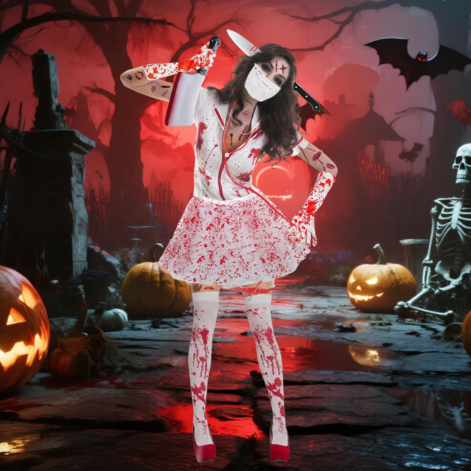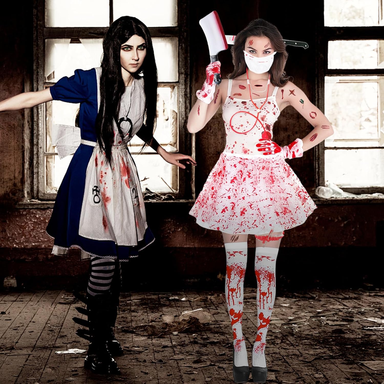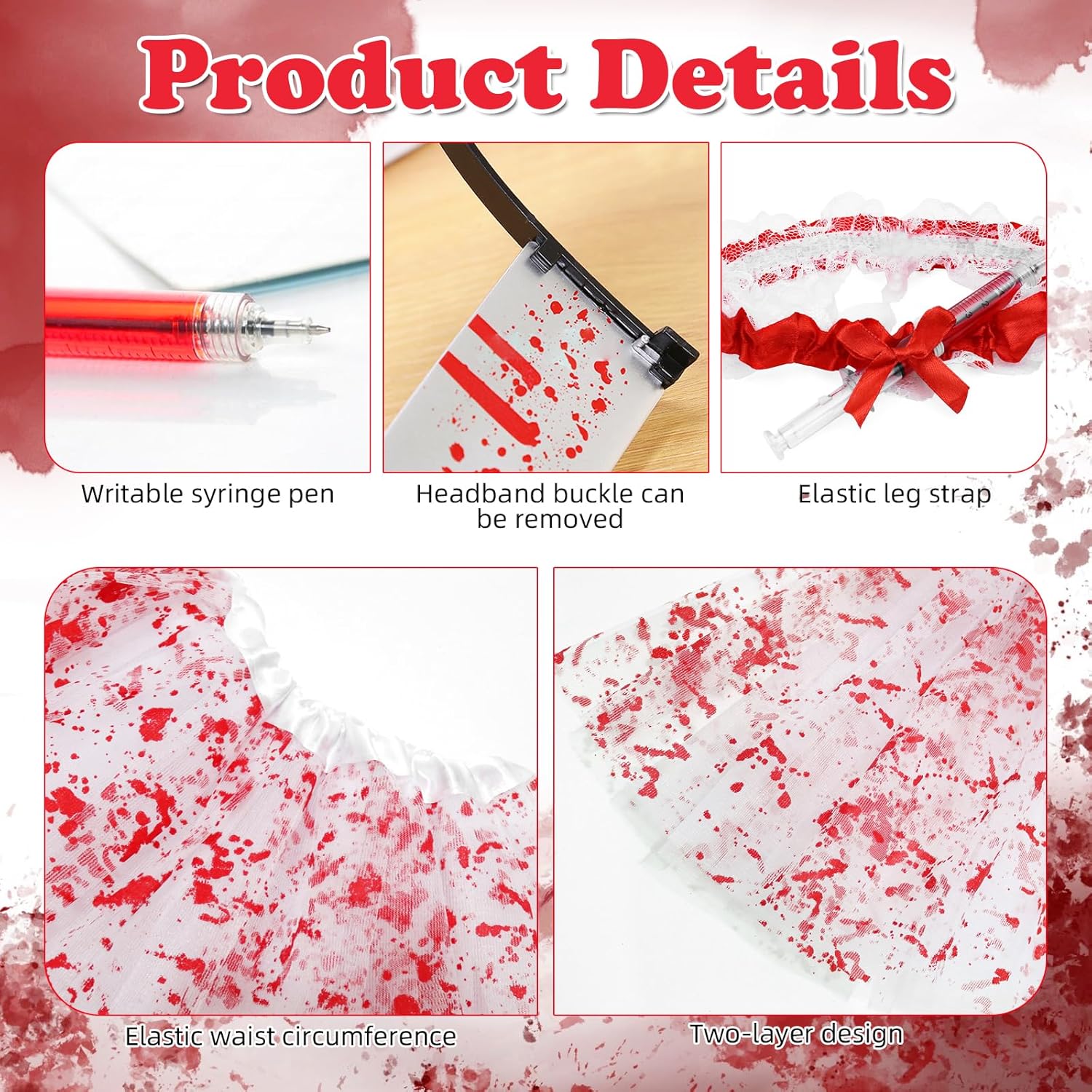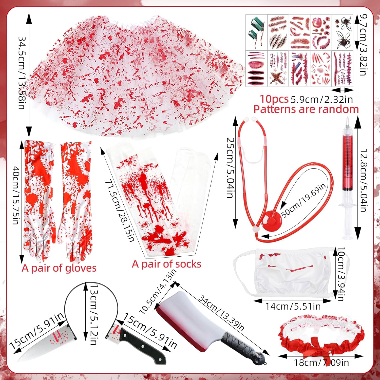 Costume da infermiera di Halloween: riceverai 1 tutù in tulle a due strati con macchie di sangue, 1 paio di calze sanguinanti, 1 paio di guanti sanguinanti, 1 coltello per Halloween in testa, 1 coltello falso, 1 maschera con sangue, 1 penna da infermiera, 1 accessorio per le cosce, 1 stetoscopio, 10 tatuaggi di Halloween Materiali di alta qualità: il costume da infermiera di Halloween è realizzato con materiali di alta qualità, un elastico in vita, il tessuto è leggero e traspirante, quindi è comodo da indossare, ha una taglia media che si adatta alla maggior parte delle persone Effetto horror: il costume da zombie da donna è estremamente spaventoso e realistico. Gli accessori per infermieri macchiati di sangue creano un'atmosfera inquietante. Il copricapo con il coltello completa l'intero costume e ti fa sembrare un vero zombie Tatuaggi con cicatrici di Halloween: per i tatuaggi con cicatrici di Halloween ci sono diversi modelli tra cui scegliere. Questi tatuaggi possono essere applicati su qualsiasi parte del corpo, che si tratti di braccia, gambe, collo o viso, realistici e naturali. Sorprenderà sicuramente i tuoi amici Versatile: il costume da infermiera horror renderà la tua festa di Halloween ancora più divertente. È adatto per diverse occasioni come feste di Halloween, feste a tema horror, carnevale, giochi di ruolo, feste in costume, carnevale, cosplay, ecc