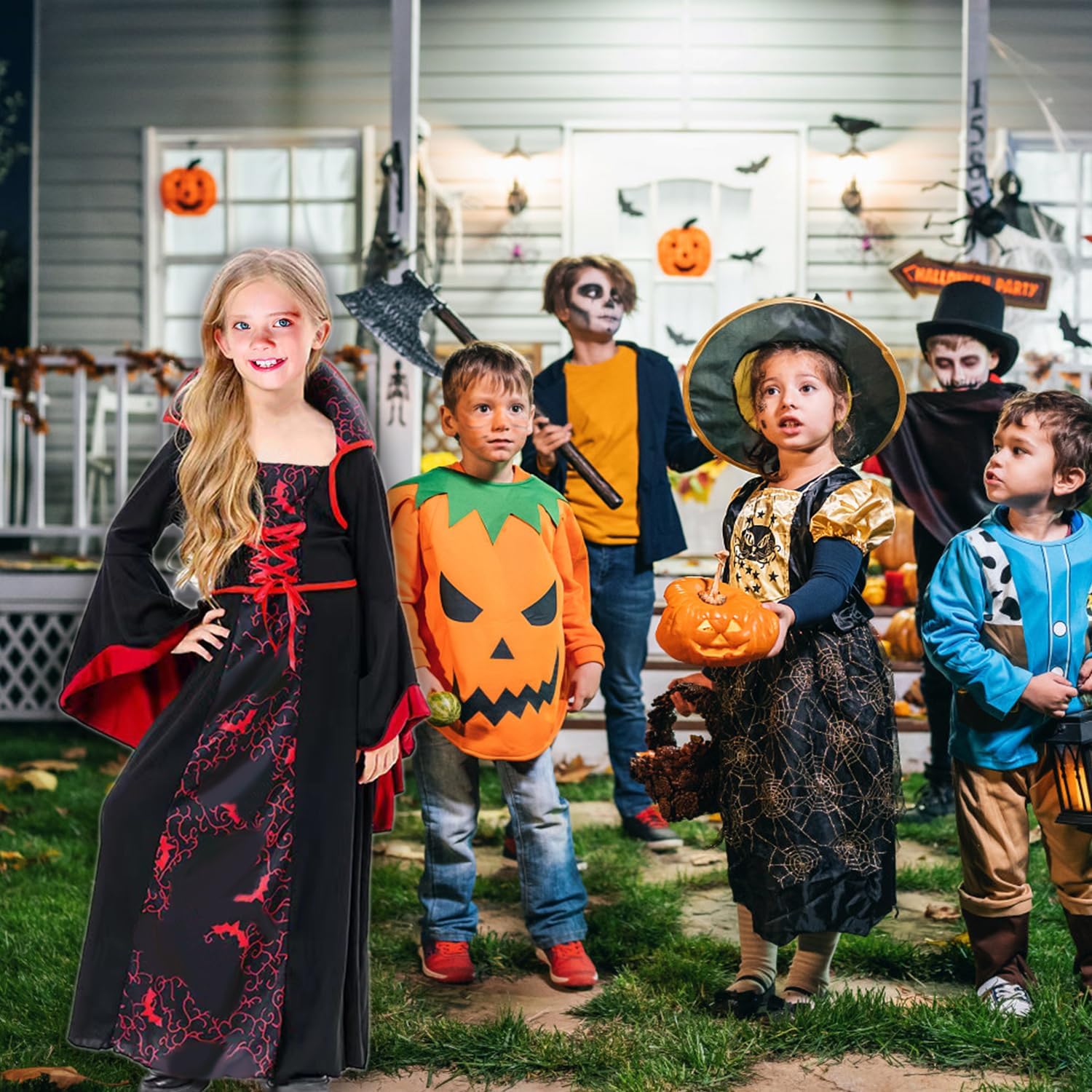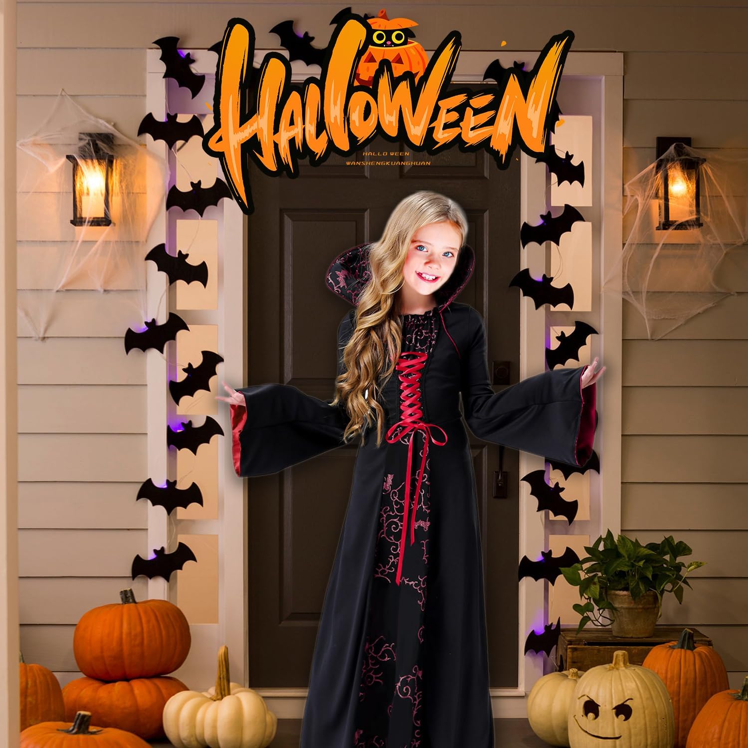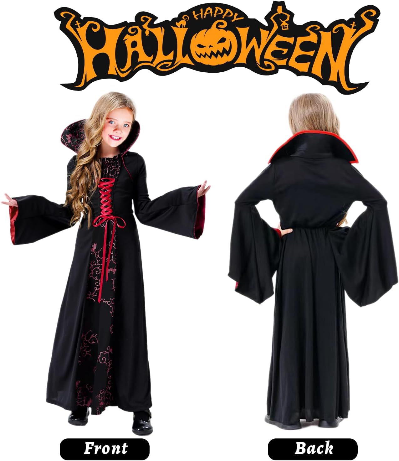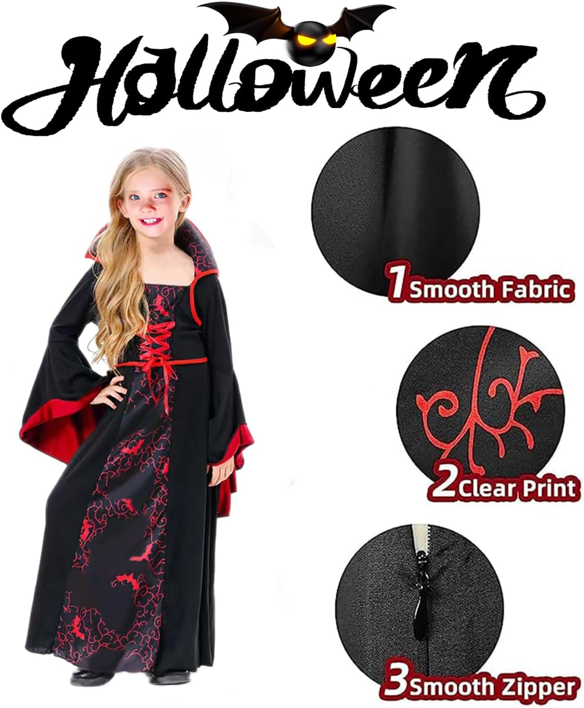 Descrizione prodotto Costume halloween bambino vampiro ha una stampa vintage, un colletto stand-up, maniche lunghe a campana fluenti e un orlo. I costumi sono in stile regina, carini ed eleganti, quando indossi questo costume da vampiro per ragazze, la tua ragazza sarà tagliente e cool come un vampiro assetato di sangue, sarà il personaggio principale della festa. Vampirina vestito bambina è disponibile in 6 taglie per bambini, adatto per le dimensioni del corpo da 110cm-160cm. Costume vampirina bambina molto adatto feste di Halloween, feste a tema vampiro/gotico, feste a tema Dracula, vampiro/accessori, costume da maga, costume da dolcetto o scherzetto, carnevale, festa scolastica, festa spaventosa ecc. Avviso di sicurezza Nessun awvertimento applicabile