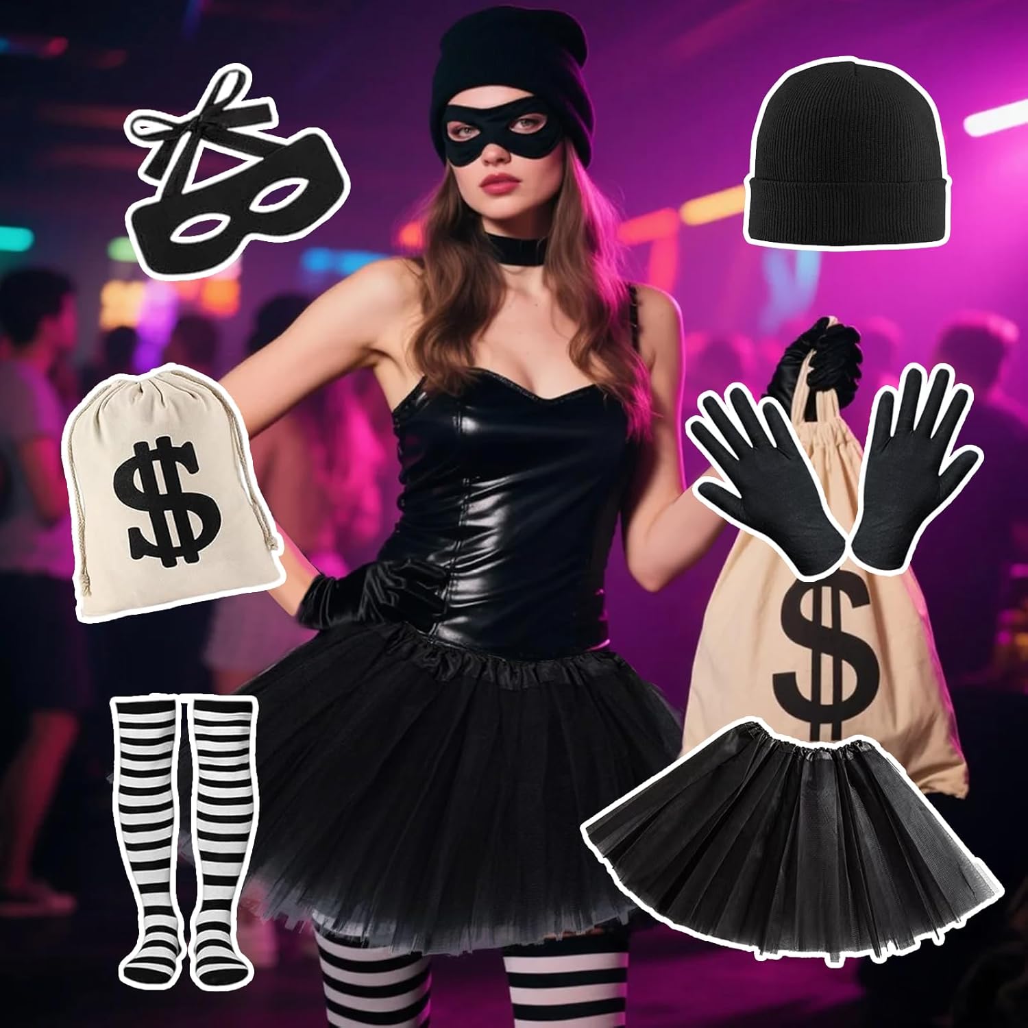 Descrizione prodotto La confezione include: 1 x gonna tutù 1 Paio calzini a righe 1 x berretto da ladro 1 Paio guanti 1 x maschera per gli occhi 1 x borsa portasoldi in tela Avviso di sicurezza No