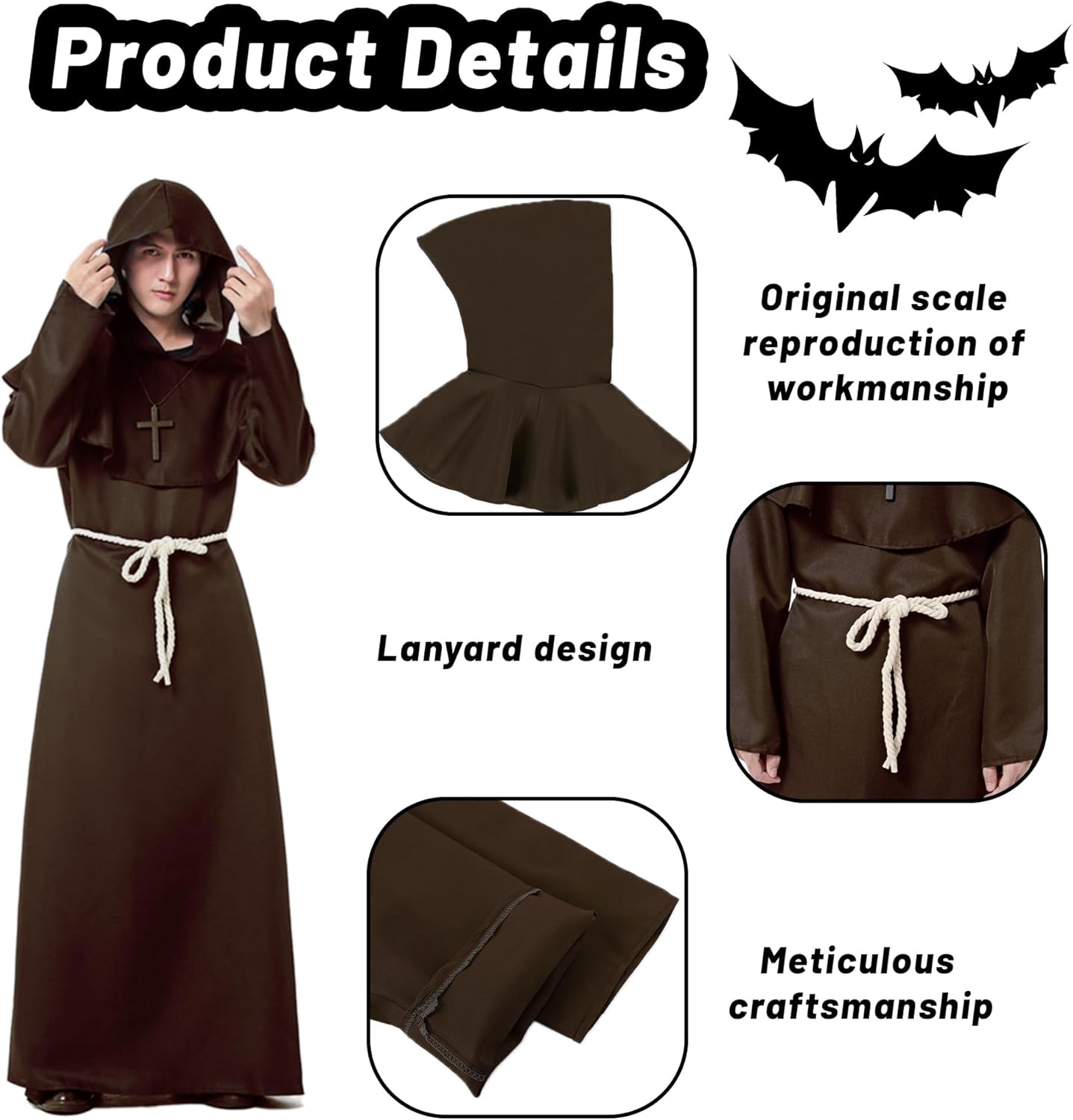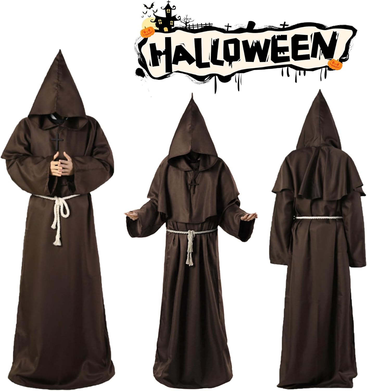 Descrizione prodotto 1. design super cool e qualità eccellente, veste medievale rinascimentale con cappuccio, cintura e collana a croce, perfetta per monaci, sacerdoti, pagani, maghi e altri costumi da gioco di ruolo! 2. la tunica con cappuccio da monaco e sacerdote è realizzata in fibra di poliestere, morbida e confortevole. Viene fornito con cappello mantello, cintura di corda, collana croce, accessori perfetti per il costume cosplay monaco sacerdote antico mago missionario. 3. mantello è oversize per nascondere il viso e guardare più misterioso! Il design con coulisse in vita lo rende facile da indossare e togliere, e la cintura inclusa può stringere la veste per adattarsi a una vasta gamma di dimensioni della vita. SUGGERIMENTI: Lavare in lavatrice e a mano Si prega di fare riferimento alla tabella delle taglie prima dell'acquisto Pacchetto incluso: 1×Vestaglia da monaco 1×Cappello con cappuccio 1×Cintura di corda 1×Croce Collana Avviso di sicurezza No warning