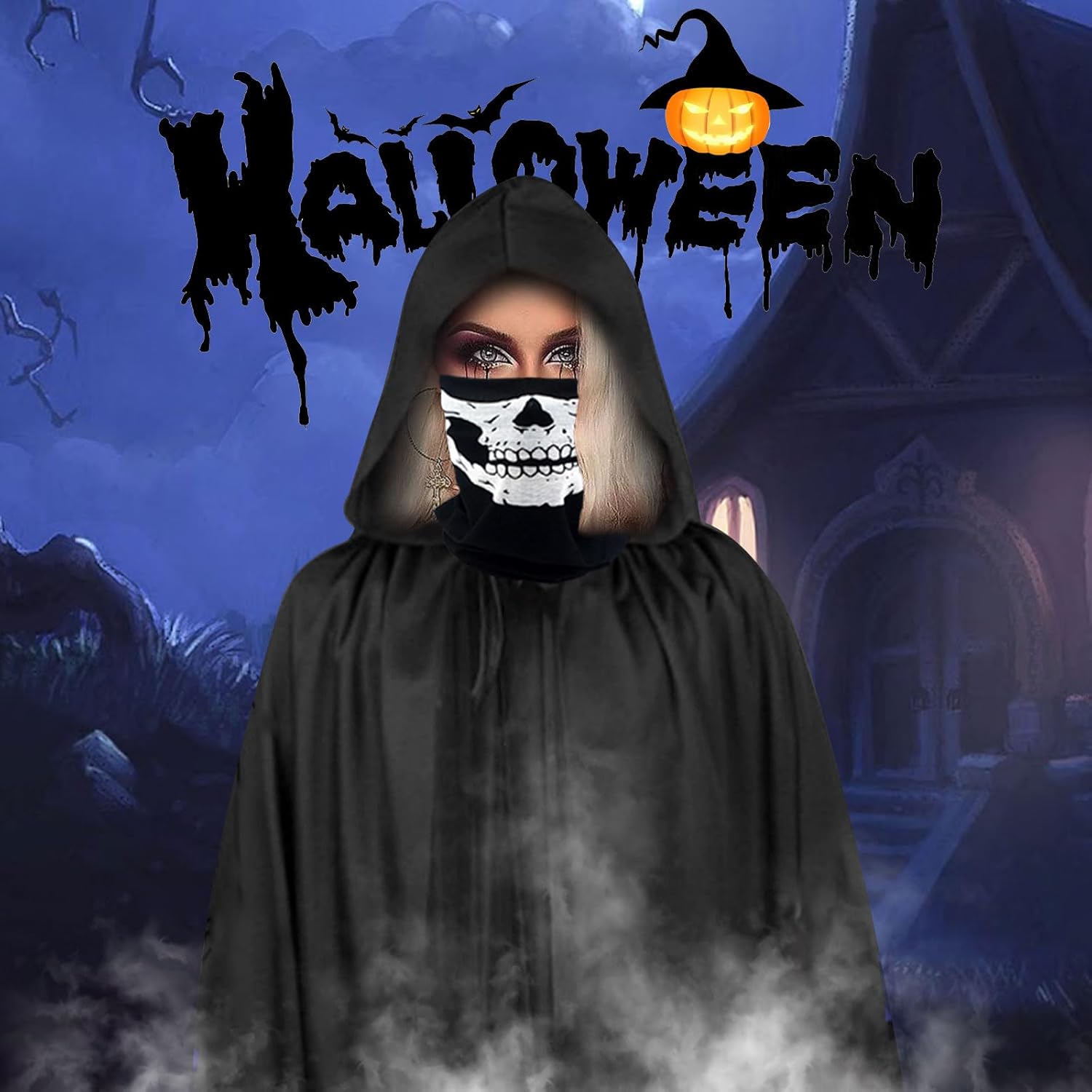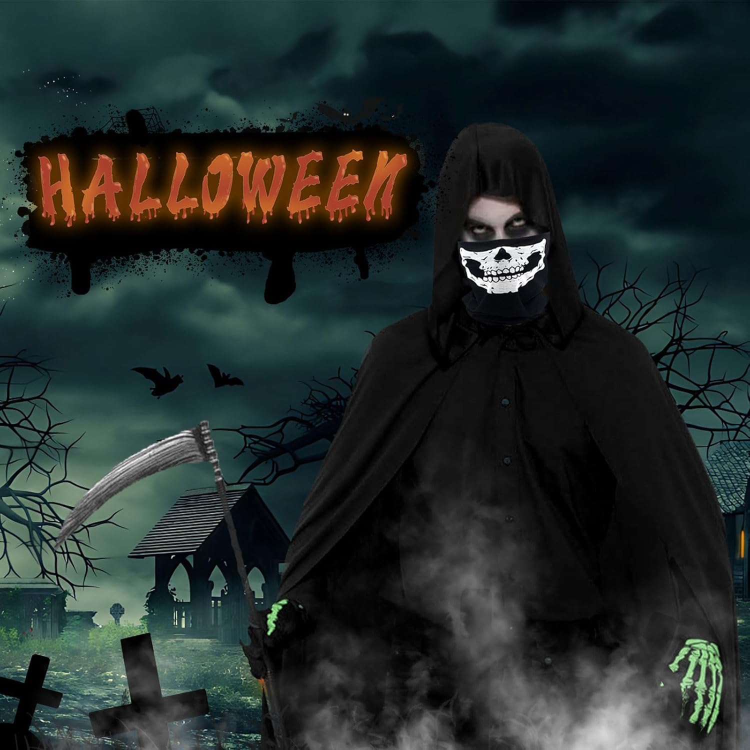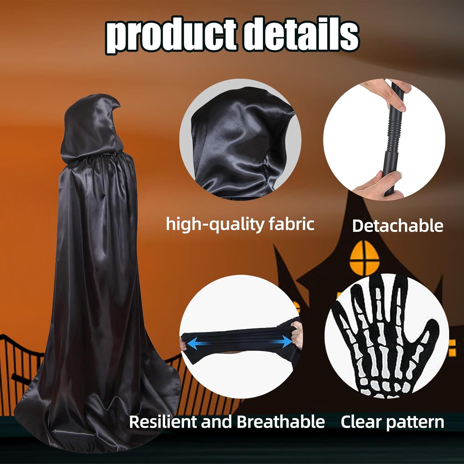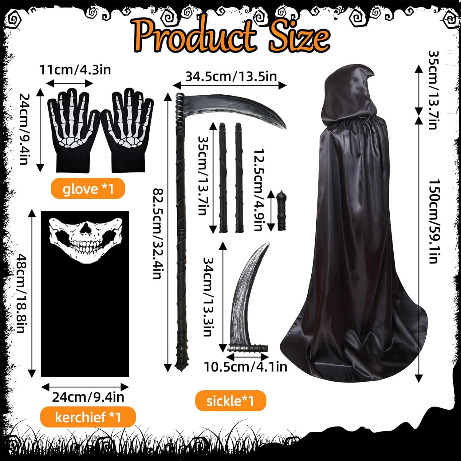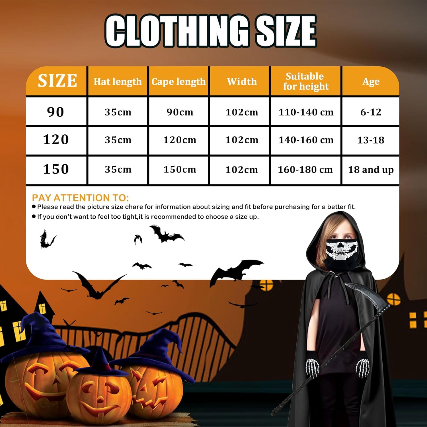 Also Halloweenkostüm für einen 12-jährigen genutzt. Ca 154cm groß und schlank. Hat gut gepasst. Sense ist nicht besonders hochwertig gearbeitet, aber für den Zweck völlig in Ordnung. Loop Schal lässt sich als Maske verwenden. Man kann durchschauen oder ihn unter den Augen tragen.