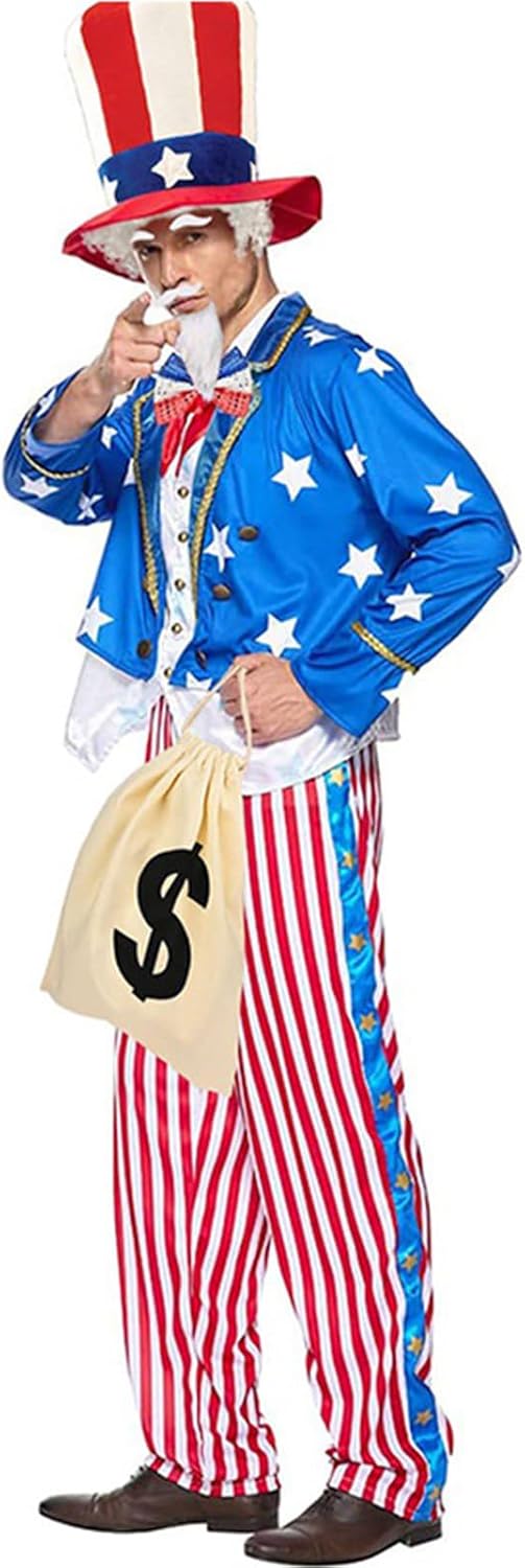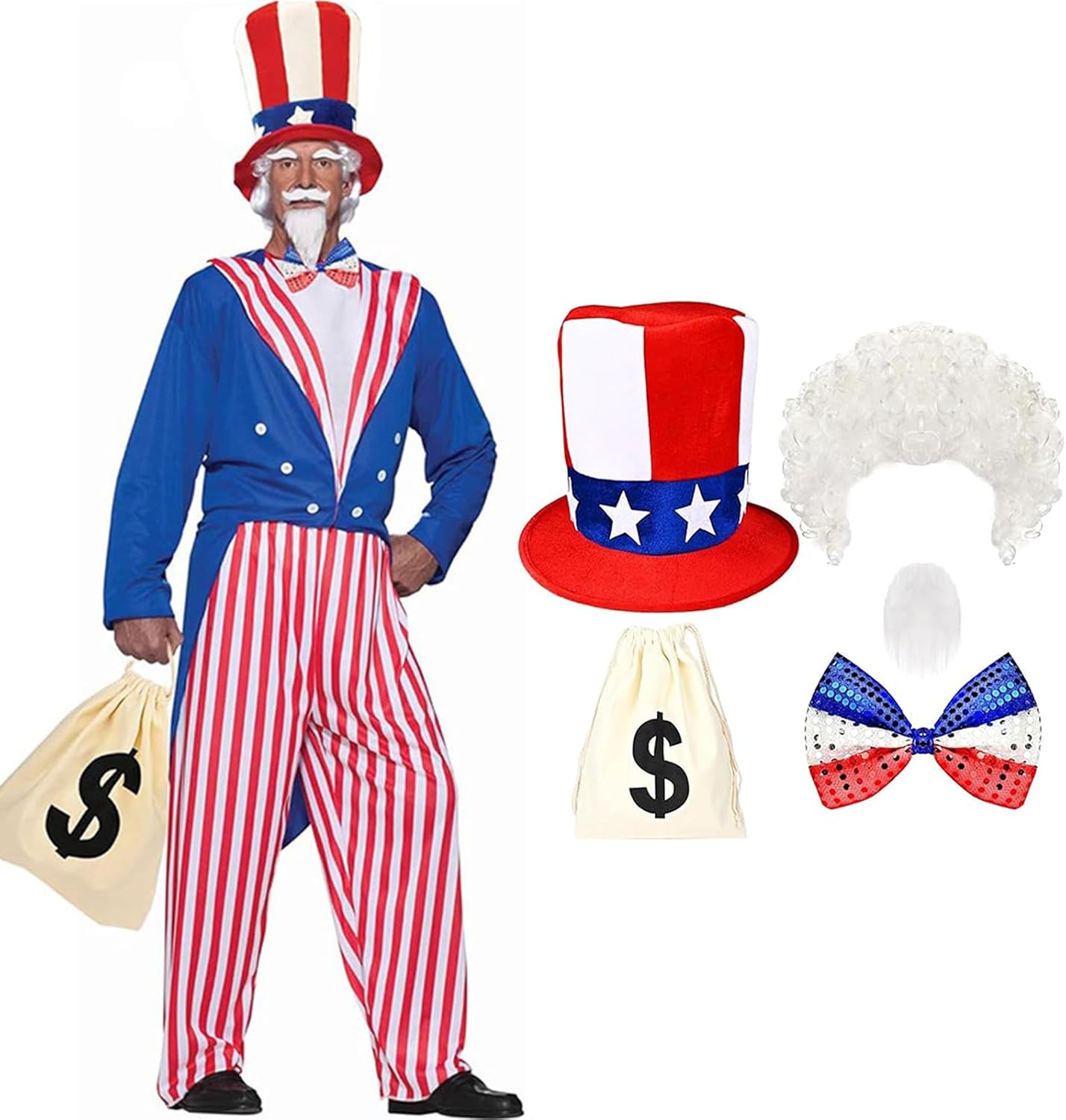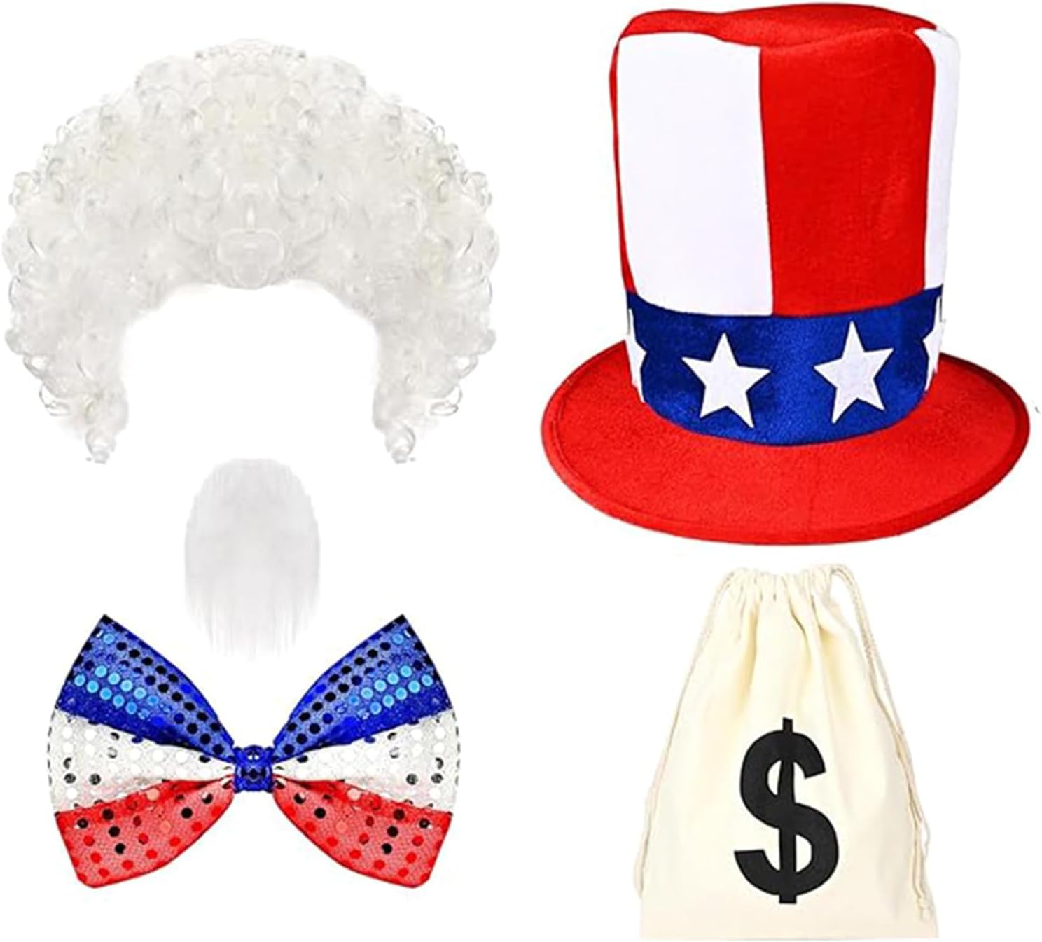 Costume patriottico da uomo, per il 4 luglio, accessori per costume da festival, include cappello, papillon, barbe e sacchetto per soldi Caratteristiche: Migliora la tua celebrazione del festival del 4 luglio con i nostri accessori per costume da zio patriottico, forniti con cappello piatto, papillon con paillettes, capelli artificiali bianchi, baffi artificiali, sacchetto di denaro con coulisse, migliora il tuo vestito patriottico ed eleva qualsiasi occasione festival. Realizzato in poliestere, questo cappello garantisce comfort e durata, rendendolo facile da abbinare a vari costumi per un look unico. Adatto per uomini, adulti, adolescenti, partecipanti alle celebrazioni del 4 luglio e appassionati di cosplay, questo accessorio è ideale per chiunque cerchi di mostrare il proprio patriottismo durante l'evento del 4 luglio. Che si tratti di partecipare a feste di celebrazione del Memorial Day, feste cosplay o riunioni di famiglia, questo abbigliamento da zio patriottico farà sicuramente una dichiarazione durante le feste del 4 luglio. Distinguiti ad Halloween con questo accessorio costume zio patriottico che completa la tua emozione patriottica evidenziando l'amore per la nazione. Specifiche tecniche: Colore: Bianco Rossore Blu Componente: poliestere. Dimensioni del cappello: circa 24 x 27 cm. Dimensioni papillon: ca. 9,4 cm. Dimensioni della barba: circa 19 x 14,50 cm. Dimensioni del sacchetto: circa 35 x 40 cm. Peso: circa 210 g. La confezione include: 1 cappello. 1 x capelli artificiali. 1 papillon con paillettes. 1 baffi artificiali. 1 sacchetto per soldi con coulisse. Nota: Si prega di considerare un margine di errore di 0-1 cm a causa della misurazione manuale. Assicurati di non avere un problema prima di fare un'offerta. 2. L'immagine potrebbe non rispecchiare il colore reale a causa delle diverse impostazioni dei monitor