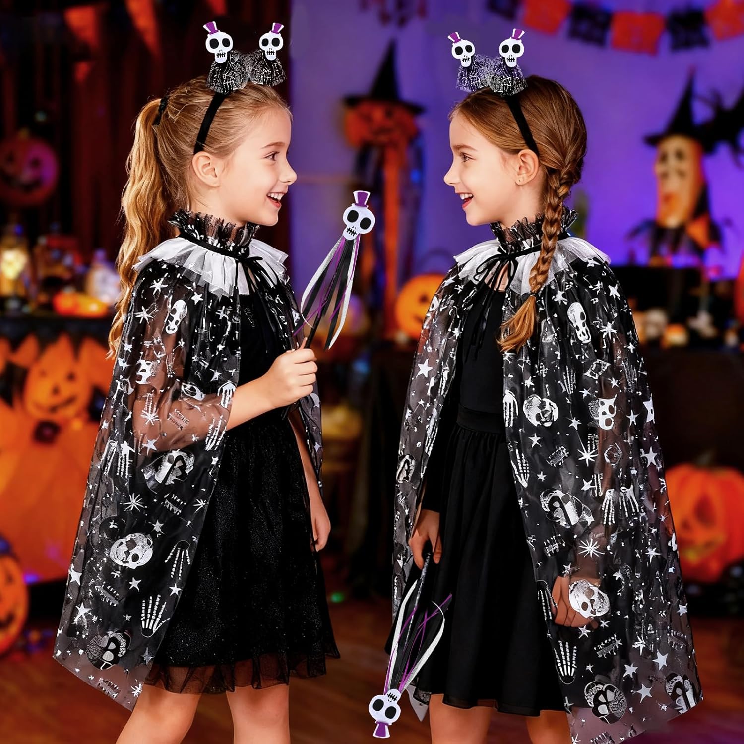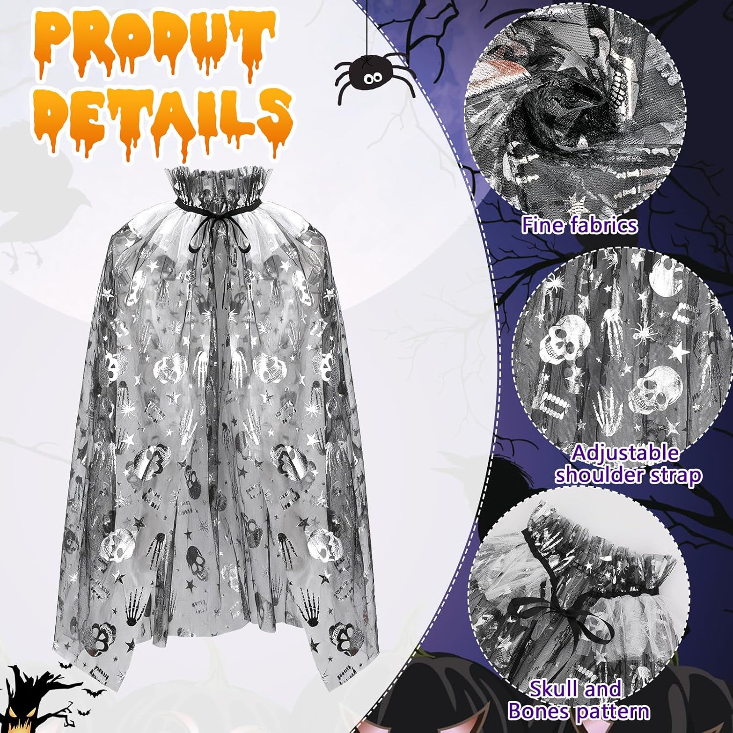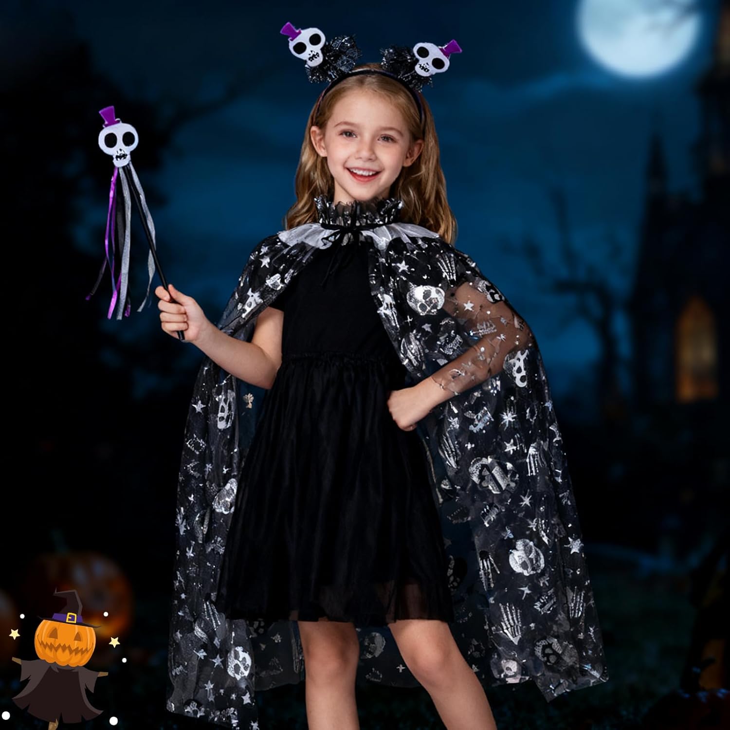 Costume di Teschio di Halloween: Include un mantello con teschio, un copricapo con teschio e una bacchetta con teschio per aiutare il tuo bambino a creare una trasformazione di Halloween affascinante. Mantello con Teschio: Questo mantello è realizzato in fibra di poliestere di alta qualità ed è adatto per una varietà di occasioni. Il design con laccio lo rende facile da indossare e togliere, e una taglia si adatta alla maggior parte. Cerchietto con Teschio: Questo cerchietto presenta un design di teschio bianco, fondendo mistero e dolcezza. Il design adorabile del teschio assicura che il tuo bambino si distingua a qualsiasi festa. Vestibilità Perfetta e Comfort: Questo set di costume da teschio per ragazze offre una vestibilità comoda e aderente, permettendo al tuo bambino di godersi le feste di Halloween senza compromettere il comfort. Versatile per molteplici occasioni: Che tu stia partecipando a una festa di Halloween, a un evento in costume o cercando di creare un look unico, questo costume di teschio di Halloween è la scelta perfetta per attirare l'attenzione di tutti.
