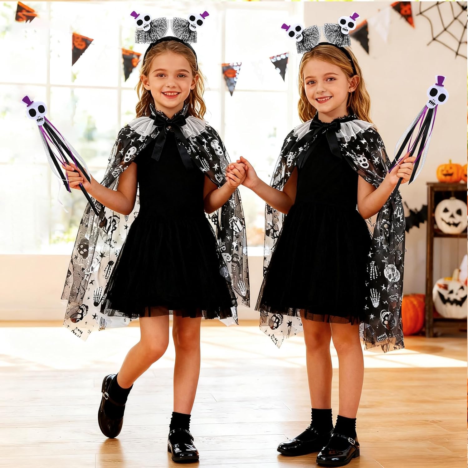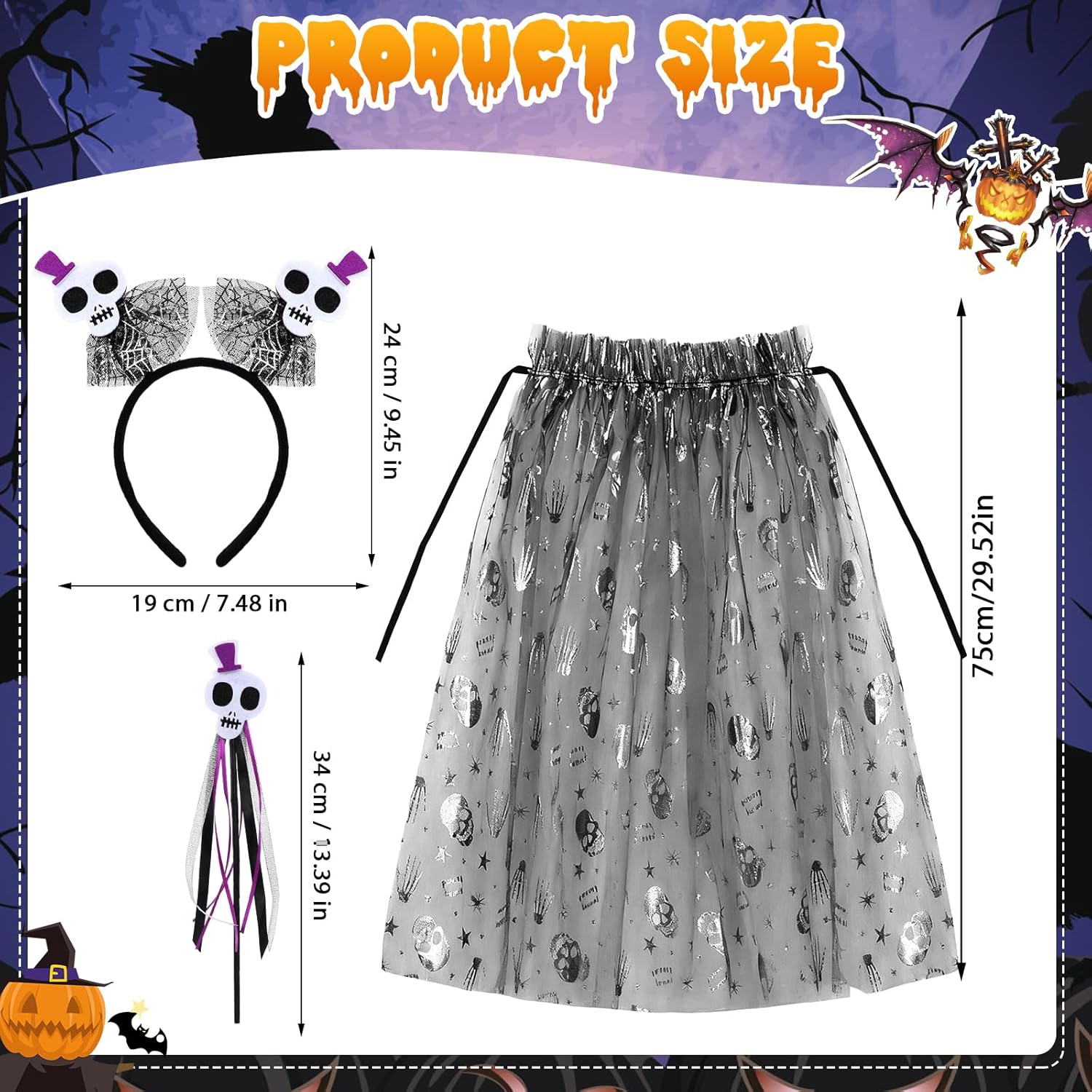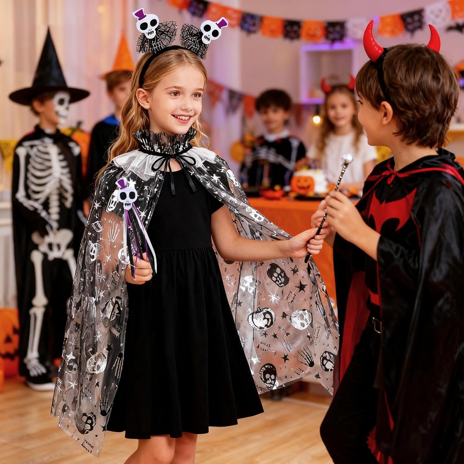 Costume di Teschio di Halloween: Include un mantello con teschio, un copricapo con teschio e una bacchetta con teschio per aiutare il tuo bambino a creare una trasformazione di Halloween affascinante. Mantello con Teschio: Questo mantello è realizzato in fibra di poliestere di alta qualità ed è adatto per una varietà di occasioni. Il design con laccio lo rende facile da indossare e togliere, e una taglia si adatta alla maggior parte. Cerchietto con Teschio: Questo cerchietto presenta un design di teschio bianco, fondendo mistero e dolcezza. Il design adorabile del teschio assicura che il tuo bambino si distingua a qualsiasi festa. Vestibilità Perfetta e Comfort: Questo set di costume da teschio per ragazze offre una vestibilità comoda e aderente, permettendo al tuo bambino di godersi le feste di Halloween senza compromettere il comfort. Versatile per molteplici occasioni: Che tu stia partecipando a una festa di Halloween, a un evento in costume o cercando di creare un look unico, questo costume di teschio di Halloween è la scelta perfetta per attirare l'attenzione di tutti.