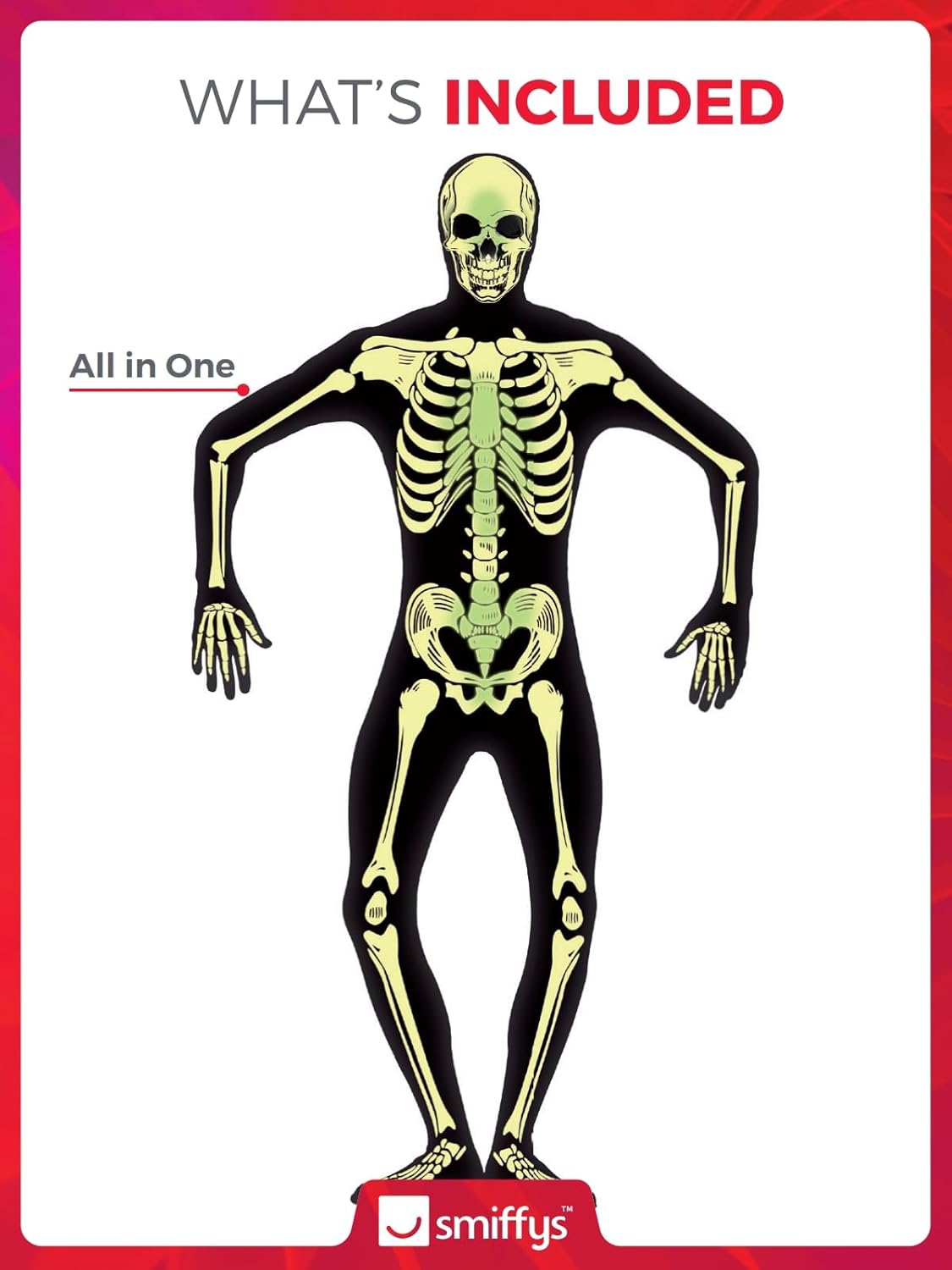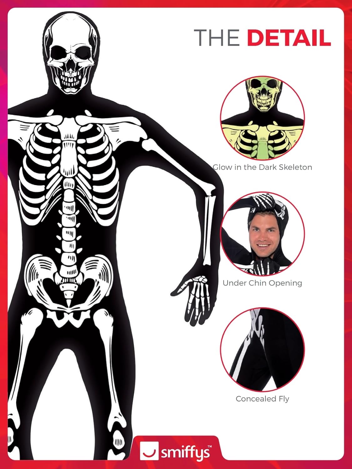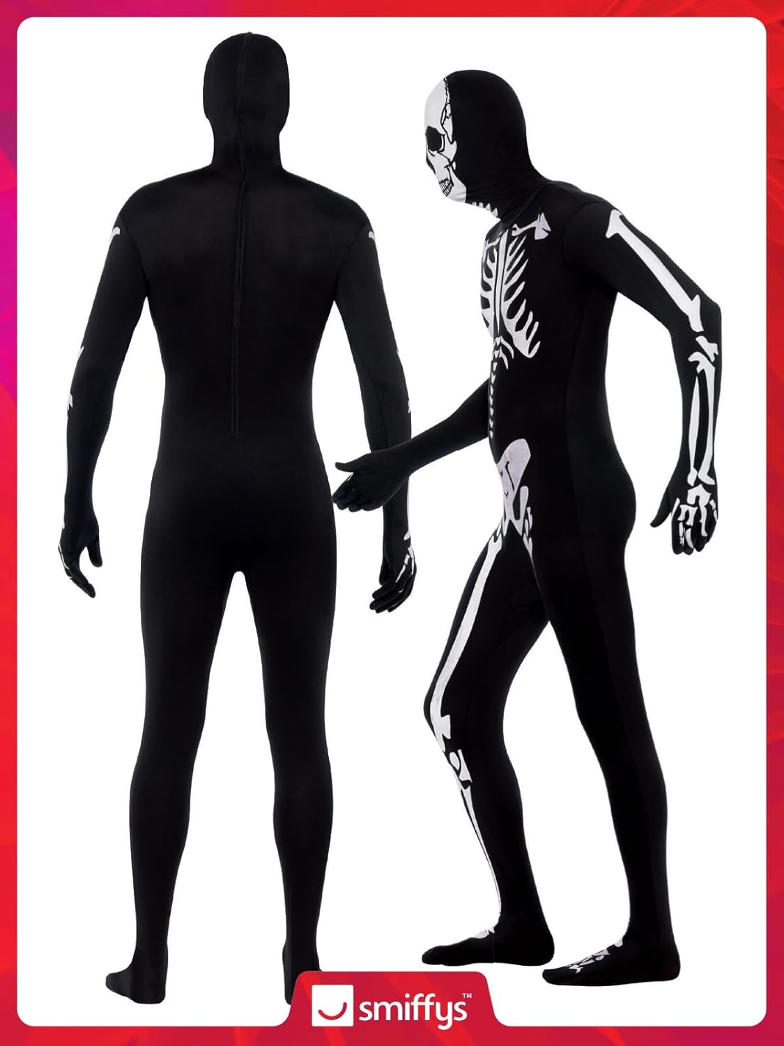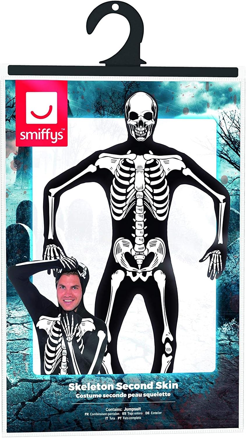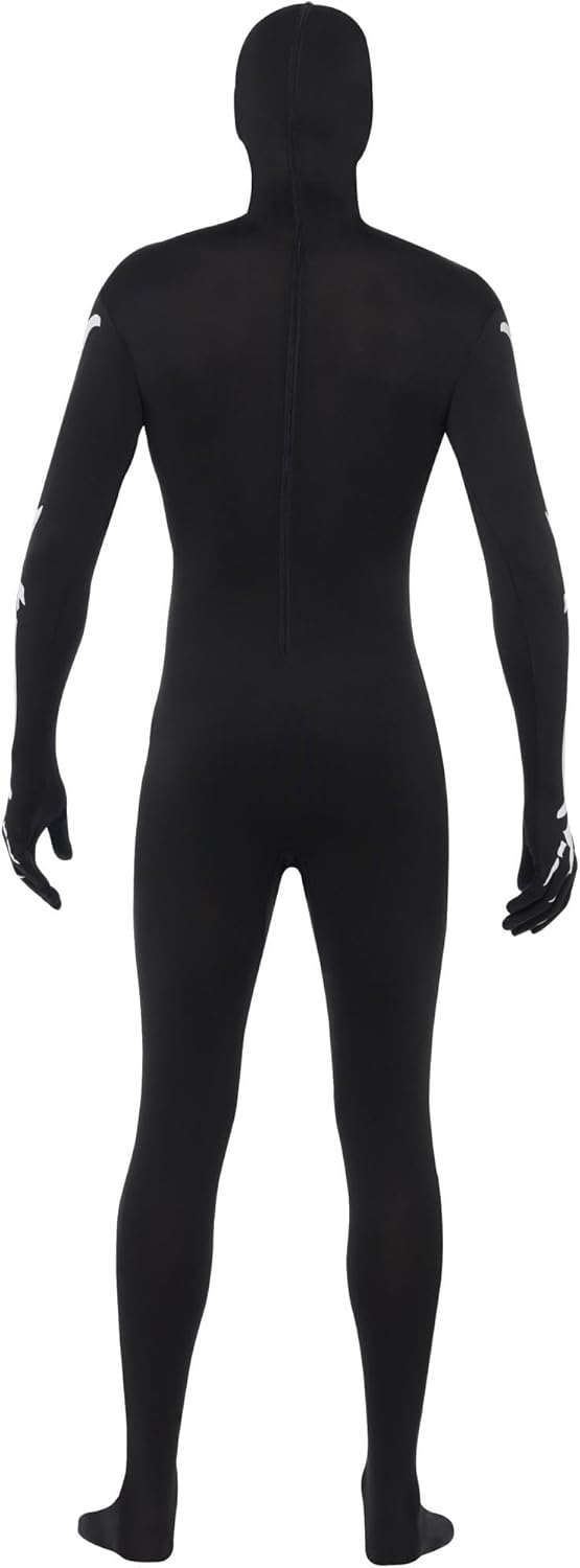 Costume seconda pelle da scheletro di Smiffys, nero con apertura sotto il mento e mosca nascosta, GID, costume per adulti di Halloween, costumi da scheletro