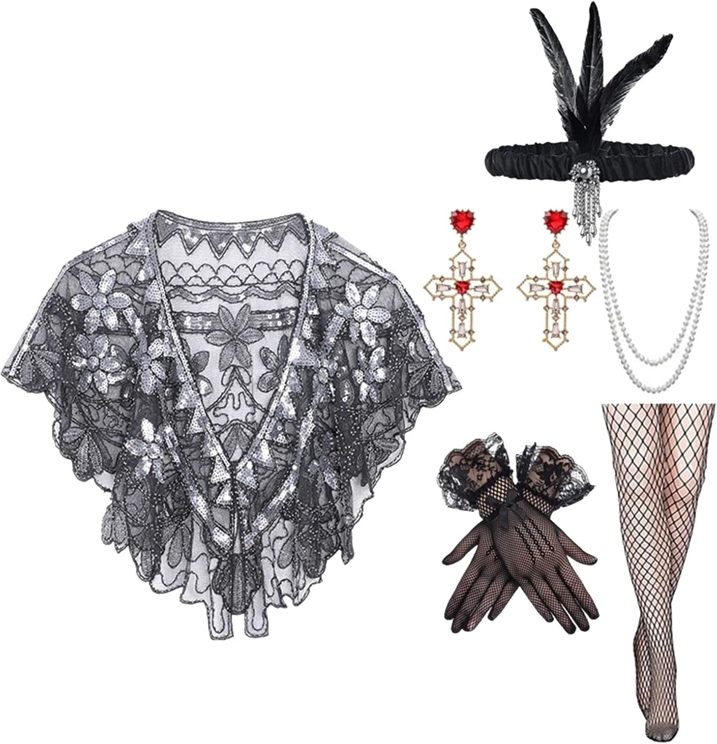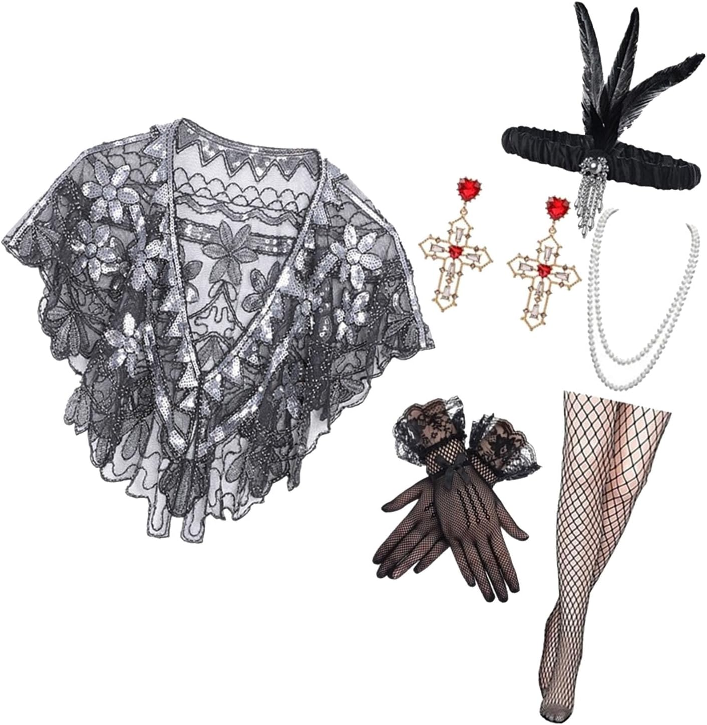 Costume vintage anni '20, da donna, con perline scintillanti, scialle da spalla, scialle e accessori eleganti per feste Caratteristiche: Il set di accessori Flapper anni '20 è una collezione completa, con scialle con paillettes e accessori di ispirazione vintage. Questo set include un copricapo flapper, collana di perle artificiali e guanti, orecchini anni '20, collant e scialle, tutto artigianale per un look autentico. Progettato per le donne che apprezzano la moda vintage, per coloro che cercano di fare una dichiarazione con eleganza e fascino in occasione di eventi a tema. Ideale per cocktail party anni '20, riunioni a tema, eventi cosplay e matrimoni, assicurandoti di distinguerti in qualsiasi folla. Con il suo tessuto in poliestere e l'attenzione ai dettagli, questo costume Flapper Set offrono comfort e raffinatezza, rendendolo un must per ogni appassionato di moda. Specifiche tecniche: Tessuto: fibra di poliestere. Colore: rosso, blu, oro nero, argento nero (opzionale) Lunghezza scialle: circa 45 cm. La confezione include: 1 scialle. 1 copricapo. 1 paio di orecchini. 1 paio di guanti. 1 collana di perline. 1 paio di collant. Nota: Considerare un margine di errore di 1-2 cm dovuto alla misurazione manuale. Si prega di consentire lievi differenze di colore dovute alla diversa risoluzione dello schermo.