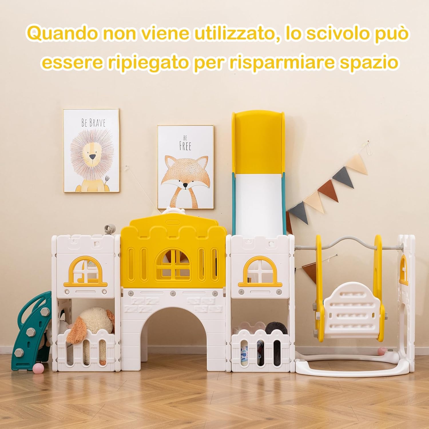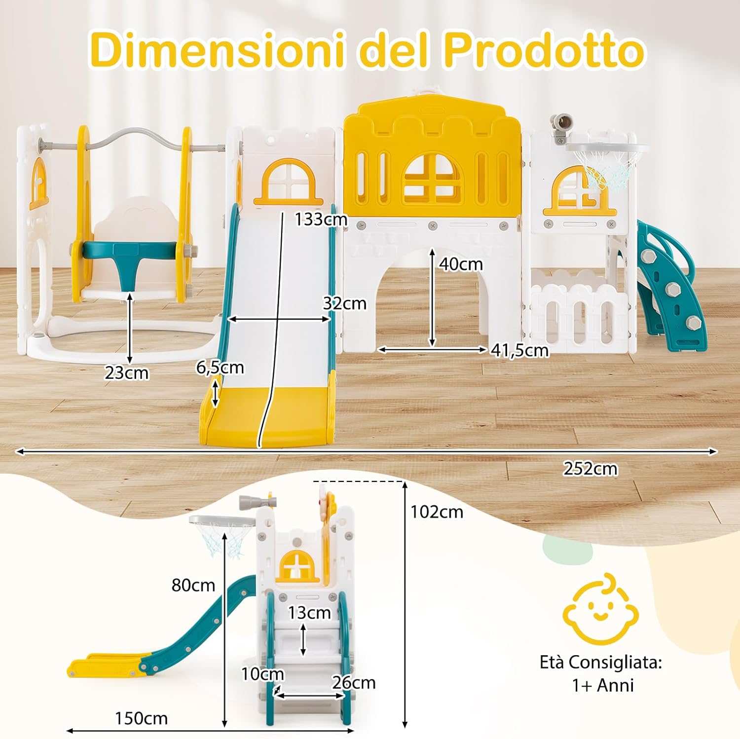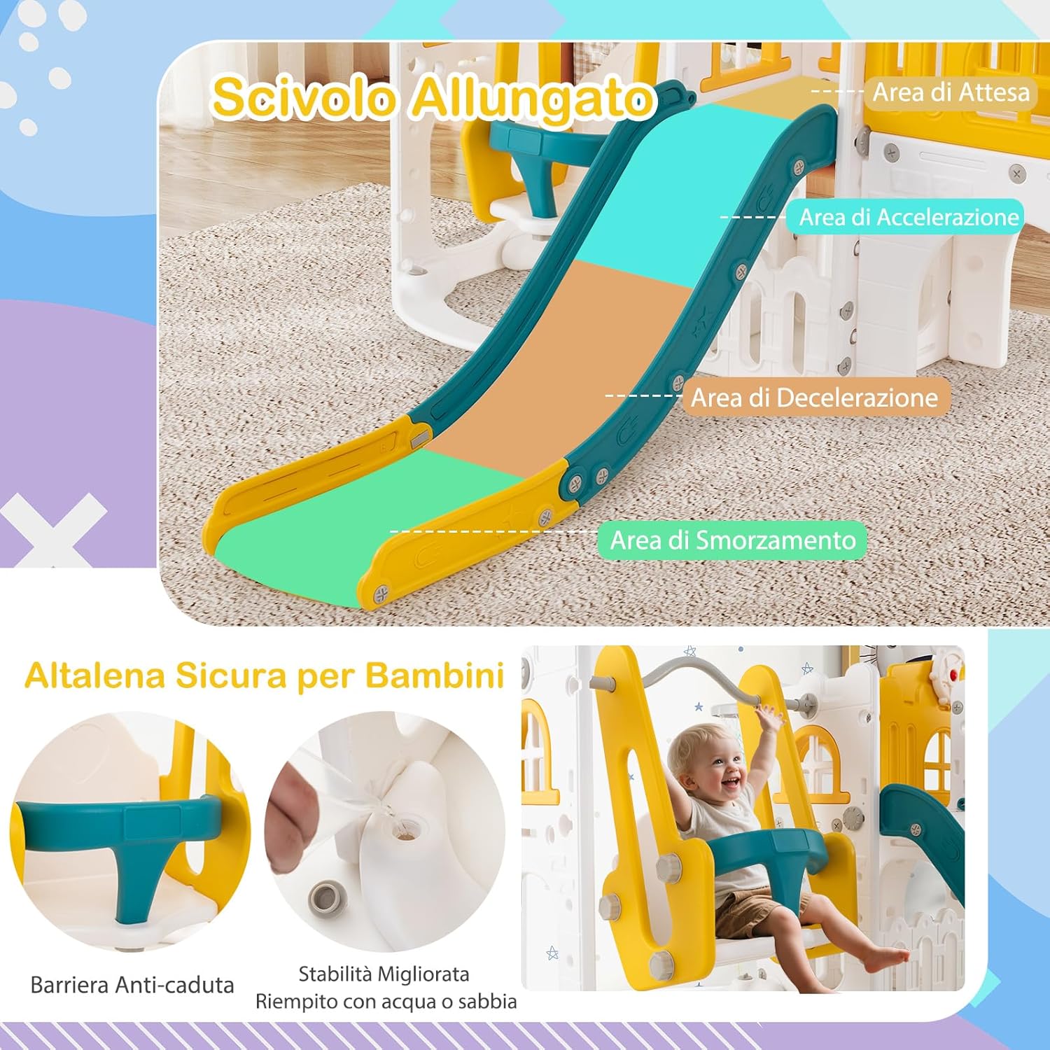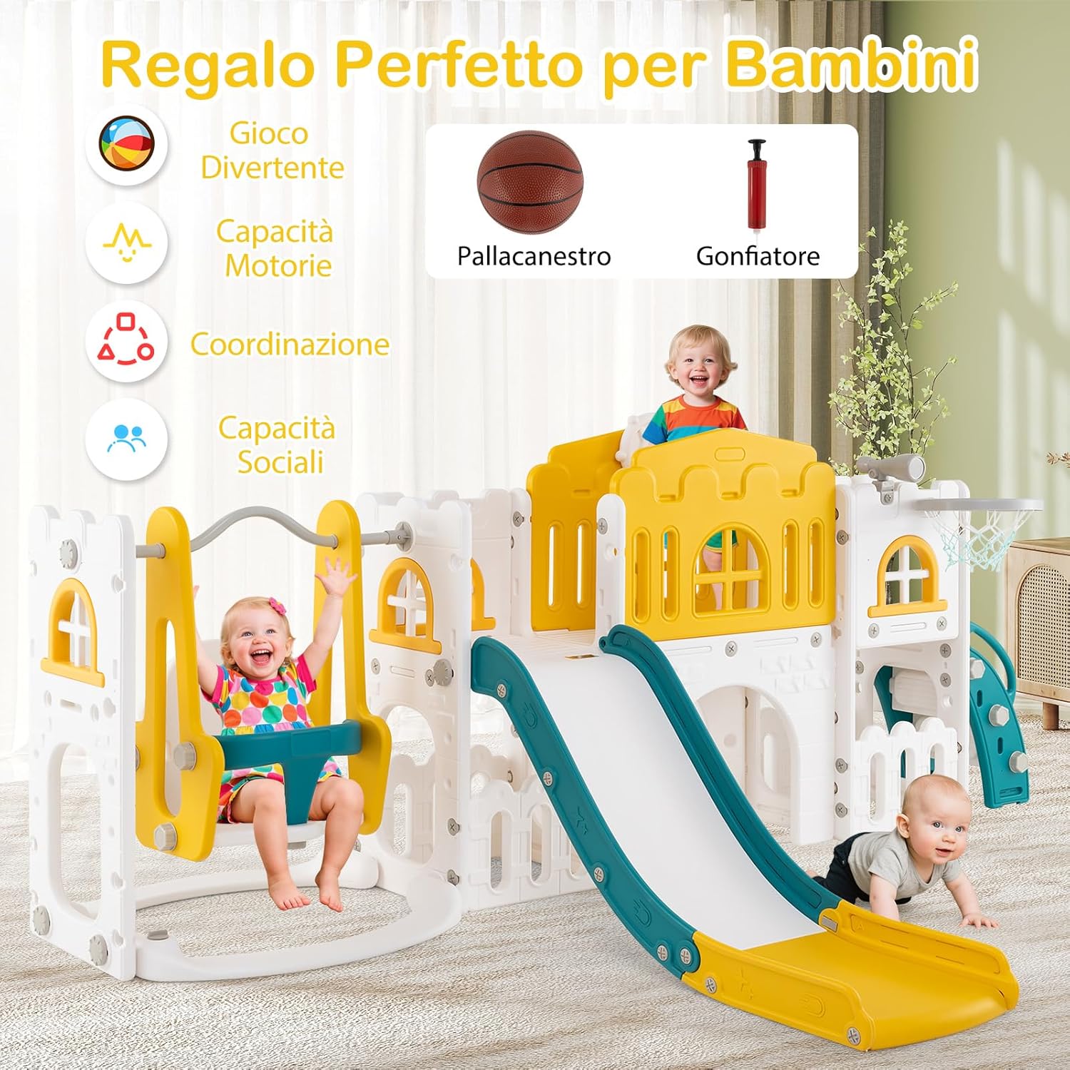 【Playset Multiattività】Lo scivolo per bambini piccoli include altalena, scivolo, spazio di archiviazione, volante, finestra a sorpresa, corridoio, tunnel di arrampicata, telescopio, scalatore e canestro da basket. Dotato di pallone da basket e gonfiatore, lo scivolo è progettato per intrattenere i tuoi bambini per ore di divertimento. 【Design Divertente e Pieghevole】Dotato di corrimano rialzati su entrambi i lati, lo scivolo è diviso in area di attesa/accelerazione/decelerazione/ammortizzazione per un'esperienza di scivolata sicura ma emozionante. Inoltre, puoi piegare lo scivolo per risparmiare spazio quando il parco giochi interno non è in uso. 【Garantire Sicurezza】L'altalena per bambini è dotata di parapetto anti-caduta e base riempibile con sabbia o acqua per stabilità migliorata. Con corrimano laterali, lo scalatore di questo set scivolo e altalena per bambini presenta gradini completamente chiusi con texture antiscivolo per una maggiore sicurezza. 【Costruzione Sicura per Bambini】Realizzato con materiale HDPE di alta qualità, il set di gioco con scivolo e arrampicata per bambini esibisce alta resistenza e semplice manutenzione. Le superfici sono prive di bave e i bordi sono arrotondati per proteggere le mani e i corpi dei bambini, creando un ambiente sicuro per giocare. 【Opzione Regalo Perfetta】Questo parco giochi da interno è un regalo affidabile per bambini 1+ anni. Non solo incoraggia il divertimento, ma aiuta anche nello sviluppo di competenze essenziali come le capacità motorie, la coordinazione e le abilità sociali.