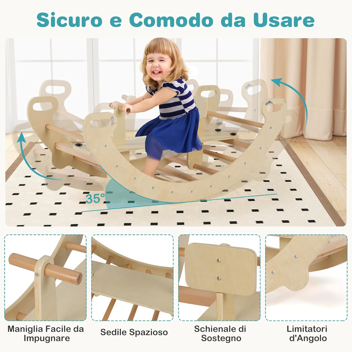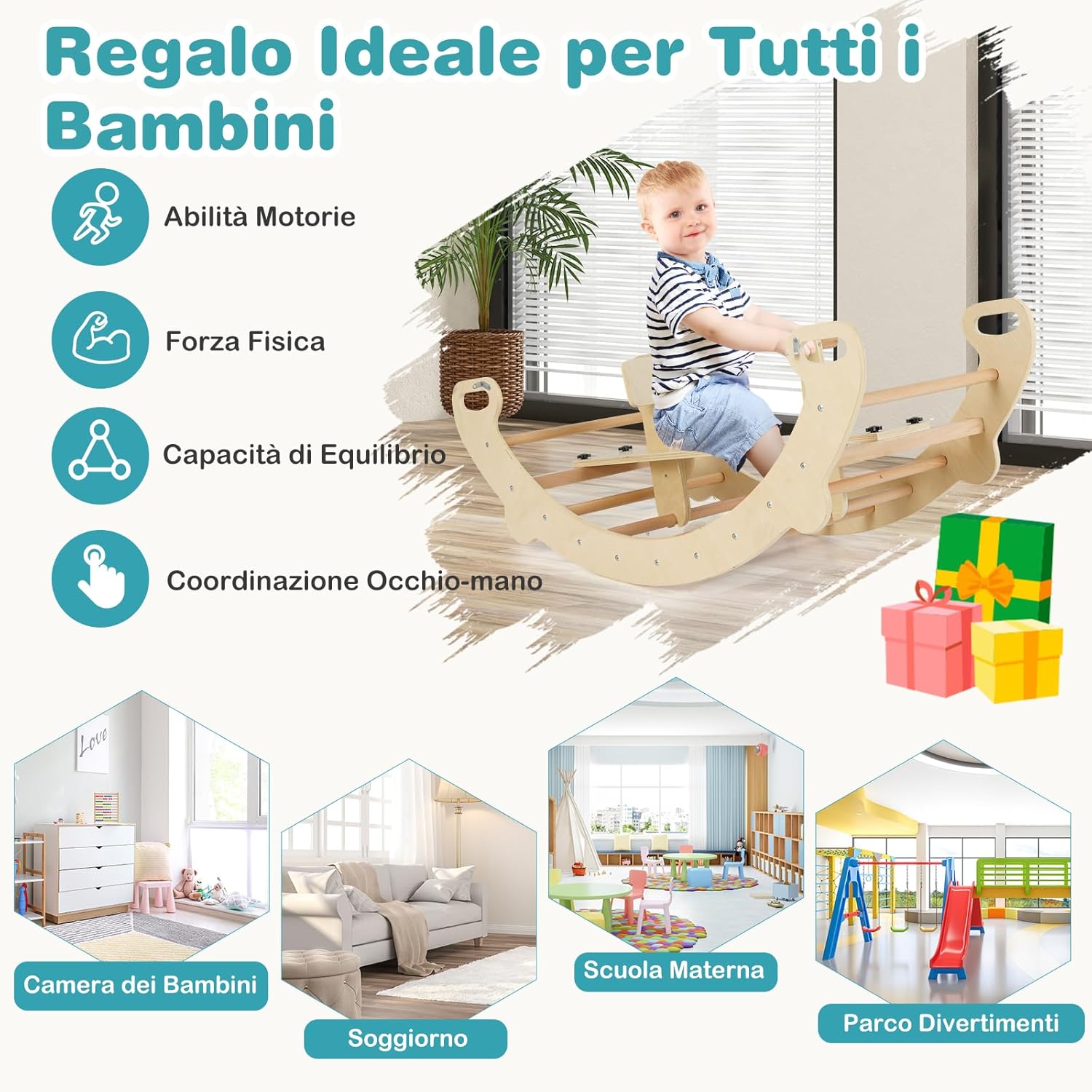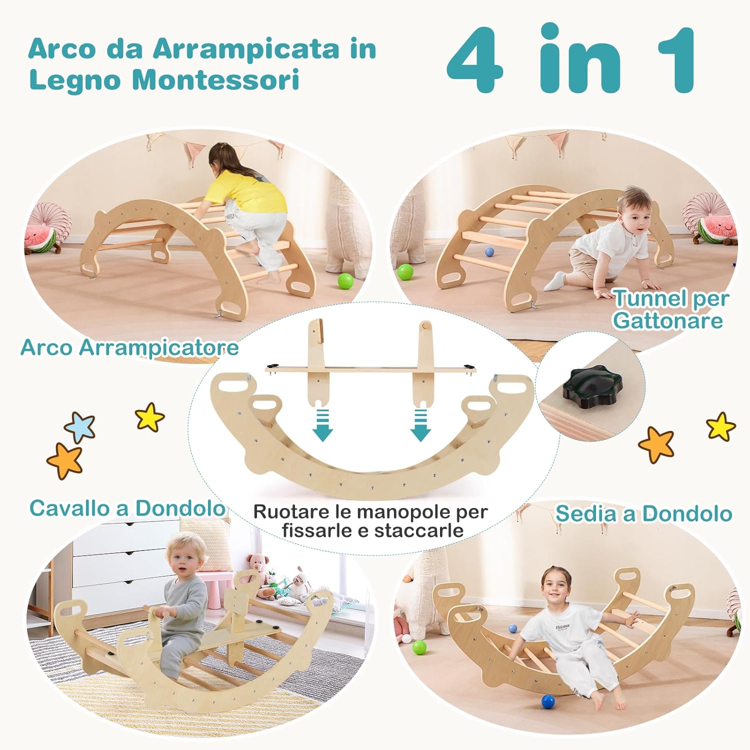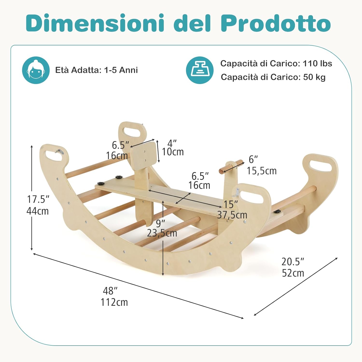 【Set di Gioco Divertente 4-in-1 per Bambini】Questo set di gioco indoor può essere utilizzato come cavallo a dondolo, sedia a dondolo, arco da arrampicata o tunnel rampicante per mantenere il tuo bambino intrattenuto. Puoi girare le manopole per fissare e staccare trasformandolo in diversi modi di gioco per adattarsi alle preferenze dei bambini. 【Sicuro e Confortevole per Dondolare】Con i limitatori d'angolo, l'oscillazione del cavallo a dondolo può essere limitata in modo sicuro a 35° per un dondolio stabile in avanti e all'indietro. I bambini possono afferrare facilmente la maniglia mentre si dondolano con gioia. Rispetta anche gli alti standard per una maggiore sicurezza. Lo schienale di supporto e il sedile spazioso garantiscono un comfort aggiuntivo. 【Costruzione Affidabile e Stabile】A differenza di altri archi cavalluccio a dondolo, questo set di gioco per arrampicata e dondolo presenta dispositivi anti-ribaltamento aggiuntivi per mantenerlo stabile e saldo. I bordi lisci e arrotondati garantiscono che la pelle delicata dei bambini non si graffi. Inoltre, le barre colorate in legno di faggio consentono ai bambini di afferrare senza sforzo mentre si arrampicano. 【Regalo Perfetto per Bambini】L'arco cavalluccio a dondolo versatile è un regalo ideale per i bambini dai 1 ai 5 anni per i loro compleanni, Natale o altre festività. Il dondolo a arco combina divertimento e attività di sviluppo delle abilità, permettendo ai bambini di esercitare la loro abilità di equilibrio, le abilità motorie e di coordinazione durante il gioco. 【Assemblaggio Senza Sforzo e Utilizzi Vari】La struttura semplice e il manuale utente dettagliato rendono l'assemblaggio un gioco da ragazzi. Le dimensioni sono 112 x 52 x 44 cm (L x P x A). Dopo l'installazione, il tuo piccolo potrà divertirsi nella stanza dei bambini, nel soggiorno, nell'asilo, o nel parco divertimenti.