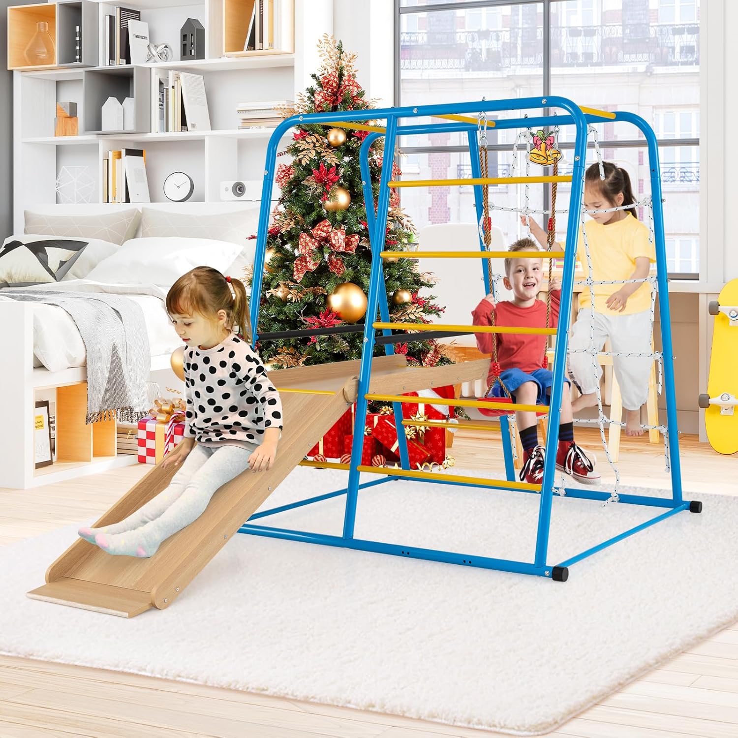 【Versatile 6 in 1】Questo parco giochi da interno offre una serie di spazi per il gioco, tra cui sbarre, una parete di arrampicata con corda, altalena, scala da arrampicata, scivolo e arrampicata. Questi spazi ricchi di divertimento intratterranno i piccoli per ore. 【Scivolo Divertente】Dotato di corrimano su entrambi i lati, questo scivolo presenta un'area d'attesa, un'area di scivolamento e un'area di ammortizzazione per garantire la sicurezza del tuo bambino. Con due opzioni di collocamento dello scivolo, puoi personalizzare l'area di gioco per adattarla perfettamente al tuo spazio. 【Altalena Regolabile e Comoda】Il set da arrampicata multifunzionale è dotato di un'altalena regolabile in altezza che cresce con il tuo bambino. L'altalena comoda per bambini ha un sedile curvato per un'esperienza di seduta sagomata, attaccata con solidi ganci per un supporto sicuro. 【Costruzione in Metallo Stabile】Costruito su un robusto telaio in metallo, il giocattolo da arrampicata 6-in-1 vanta alta durabilità e robustezza. I cuscinetti antiscivolo forniscono una maggiore stabilità, mentre i picchetti per il terreno inclusi possono essere usati se necessario. 【Regalo Fantastico per i Bambini】Questo parco giochi in metallo da interno è un regalo affidabile per bambini sopra i 3 anni. Favorisce l'apprendimento attraverso il gioco, migliorando la forza muscolare, la coordinazione, le abilità motorie, oltre all'interazione sociale.