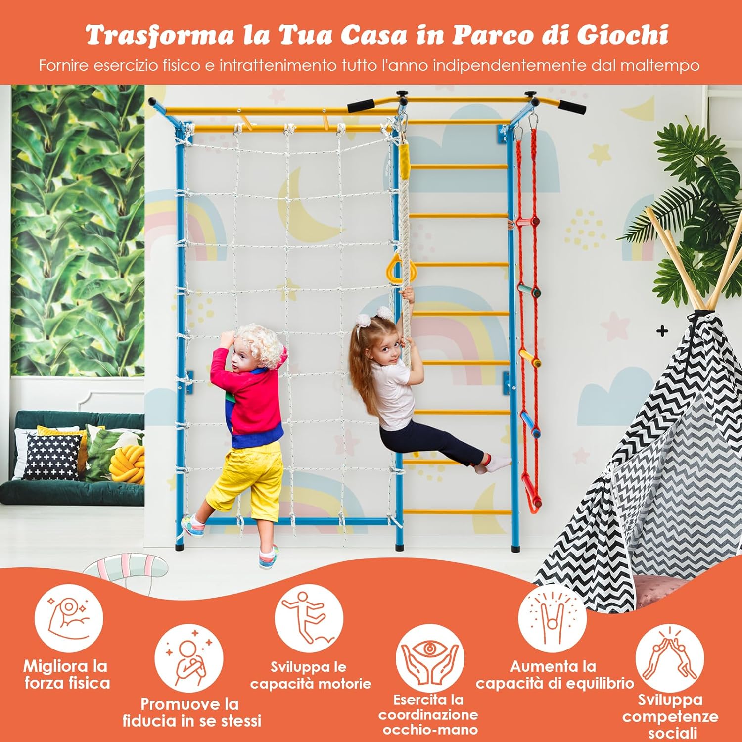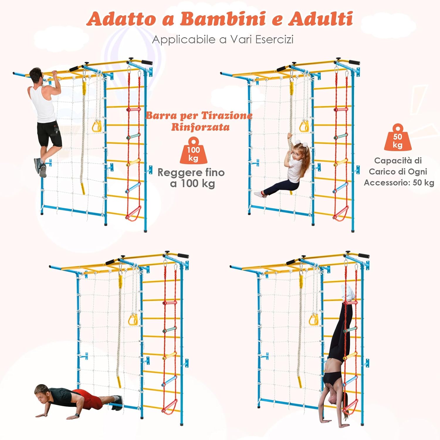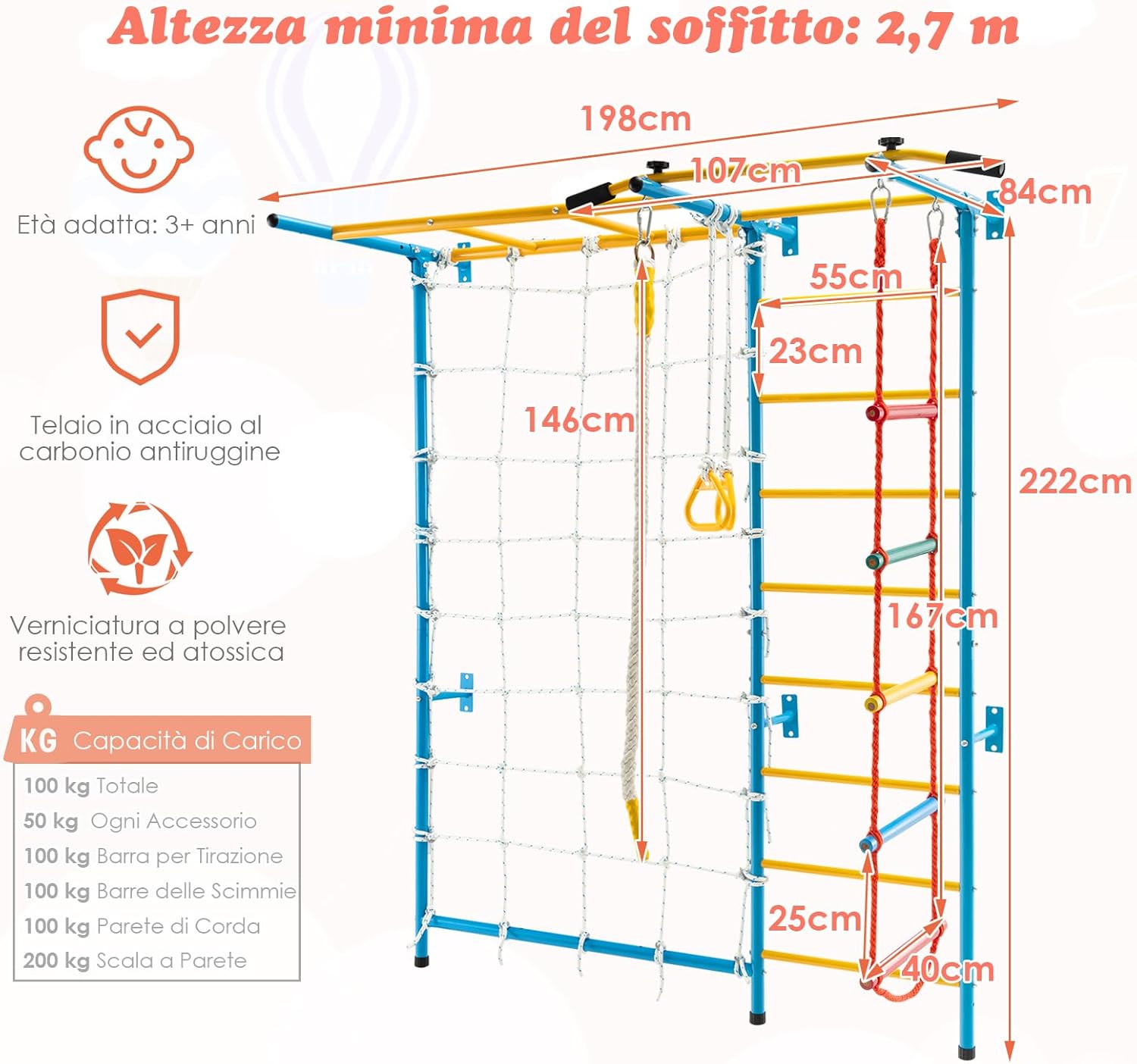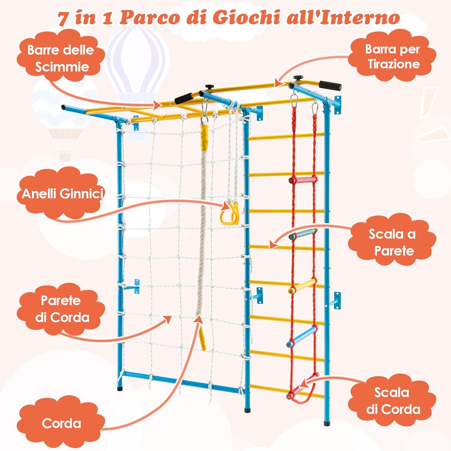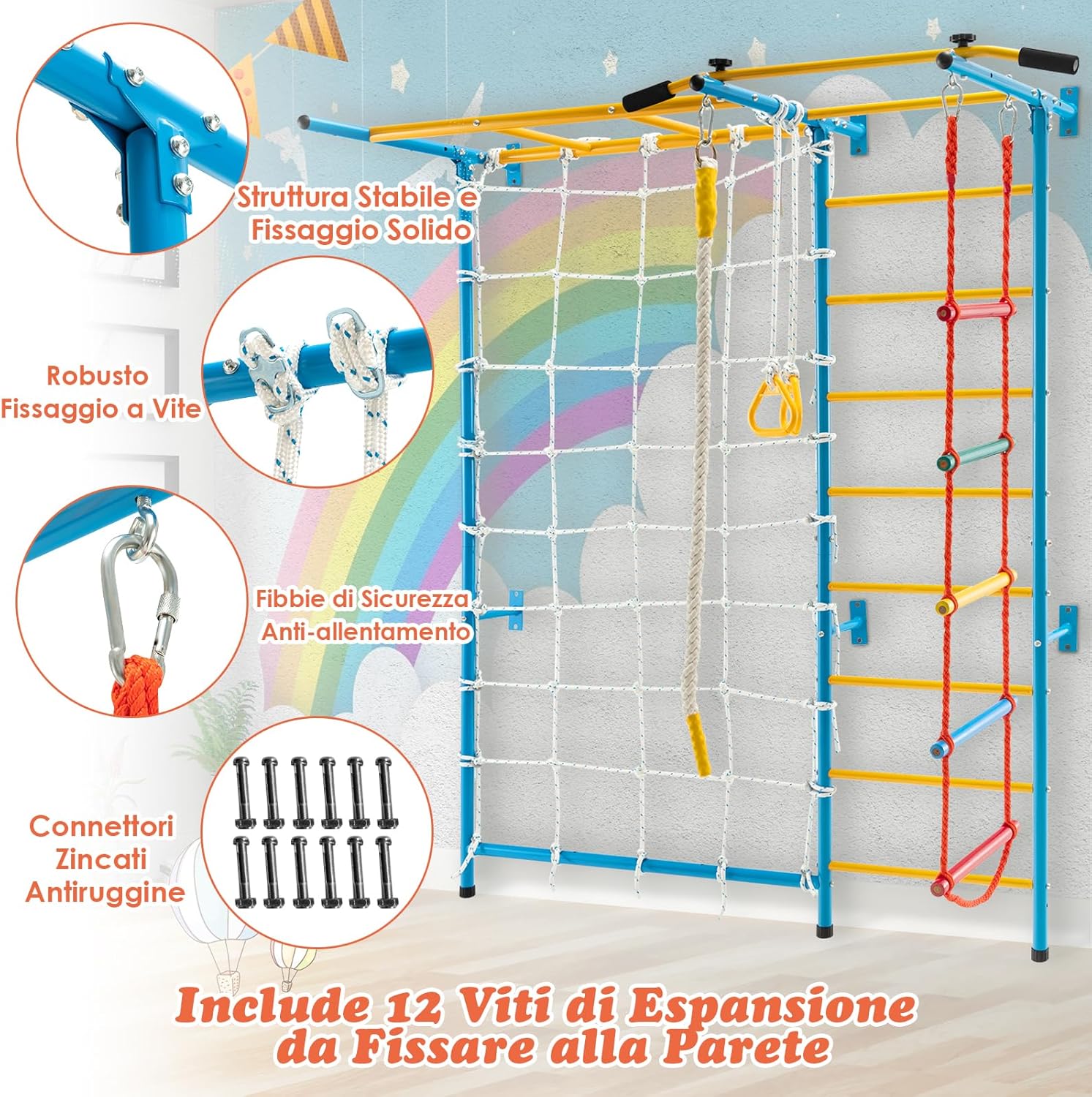 【Parco Giochi da Interno Completo 7 in 1】Questa palestra da interno è progettata con scala a muro, barra di trazione, scala di corda, parete di corda, struttura per arrampicata e anelli ginnici, che offrono molteplici attività come arrampicarsi, dondolarsi e penzolare. Questa palestra da interno è adatta ai bambini dai 3 anni in su. 【Offre Esercizio e Divertimento per Tutto l'anno】Grazie a questo parco giochi da casa, il maltempo e altre condizioni ambientali non saranno più un ostacolo allo sviluppo e all'esercizio dei vostri bambini. Questo parco giochi domestico è costruito per migliorare la forma fisica e esercitare la coordinazione del corpo. 【Montaggio Facile e Fissaggio Sicuro】Questo attrezzo da palestra per bambini è facile da montare seguendo le istruzioni passo dopo passo. Il telaio deve essere fissato a una parete e le 12 viti a espansione sono incluse nella confezione per un fissaggio comodo e solido. Grazie ai colori vivaci, questo attrezzo sarà un'ottima aggiunta a casa o all'asilo nido. 【Materiali Durevoli e Struttura Sicura】Il telaio è realizzato con tubi in acciaio al carbonio e le scale a corda sono in olmo, per garantire un'elevata capacità di carico e una durata prolungata. La barra di trazione è dotata di maniglie imbottite in EVA per aumentare l'attrito e il comfort. I cuscinetti per i piedi sul fondo proteggono il pavimento dai graffi. 【Superficie Antiruggine e Facile da Pulire】 La superficie dei tubi è trattata con vernice a polvere, ecologica e innocua per la salute dei bambini. Gli altri accessori in acciaio al carbonio sono zincati per una migliore resistenza all'usura e alla ruggine. Per la pulizia regolare è sufficiente l’uso di un panno umido.