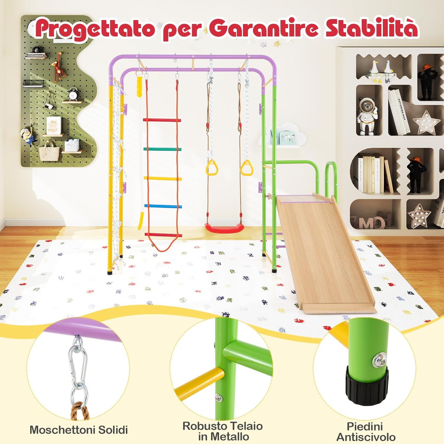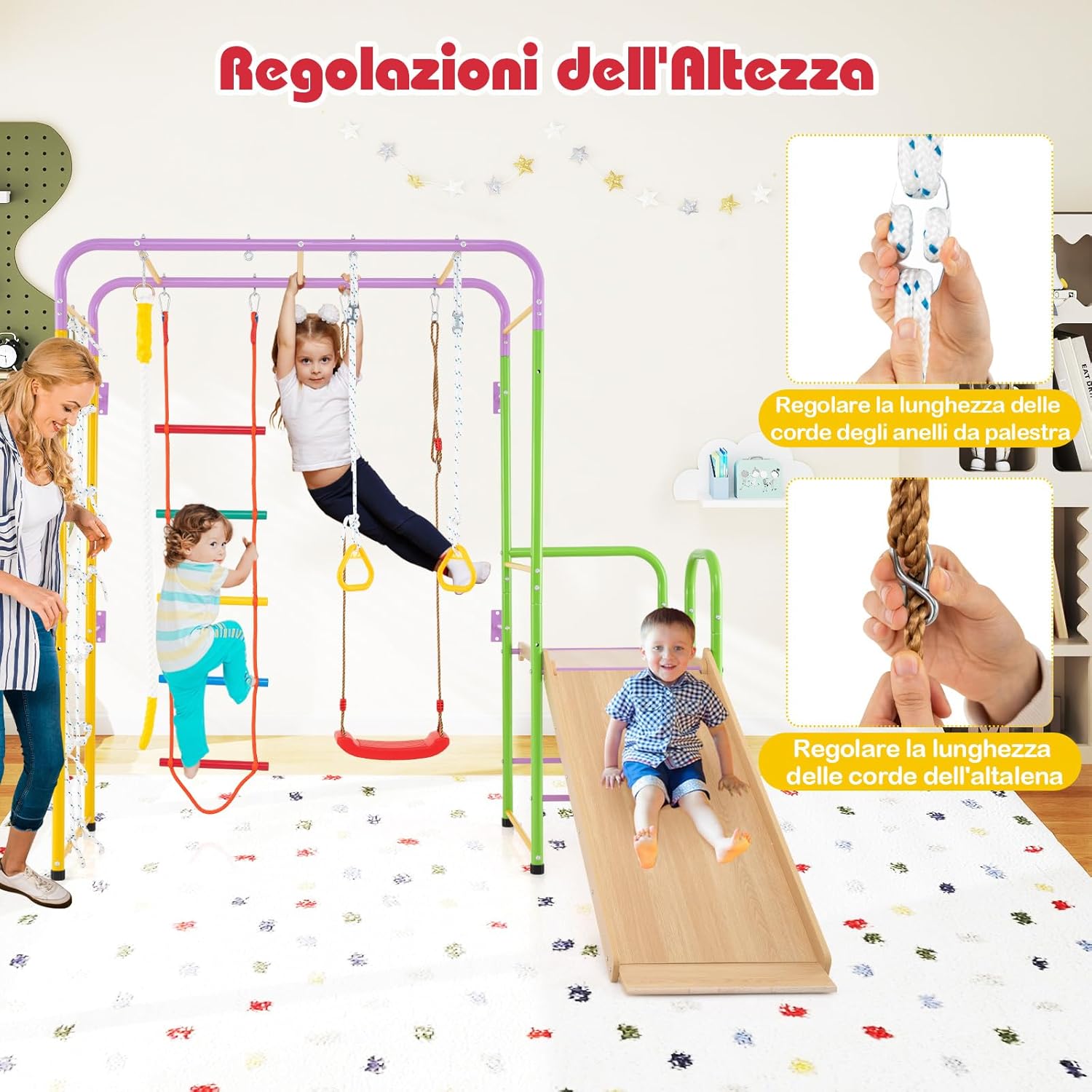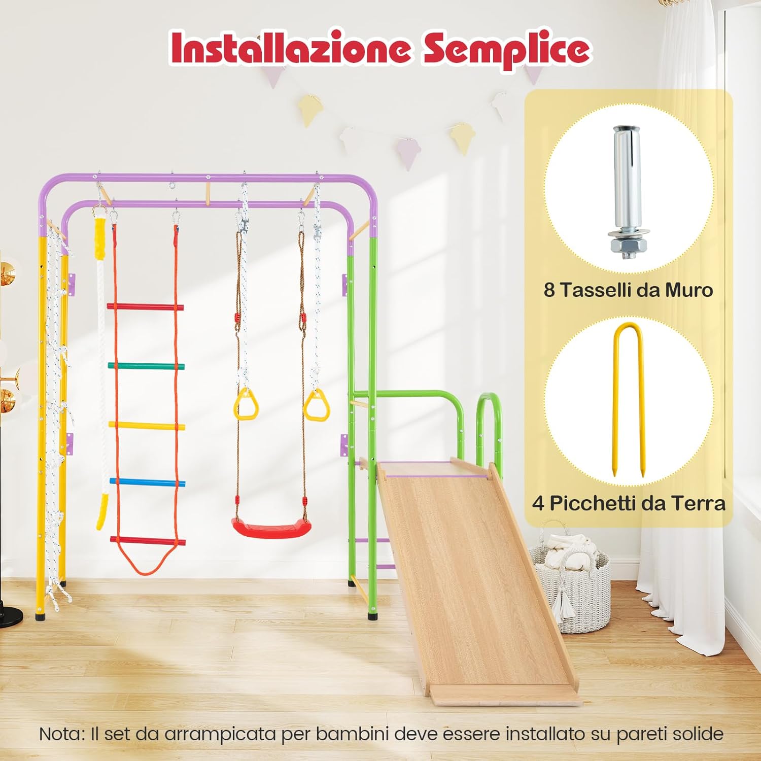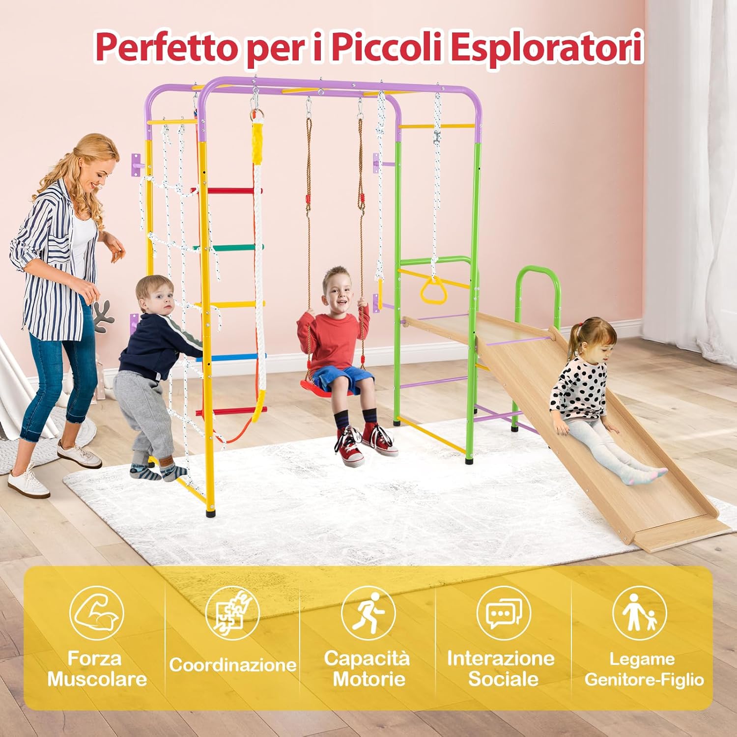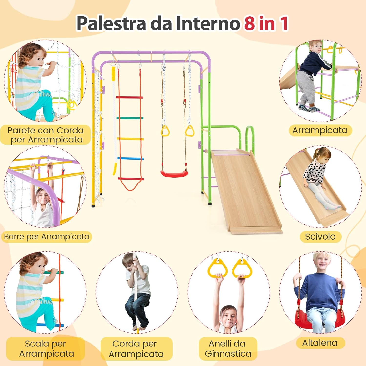 【 8 in 1 Set da Arrampicata per Bambini】Questo set da arrampicata include una parete di arrampicata con corda, barre di scimmia, scala di arrampicata, corda di arrampicata, anelli ginnici, altalena, scivolo e arrampicatore. Le varie aree di gioco offrono infinite ore di divertimento e sfide, mantenendo i tuoi piccoli impegnati nel gioco attivo. 【Design a Misura di Bambini】Per garantire un'esperienza di scivolamento sicura, lo scivolo è costituito da area di attesa, area di accelerazione, area di decelerazione e area di buffering. Inoltre, il parco giochi da interno ti consente di regolare la lunghezza delle corde degli anelli ginnici e degli altalena per adattarsi ai bambini di varie altezze. 【Progettato per la Stabilità】Costruito con una robusta struttura in metallo, questo set da arrampicata 8-in-1 promette durata e robustezza. I cuscinetti antiscivolo migliorano la stabilità. Inoltre, puoi fissare l'ancoraggio a parete e i picchetti come richiesto, che sono equipaggiati per offrire maggiore stabilità. 【La Sicurezza è la Priorità】Questo set da arrampicata presenta bordi arrotondati e una superficie priva di bave per proteggere la pelle delicata del tuo bambino. Inoltre, i moschettoni pesanti vantano attacchi sicuri, creando un ambiente più sicuro per i piccoli esploratori per arrampicare, oscillare ed esplorare. 【Scelta Ideale per Bambini】Questo parco giochi da interno è un'opzione affidabile per bambini sopra i 3 anni. Non solo intrattiene, ma aiuta anche a sviluppare importanti forze muscolari dei bambini piccoli, coordinazione, interazioni sociali e rafforzare i legami tra genitori e figli.