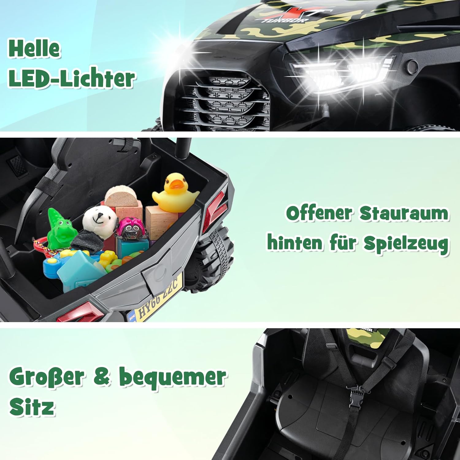 【Divertimento oltre la guida】 Trasforma ogni viaggio in un'avventura musicale con questo UTV per bambini. Non è solo un'auto per bambini, ma un media center su ruote, completo di clacson, musica, MP3, porte USB e connettività wireless per riprodurre la musica preferita dei bambini. 【2 opzioni di controllo】 Lascia che i tuoi bambini esplorino il mondo di gioco con il pedale, il volante e semplici pulsanti di controllo. Se necessario, i genitori possono anche controllare l'auto elettrica dei bambini con il telecomando e partecipare così al gioco. 【Design sicuro】La nostra auto elettrica è dotata di una cintura a 3 punti per una maggiore sicurezza. La funzione di avviamento lento e la sospensione posteriore rendono la guida più fluida e assorbono i dossi su varie superfici come strade asfaltate, pavimenti in cemento, strade in mattoni e pavimenti interni. 【Potenti motori doppi e batteria】 Questo veicolo elettrico con 2 potenti motori da 24 V è progettato per corse emozionanti e le 3 velocità si traducono in una curva di apprendimento piatta. Quando è completamente carica, la batteria offre 1-2 ore di riproduzione. 【Regalo meraviglioso per i bambini】 La nostra adorabile macchina per bambini ha standard elevati, che la rendono una scelta eccellente come regalo di compleanno o di Natale per bambini dai 3 agli 8 anni. Oltre ad essere divertente, promuove anche la coordinazione fisica del tuo bambino.