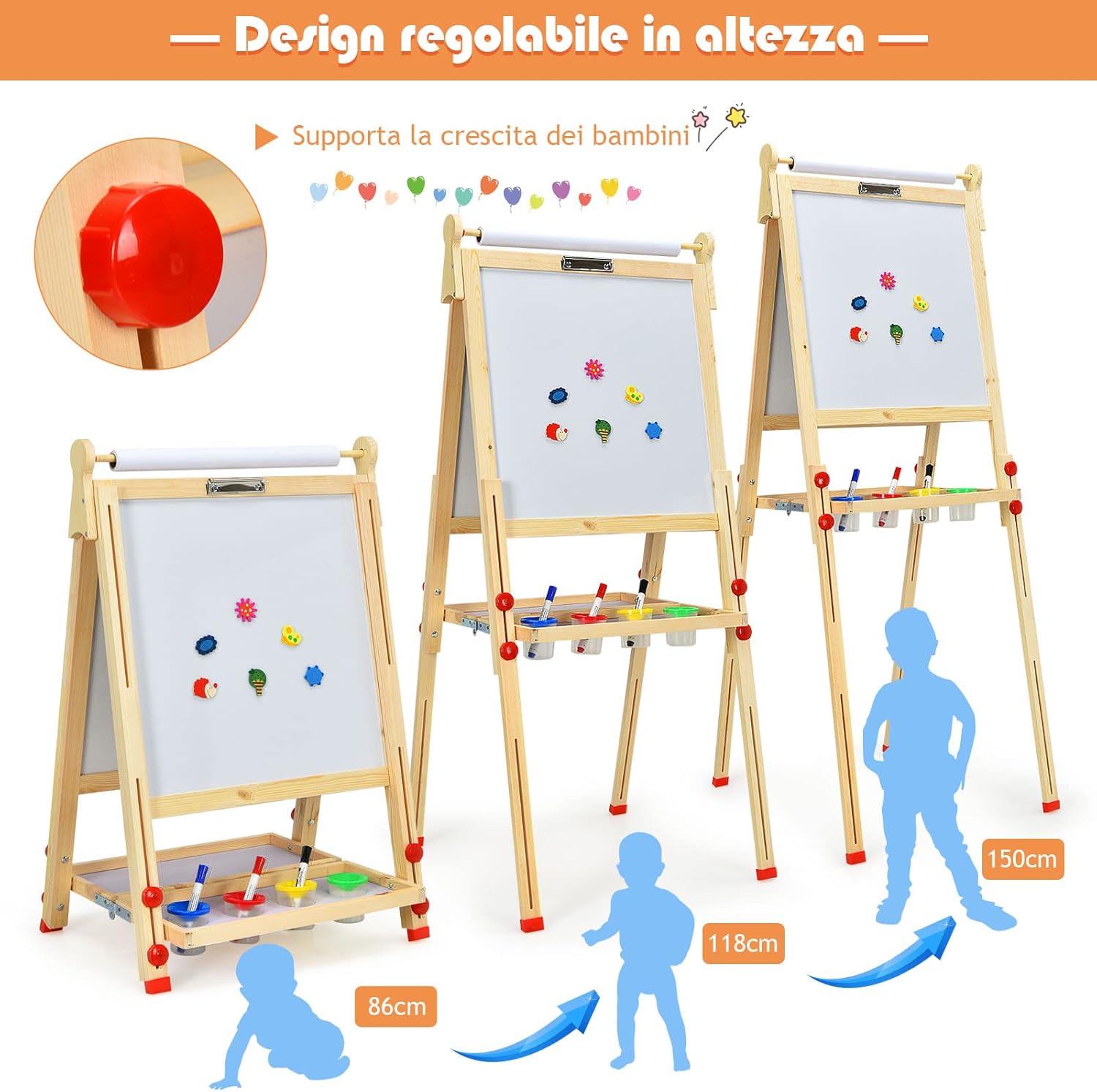 【Cavalletto 3 in 1 per Triplicare il Divertimento】Con un rotolo di carta in alto, la lavagna nera da un lato e quella bianca dall’altro, questo cavalletto 3 in 1 crea più possibilità per disegnare, scrivere e dipingere in simultanea. Entrambi i lati sono magnetici e il foglio di carta si può fissare su entrambe le lavagne. 【Altezza Regolabile】Per offrire una comoda esperienza d’uso ai bambini, l’altezza del nostro cavalletto si può regolare tra 87 e 150 cm in base alla loro statura. Inoltre, questo cavalletto regolabile è l’alleato perfetto che li accompagnerà nella crescita. 【Design a Prova di Bambino】Il vassoio spazioso a metà del cavalletto non solo aiuta a tenere gli accessori a portata di mano, ma facilita la sistemazione dopo aver giocato. Inoltre, il cavalletto ha un design pieghevole ed è molto comodo da conservare e trasportare. 【Struttura Resistente】Realizzato in legno di pino di alta qualità, questo cavalletto artistico per bambini ha la struttura resistente, stabile e durevole. La struttura triangolare lo mantiene stabile in verticale senza oscillare mentre i piedini antiscivolo aumentano la stabilità. 【Tanti Accessori】Questo cavalletto multiuso include 1 rotolo di carta da disegno, 4 contenitori, 1 cancellino, 12 gessi, 1 copri gesso, 1 panno, 6 calamite, 3 pennarelli cancellabili, 6 adesivi magnetici di cartoni animati, 1 righello magnetico, 1 set magnetico di lettere e 1 set magnetico di numeri. Inutile dire che questo cavalletto artistico con gli accessori completi creerà ricordi memorabili dell’infanzia.