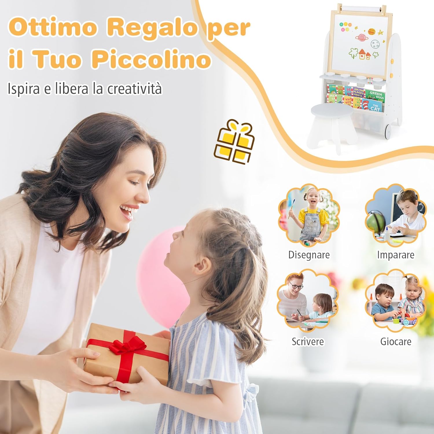 【Design Multifunzionale 4-in-1】Questo set innovativo include una lavagna per bambini cavalletto artistico doppio lato—lavagna magnetica da un lato e lavagna nera dall'altro—insieme a un rotolo di carta per disegno e un tavolo da studio. 【Altezza Regolabile e Facile Mobilità】Con un'altezza regolabile da 92 cm a 105 cm, questo cavalletto regolabile può accompagnare la crescita del tuo bambino. Dotato di ruote, il cavalletto può essere facilmente spostato in casa, garantendo che il divertimento creativo sia sempre a portata di mano. 【Comodo Stoccaggio】Questo tavolo attività per bambini è progettato con ampi spazi di stoccaggio, inclusi bicchieri per vernice, scaffali per libri e uno scaffale inferiore, mantenendo tutti i materiali artistici organizzati e facilmente accessibili. 【Caratteristiche Adatte ai Bambini】Questo cavalletto artistico per bambini è costruito con una struttura stabile a forma di A, fornendo una piattaforma sicura per i giovani artisti. Inoltre, gli angoli arrotondati evitano lesioni durante l'uso. 【Ottimo Regalo per il Tuo Piccolo】Perfetto per disegnare, scrivere, imparare, giocare e varie attività, questa lavagna per bambini con cavalletto e sgabello aiuta a ispirare e liberare la creatività dei bambini. Il set include un rotolo di carta, 5 gessetti, una gomma e 4 bicchieri per vernice.