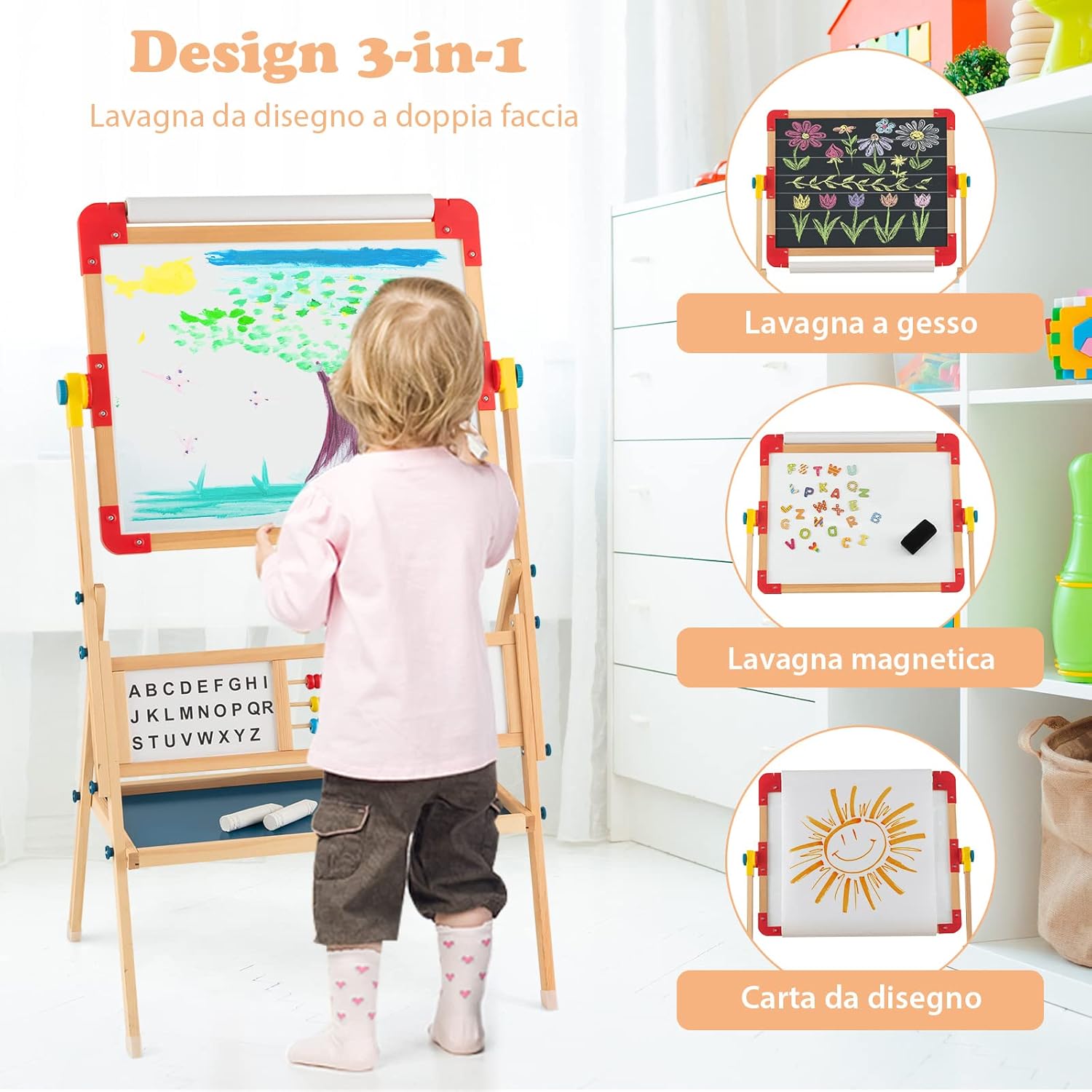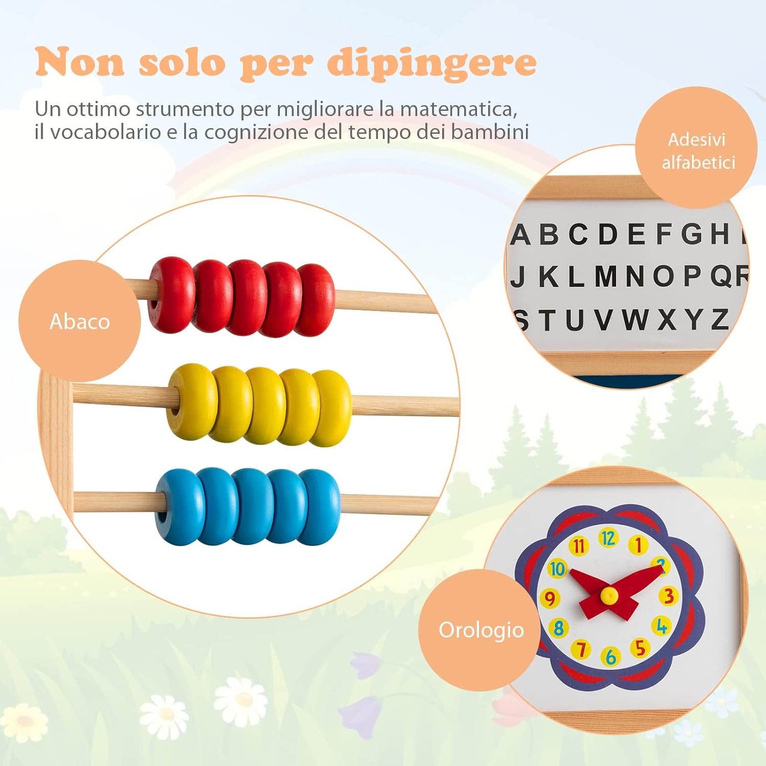 COSTWAY Lavagna Magnetica per Bambini 3 in 1, Cavalletto per Bambini con Rotolo di Carta, Abaco Educativo, Orologio e Alfabeto, Girevole a 360°, Bifacciale, 62 x 45 x 118 cm