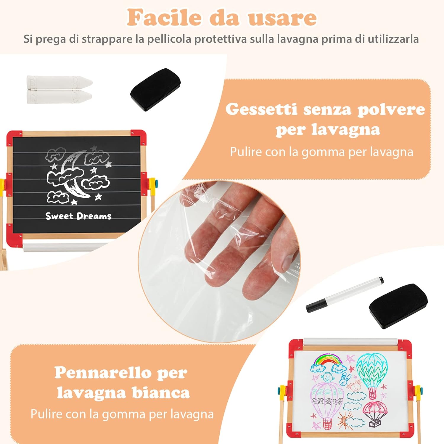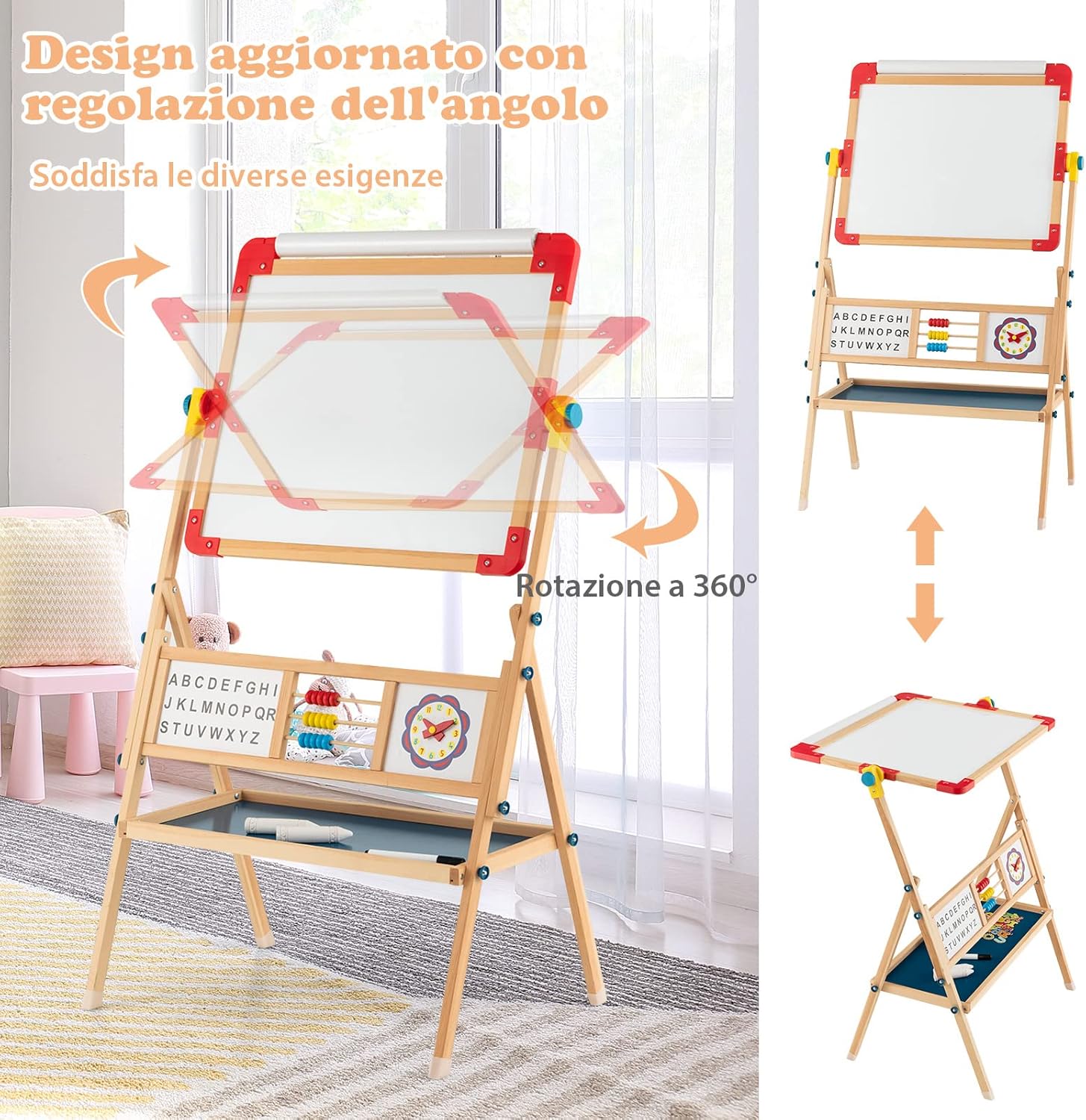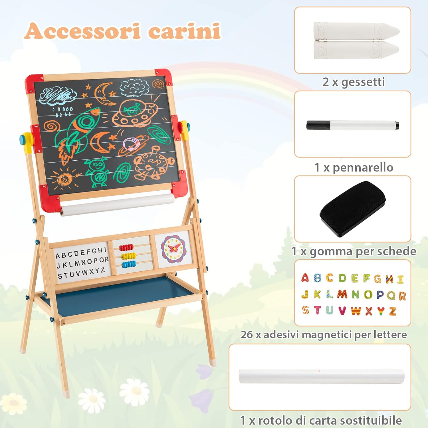 【3 in 1】Questo cavalletto artistico in legno permette ai bambini di scrivere e disegnare in 3 aree diverse. I gessetti senza polvere scrivono sulla lavagna, mentre il pennarello scrive sulla lavagna magnetica. Inoltre, è possibile appendere il rullo di carta per aumentare lo spazio a disposizione per creare. 【Lavagna da disegno ruotabile a 360°】Il tavolo da disegno ruotabile a 360° può essere fissato liberamente in qualsiasi posizione in base alle diverse esigenze. Se si fissa il tavolo da disegno a livello orizzontale, può fungere da tavolo artistico o da puzzle, mentre il vassoio inferiore può contenere le necessità dei bambini. 【Materiali di alta qualità】La struttura è realizzata in legno di pino naturale per garantire durata e robustezza. La solida struttura triangolare e i 4 piedini antiscivolo garantiscono una stabilità complessiva. 【Regalo ideale per l’educazione precoce】Il cavalletto in legno per bambini include diverse aree educative, come l’abaco, l’orologio e l’alfabeto, che favoriscono l’educazione precoce. Queste aree di apprendimento coltivano nei bambini la conoscenza della matematica, dell’inglese e dell’arte. 【Accessori completi】Per migliorare l’esperienza d’uso, sono inclusi accessori completi. È possibile sostituire il rullo di carta per un divertimento senza limiti. Inoltre, il cancellino magnetico può pulire entrambe le facciate della lavagna per una maggiore comodità.