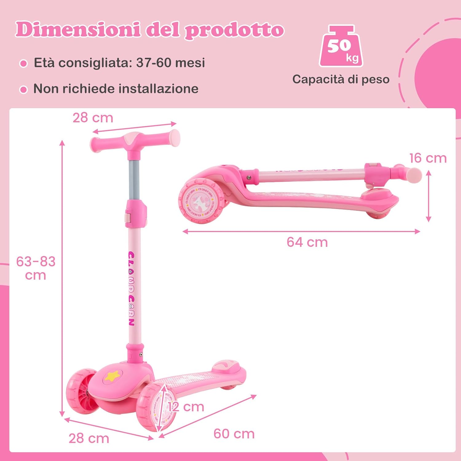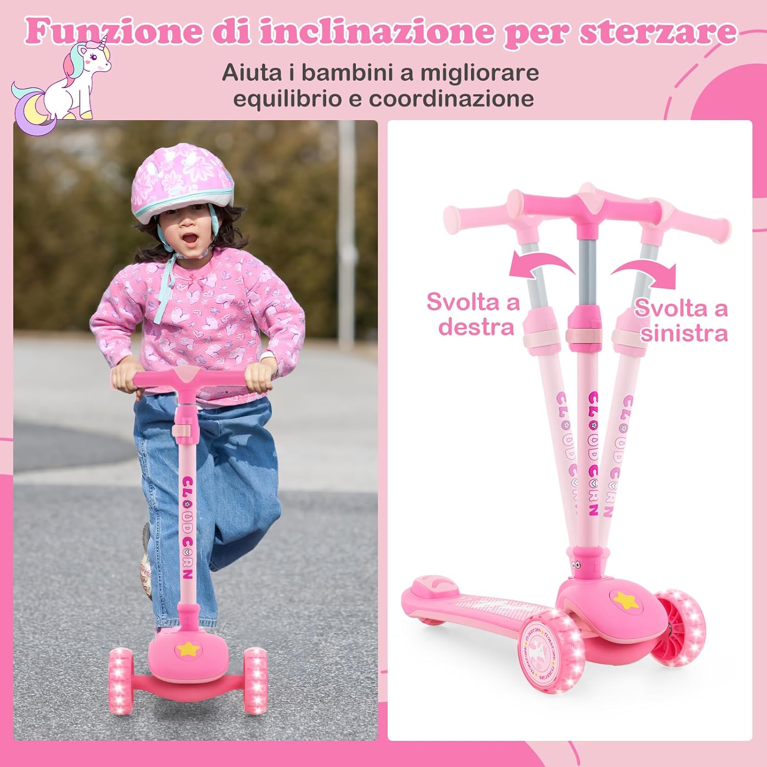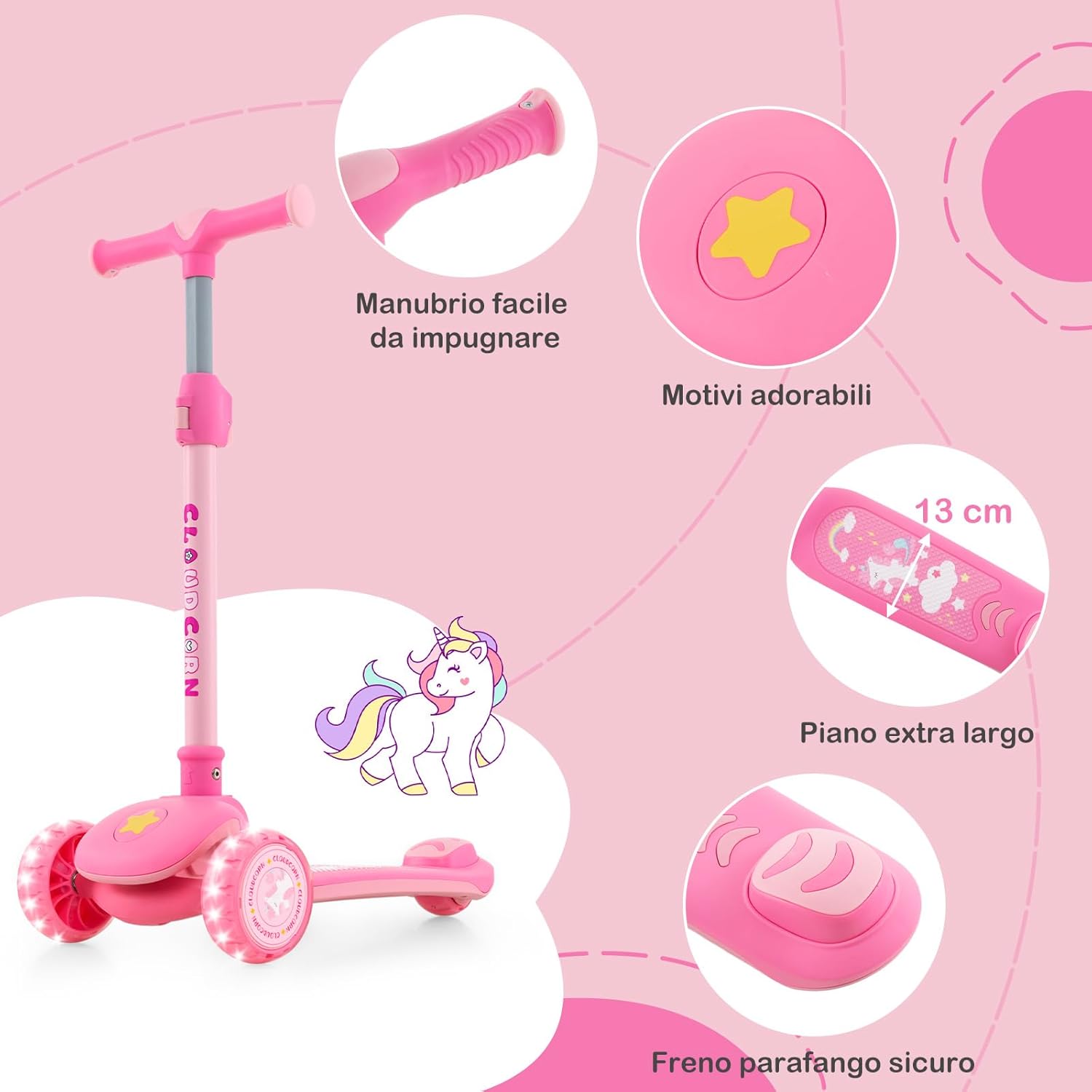 【Altezza Regolabile】Questo monopattino pieghevole vanta un'altezza regolabile da 63 a 83 cm, quindi è adatto ai bambini di 37-60 mesi. L'aggiustamento dell'altezza è controllato da un doppio sistema di blocco che evita che i bambini lo regolino accidentalmente. 【Ruote LED Luminose in PU】Dotate di luci a LED senza batteria, le ruote si illuminano con ogni rotolamento per una migliore visibilità. Più veloce è la velocità, più luminosa è la luce. Inoltre, le ruote (diametro 120 mm) in PU sono assorbenti agli urti e antiscivolo, si adattano bene a diversi tipi di strade, come strade in asfalto, in cemento e pavimento in legno. 【Funzione di Sterzata】I bambini sono in grado di girare inclinando il corpo invece di girare il manubrio, il che è favorevole allo sviluppo dell'equilibrio, della coordinazione e della fiducia allo se stesso. Inoltre, dispone di cuscinetti ABEC-7. 【Progettato Appositamente per i Piccoli】Con un manubrio facile da afferrare, questo monopattino pieghevole per bambini garantisce una presa confortevole. Inoltre, il piano extra largo da 13 cm con un freno posteriore sicuro consente un giro morbido e un arresto rapido. 【Design Pieghevole e Leggero】Questo monopattino per bambini viene fornito con un assemblaggio completo per una grande comodità. Con un semplice tiro e spinta, si può piegare rapidamente per un risparmio di spazio. Inoltre, è facile per i bambini portare il monopattino facilmente grazie al suo design leggero.