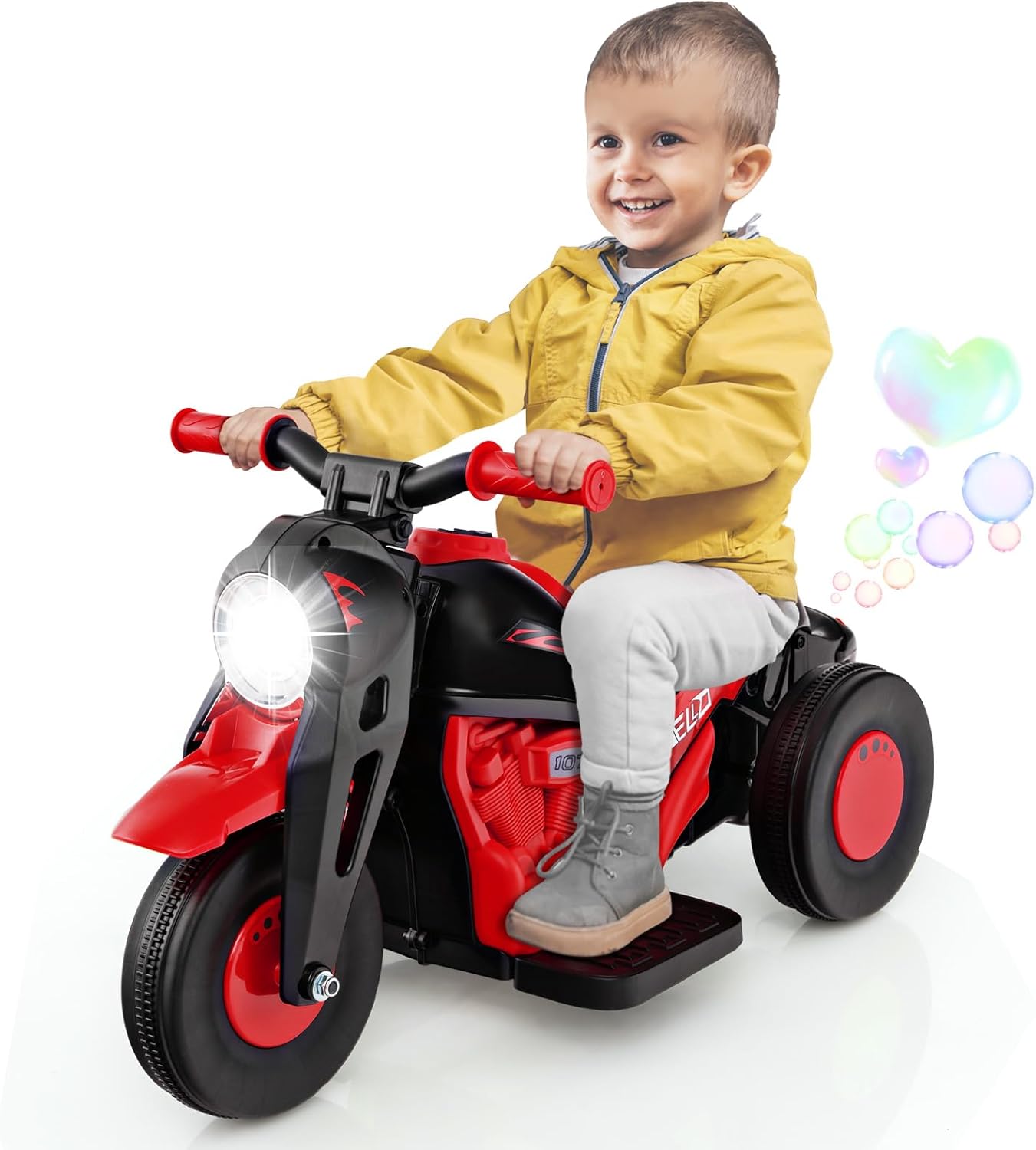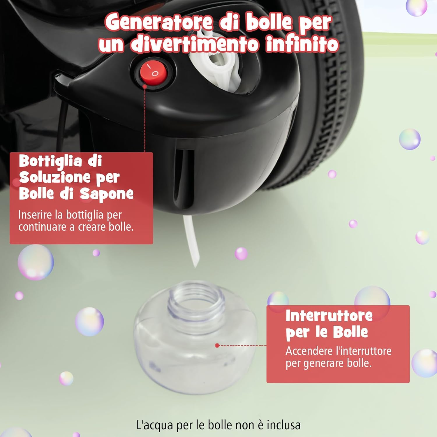 【Creatore di Bolle per un Divertimento】La nostra auto a bolle è facile da usare, basta accendere l'interruttore delle bolle per generare bolle per oltre 20 minuti e divertire i bambini durante la guida. Suggerimento amichevole: l'acqua per le bolle non è inclusa. 【Auto Multifunzionale】Il pannello di controllo di questo motore elettrico è dotato di un pulsante musicale per divertimento durante il gioco. Inoltre, l'auto a bolle è dotata di fari LED illuminati per il gioco sicuro durante la notte ed è dotata di un clacson per avvertire i pedoni. 【Facile da Usare】Goditi un'ottima esperienza di guida con un'operatività semplice. Premi semplicemente il pedale per una facile partenza e premi l'interruttore per cambiare la direzione di guida, i tuoi bambini possono iniziare un divertente momento di guida con la funzione di sterzata. 【Ruote Resistenti e Solidi】Dotata di ruote in PP altamente resistenti all'usura, questa bici elettrica per bambini è adatta a una vasta varietà di superfici stradali come pavimenti in legno, strade di mattoni, strade in cemento o strade asfaltate. 【Batteria Potente】Dotata di una batteria ricaricabile da 6V 4,5Ah per un gioco duraturo, questo motore elettrico consente 1,5 ore di tempo di gioco per ogni carica e una capacità di 30 kg dopo 8-12 ore di ricarica. Ma fai attenzione, non caricare per più di 20 ore consecutive.